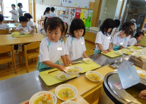 また、グリーンコープの安心安全な食材を使い「食べることは生きること」を培っていきます。手作りの給食を温かいうちにいただきます。食事は一生続くものです。ただ、美味しい給食をいただくだけではなく、日々の給食の配膳準備、食後のランチルームの掃除等を行い、また栽培活動、栄養士や保育士による食育活動、クッキングなど食を通して、子ども自ら積極的に「食」に関わります。