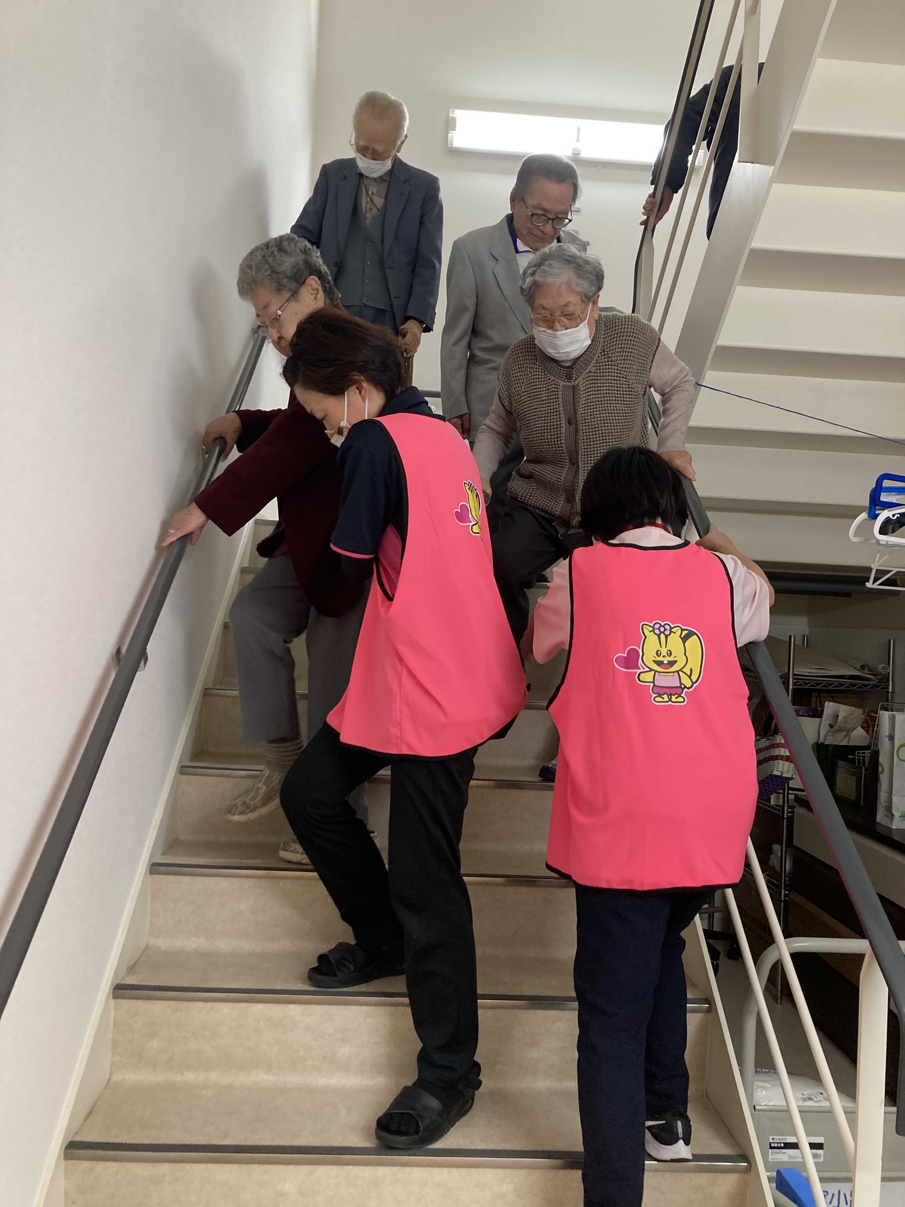 さ高住では、年に2回の避難訓練が義務づけられています。 今日の避難訓練は、外の非常階段を使っての避難を予定しておりましたが、雨が降り出してきて、急遽3階洗濯室からの出火に変更しました。 火事の時は、エレベーターが止まるようになっていますが、あれれ どなたかエレベーターで降りてきてる
