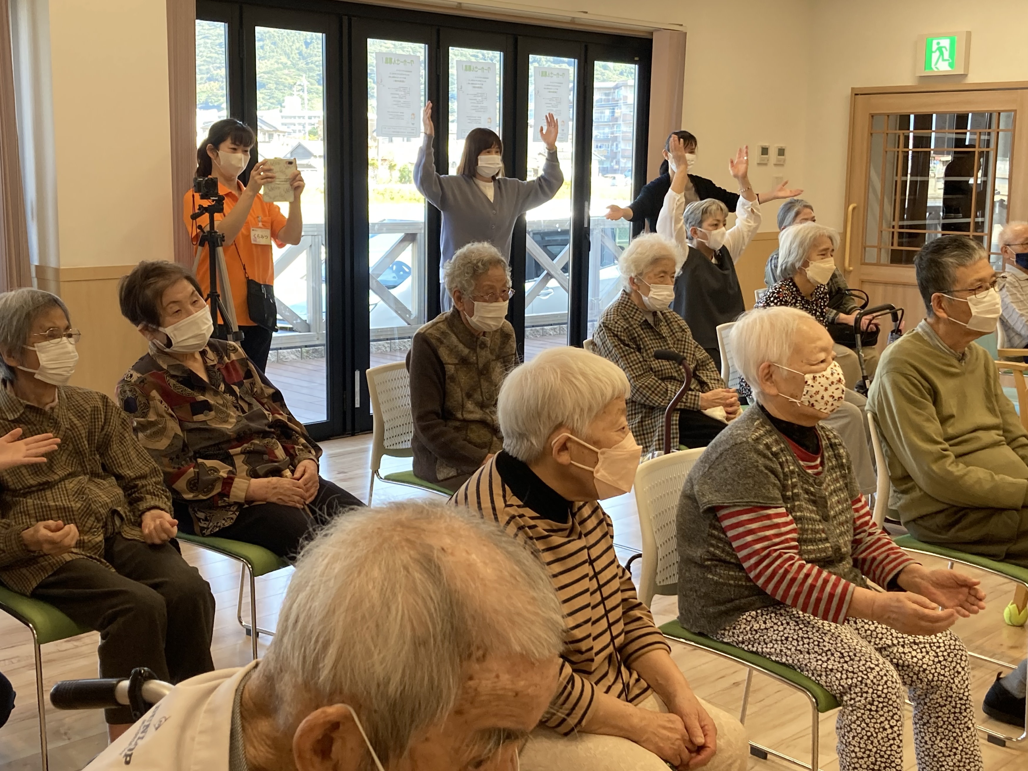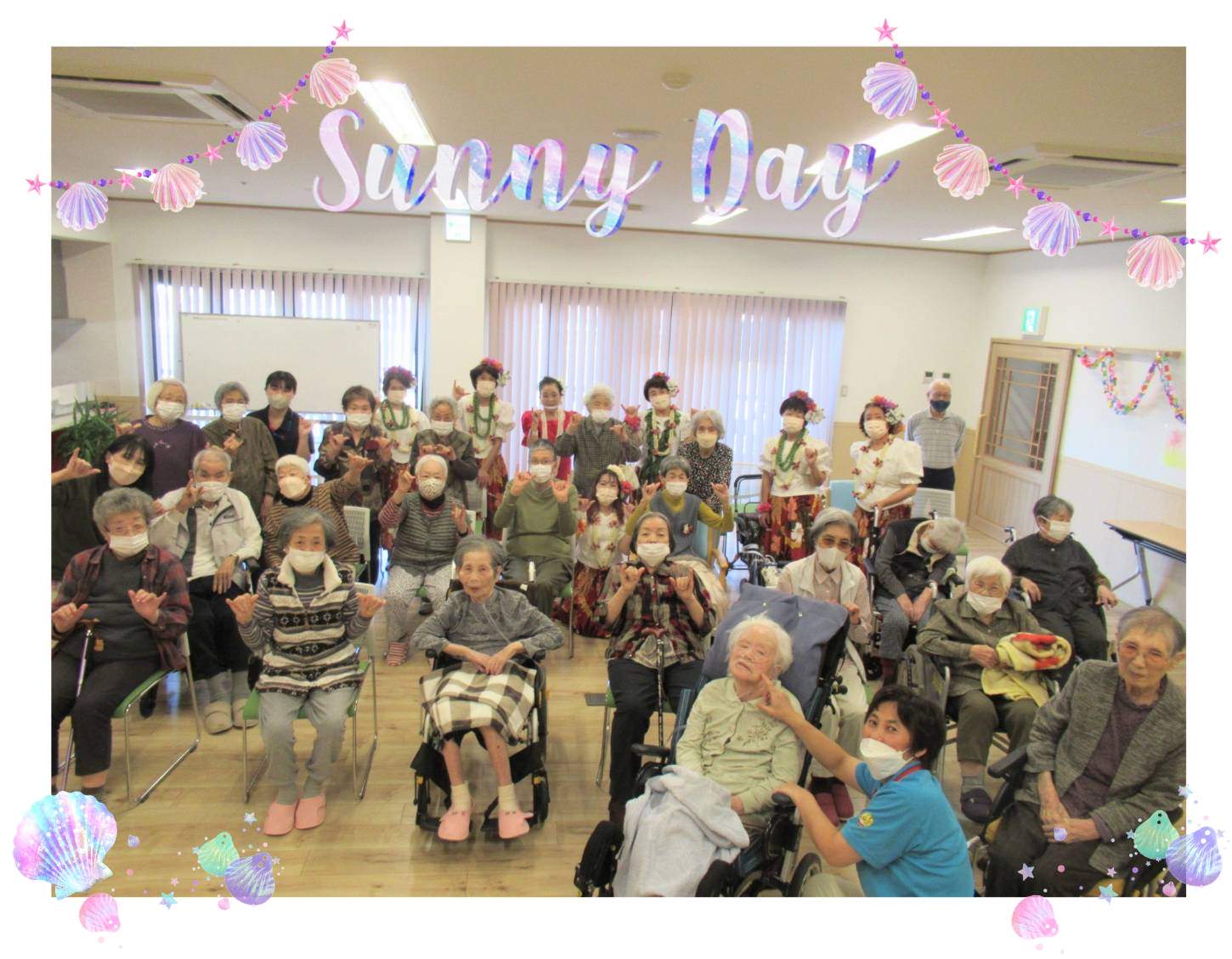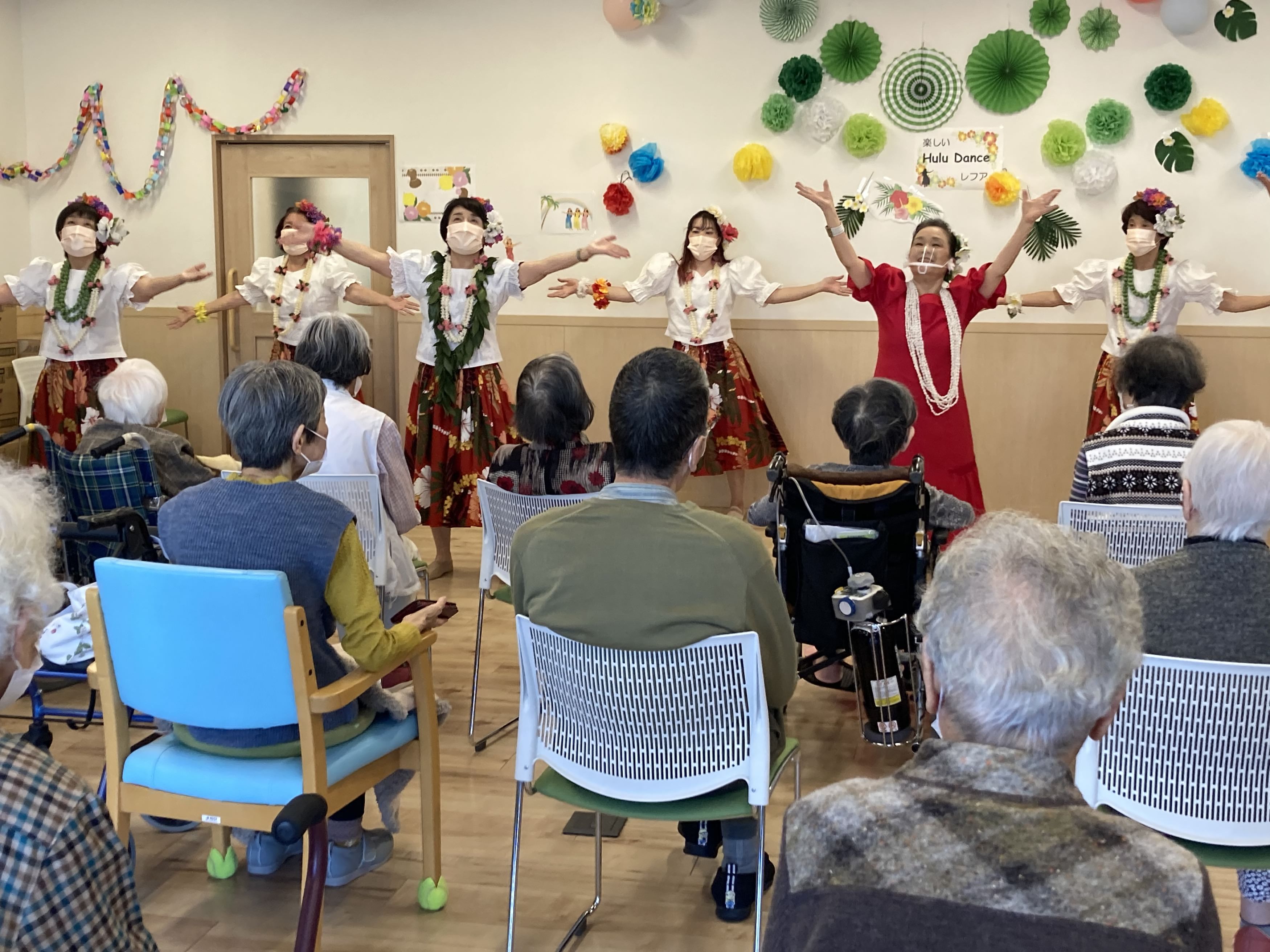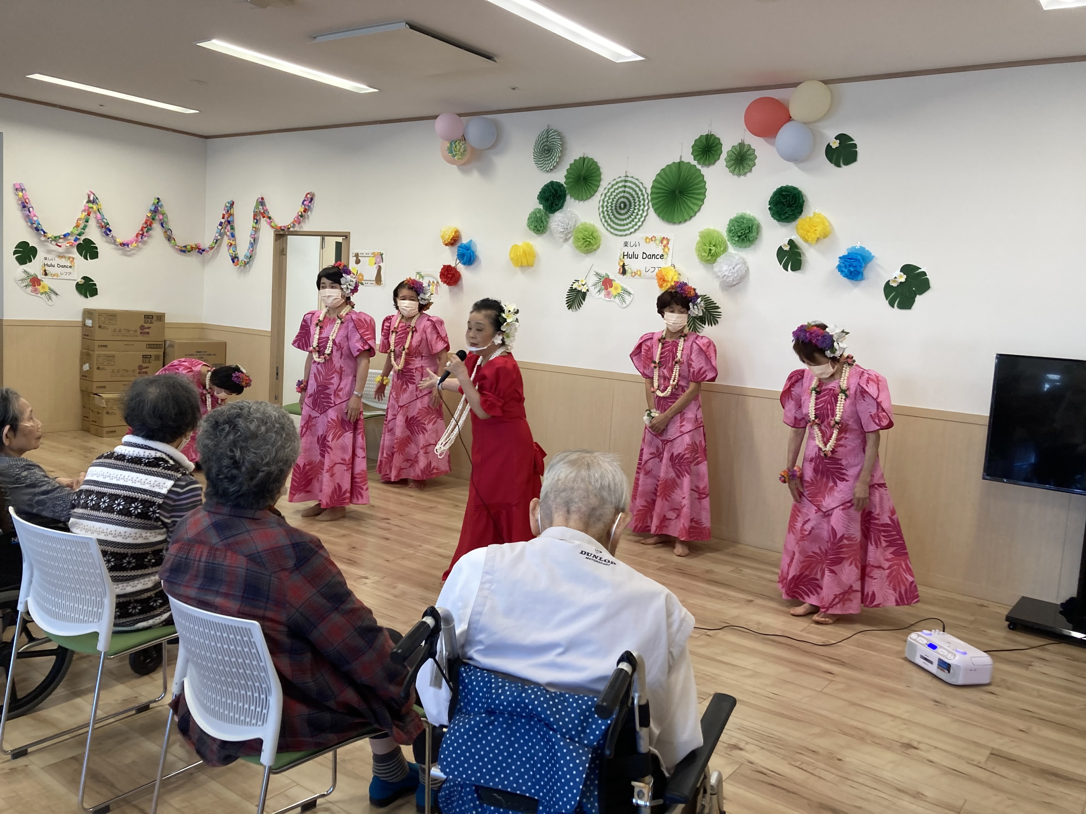 さ高住おひらきでは、毎朝10時に館内放送が入り、一階と三階でラジオ体操をしています♬ 今日は、ラジオ体操をやめてサロンでフラダンスを習いました。 南国