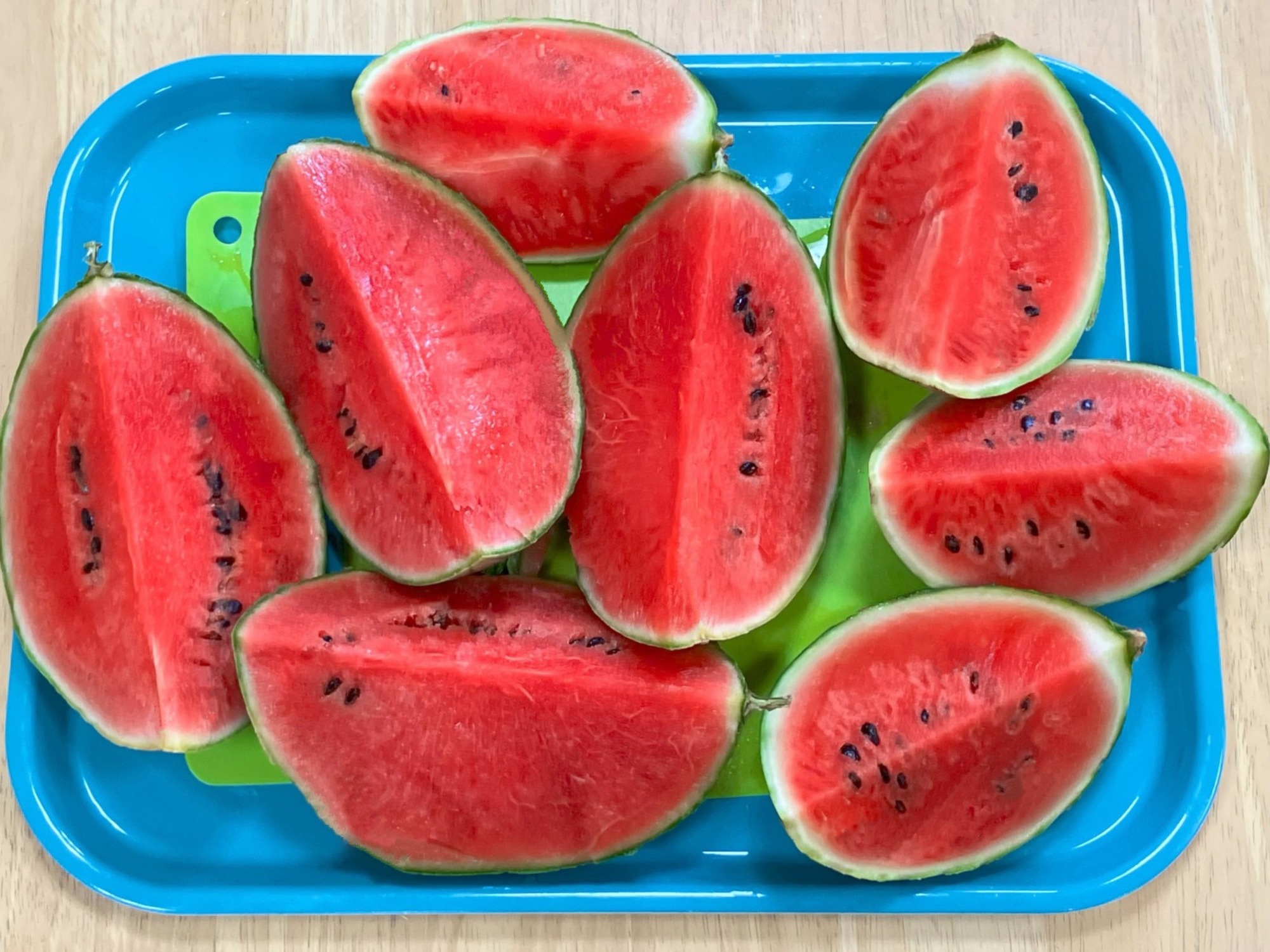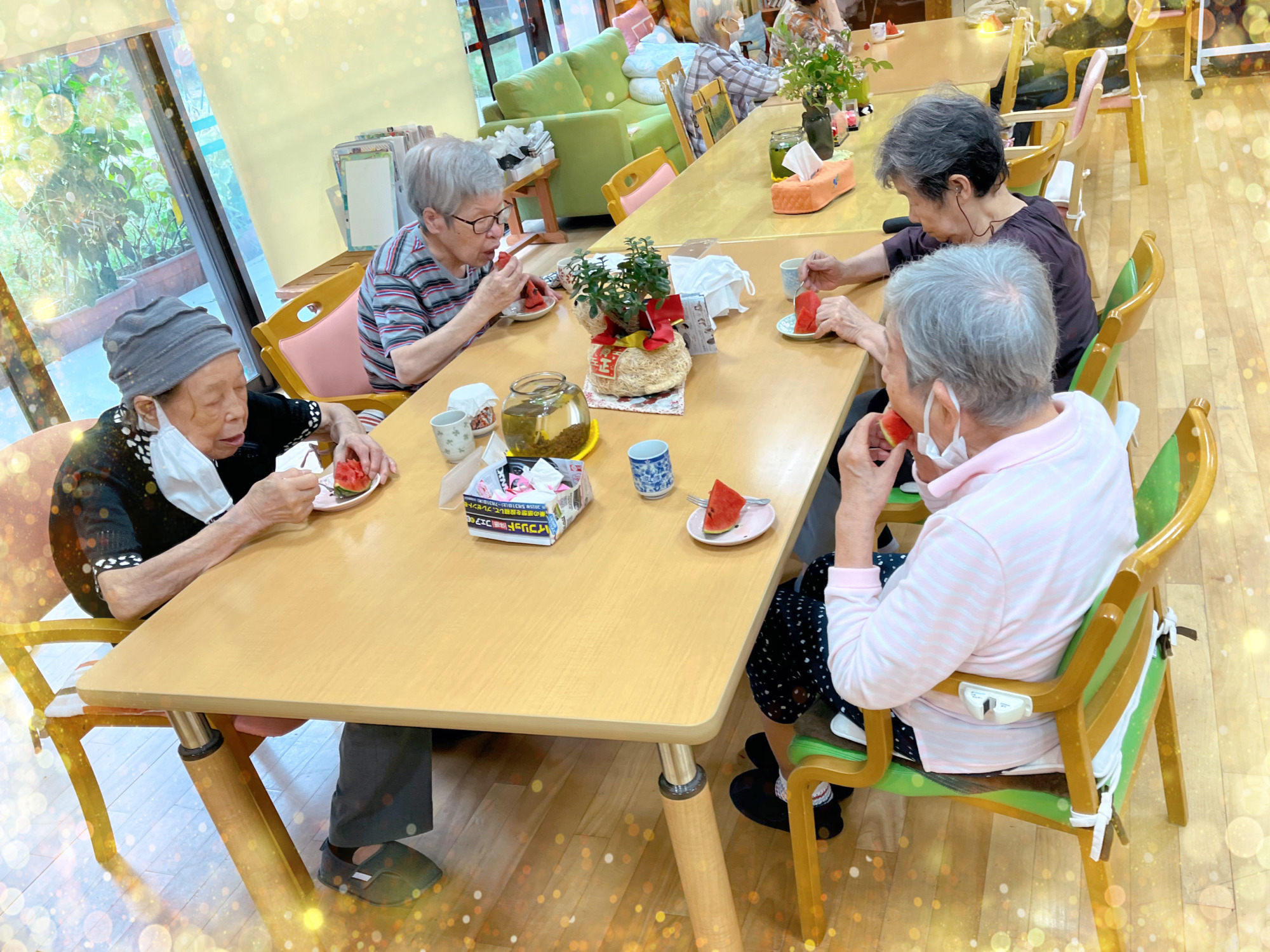 皆様とても美味しそうにおやつのスイカを食べていました。「甘くて美味しい!」「みずみずしい!」「庭で採れたスイカを食べて嬉しいです!」と満足されていました。