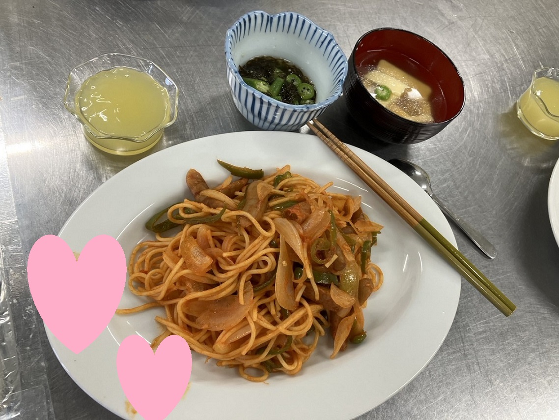 スパゲティナポリタン・コンソメスープ・オクラとモズクの酢の物・リンゴゼリー🍎