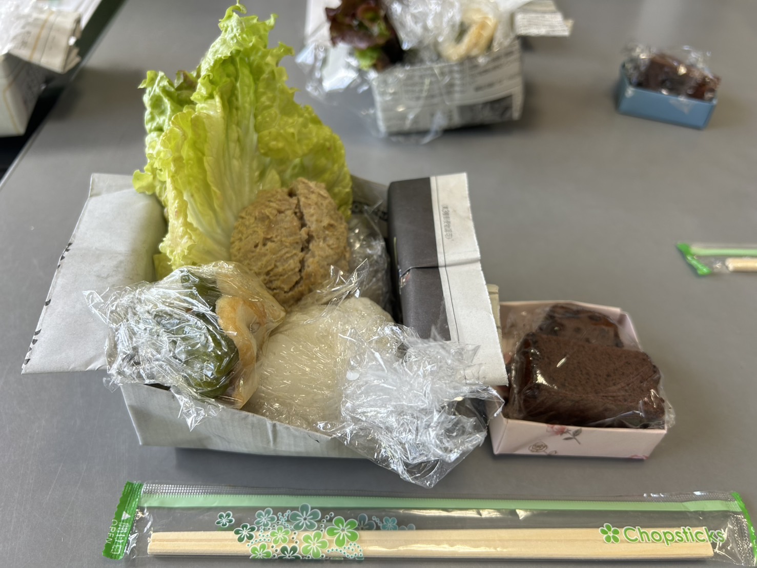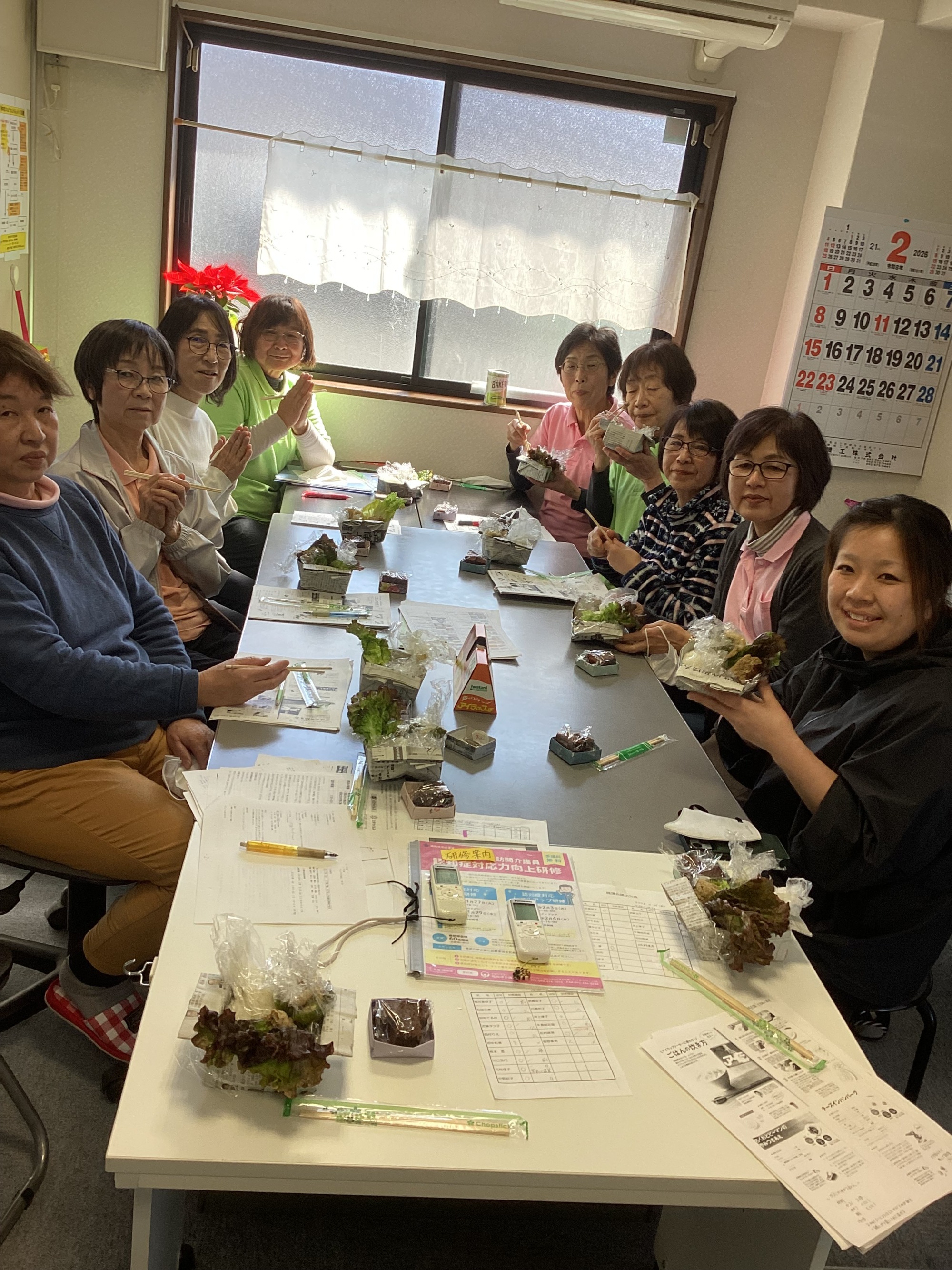 高密度ポリエチレンのポリ袋で作ったご飯やおかずの数々を試食し、器も新聞紙で折った箱に入っていて「うまく出来てるねぇ」などと話しながらの楽しい時間でした(^^)v