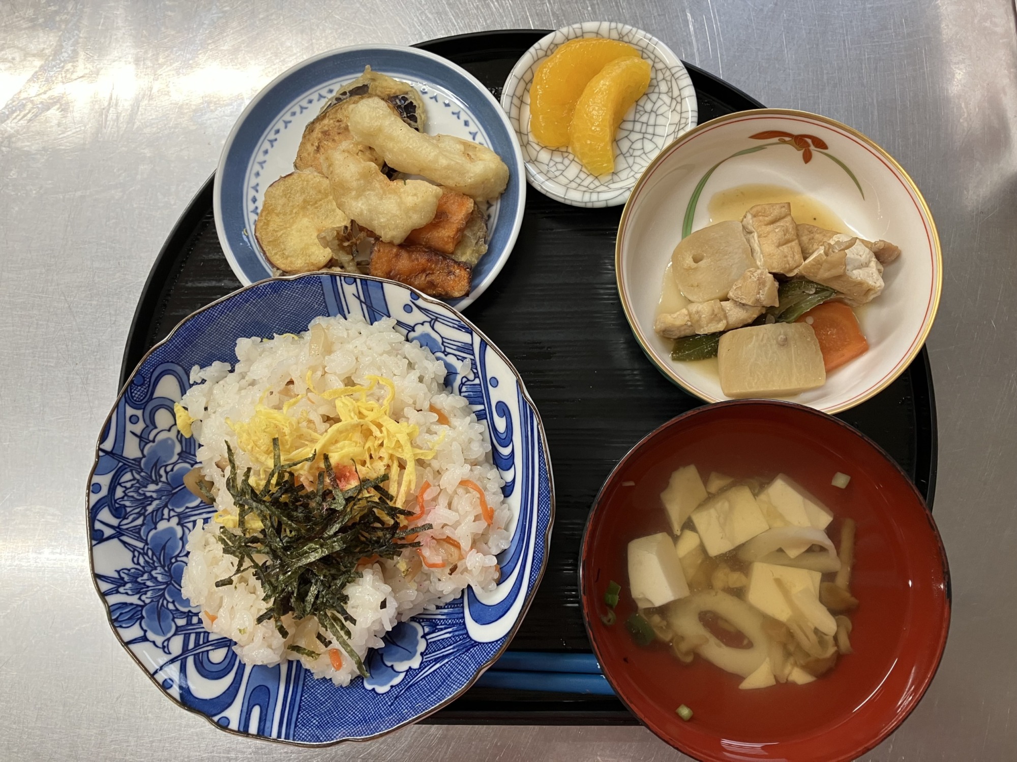 今日は、誕生会でした。特別な献立で、ちらし寿司、天ぷら、炊き合わせなど、スタッフ手作りの、ご馳走でお祝いしました。