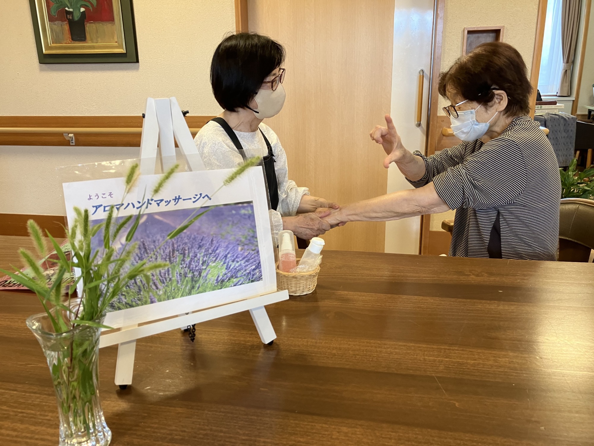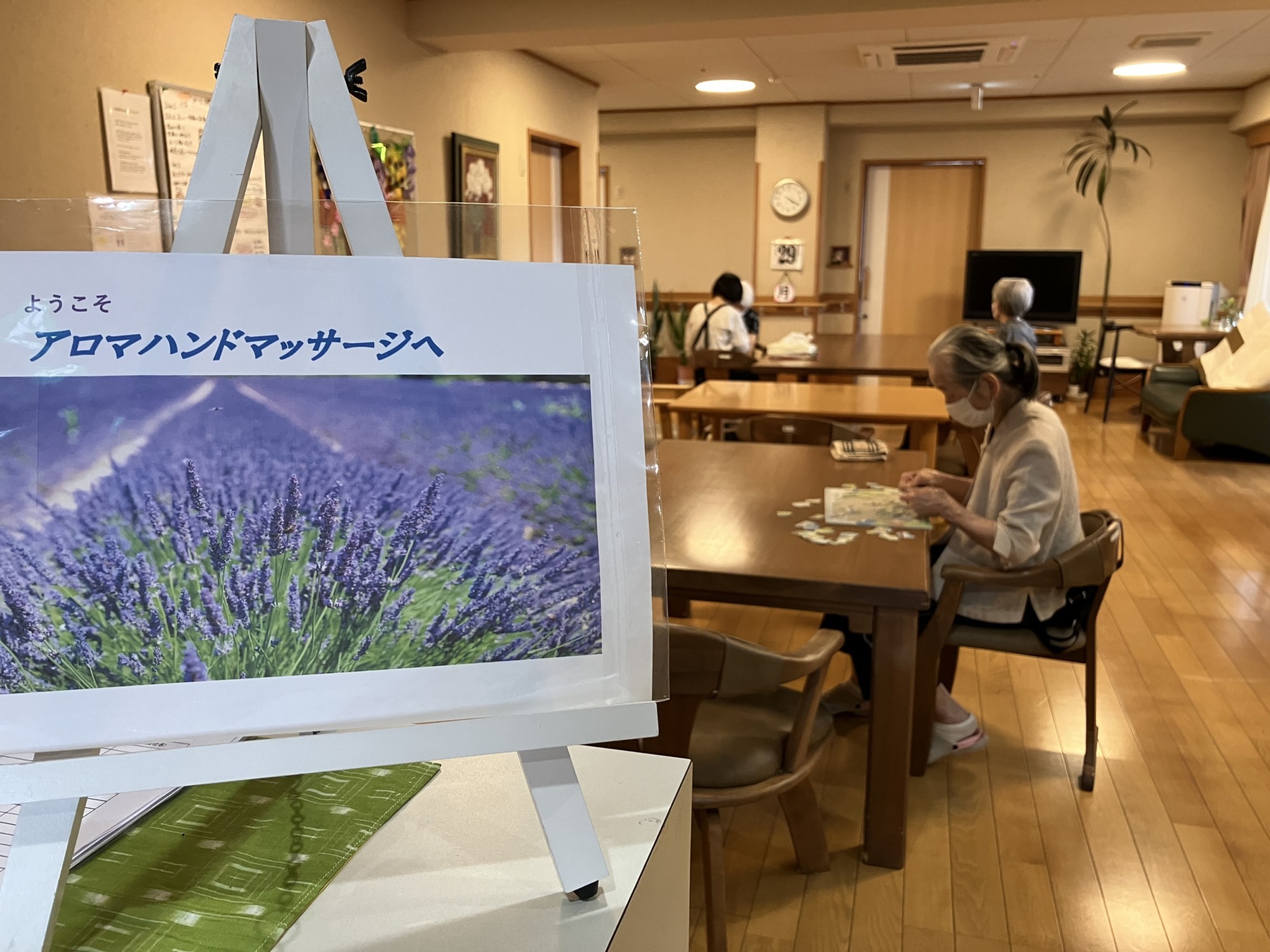 月に2回皆さんお待ちかねのアロマハンドマッサージ。 香りホンワカ心も緩んでしまいます。パズルをしながら順番待ちの方も。