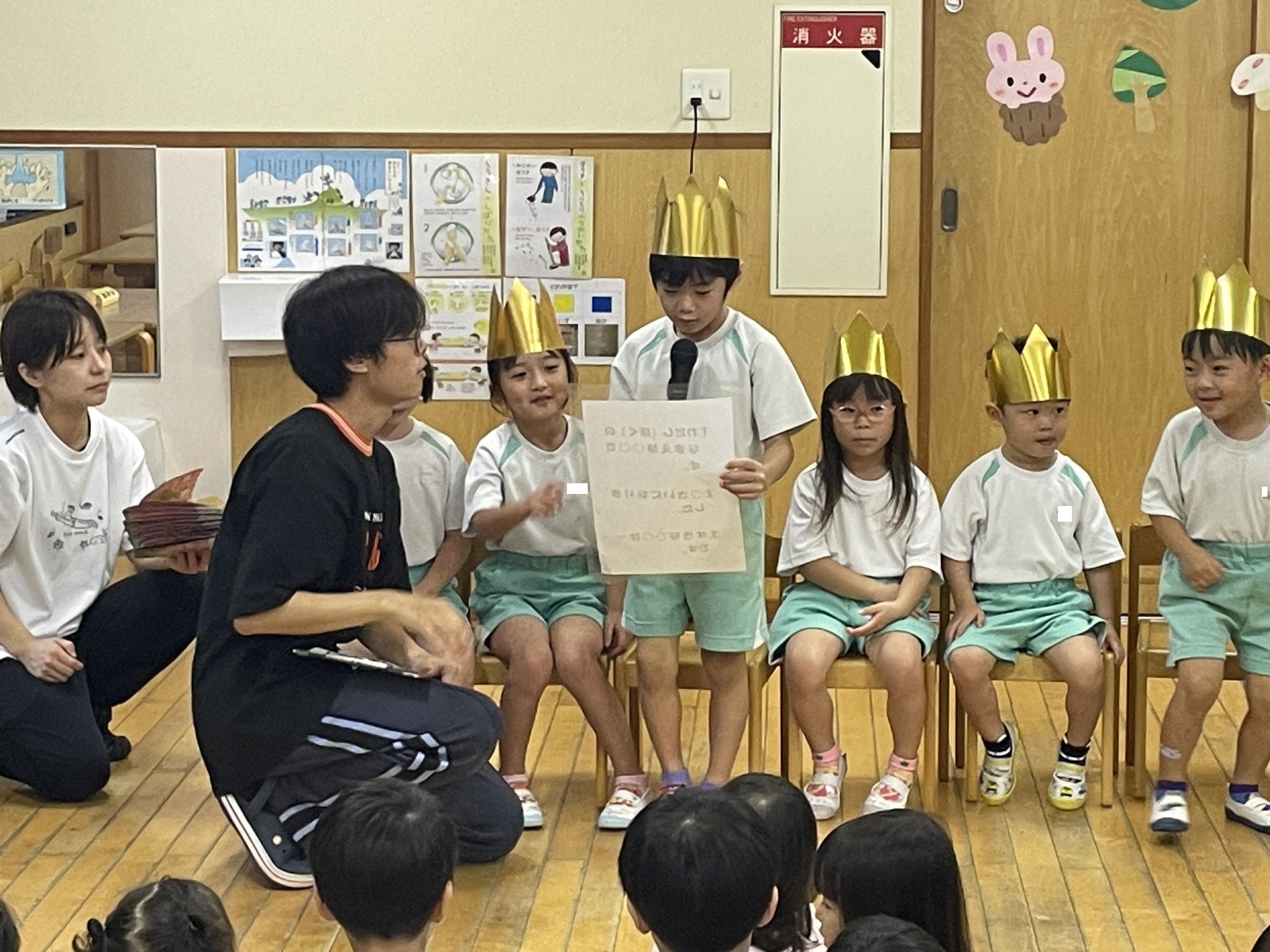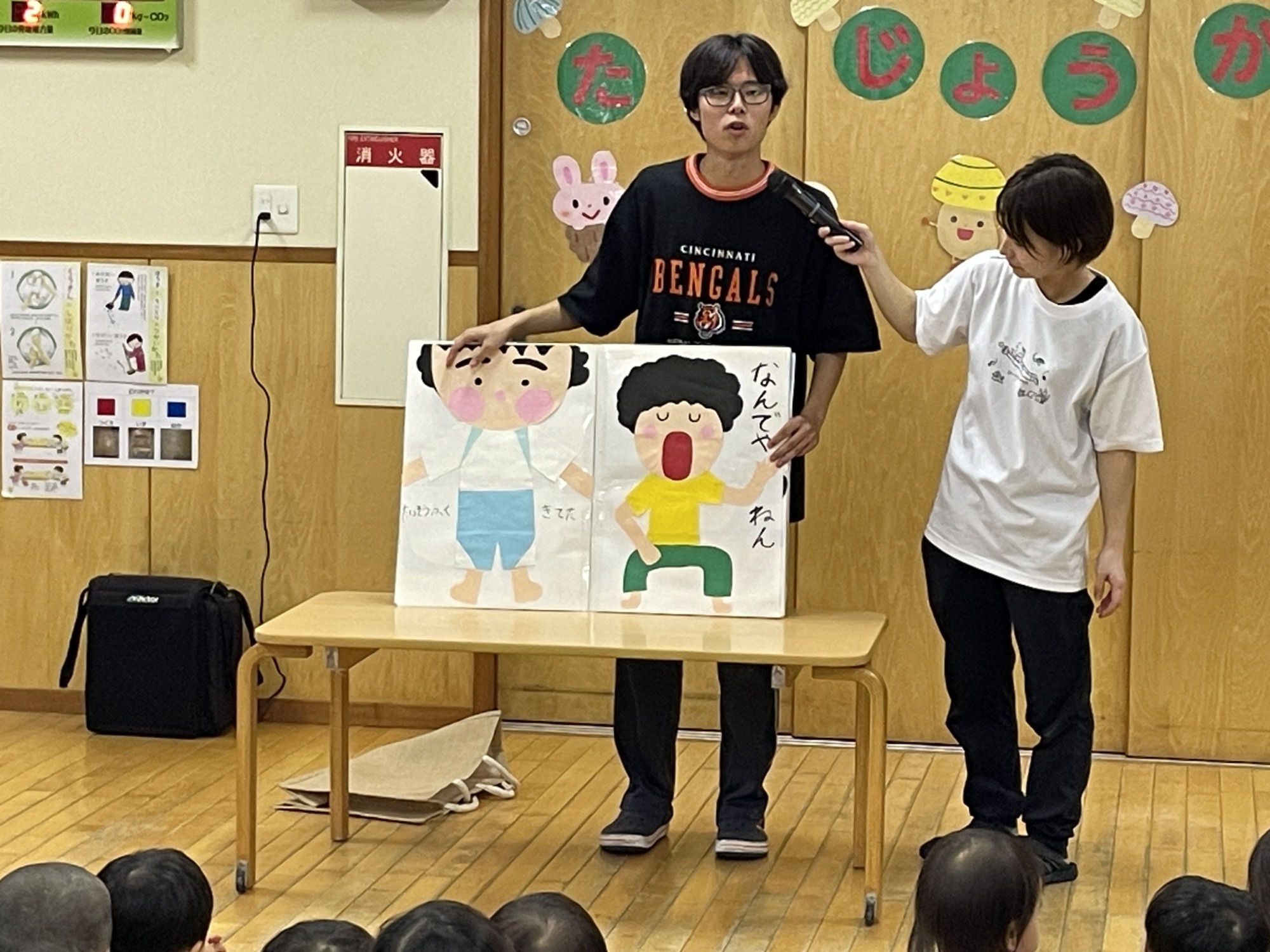 今日のお楽しみは、「なんでやねん」の手作り紙芝居でした。子どもたちが大好きな絵本ですが、今日は保育士特製の“運動会バージョン”のお話でした。「朝、パジャマを着替えようとすると・・・体操服着てた!」という奇想天外な展開に対し子どもたちが声を揃えて「なんでやねん!」とツっこんでいきます。ページをめくる毎に出てくる楽しい“ボケ”に自然と笑みがこぼれる子ども達でした。