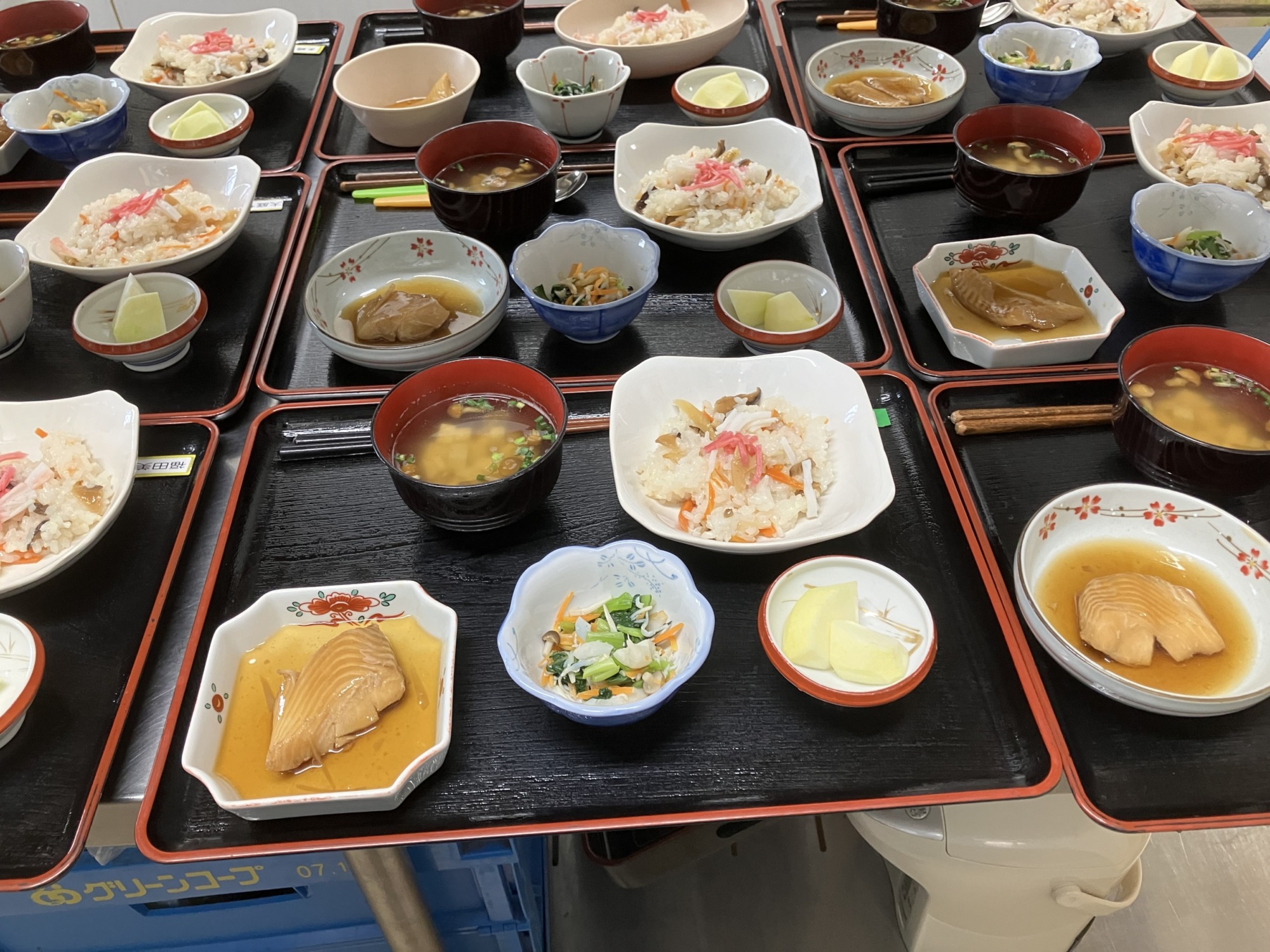 本日のメニュー 散らし寿司 煮魚 青菜の和え物 清汁 フルーツ