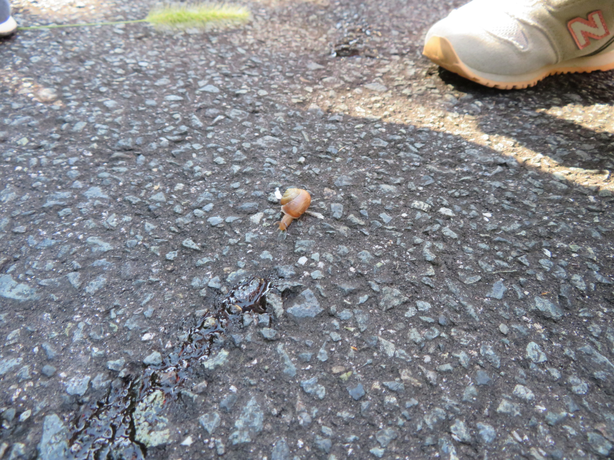 地面に座ってカタツムリさんの動きを観察していました🔍✨