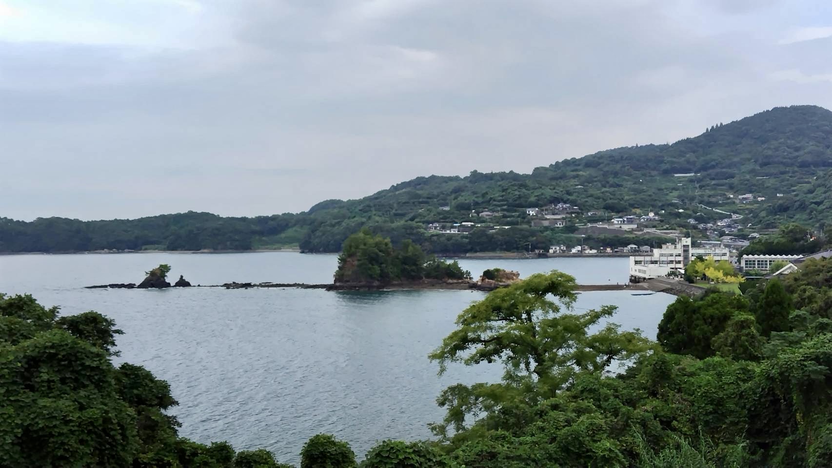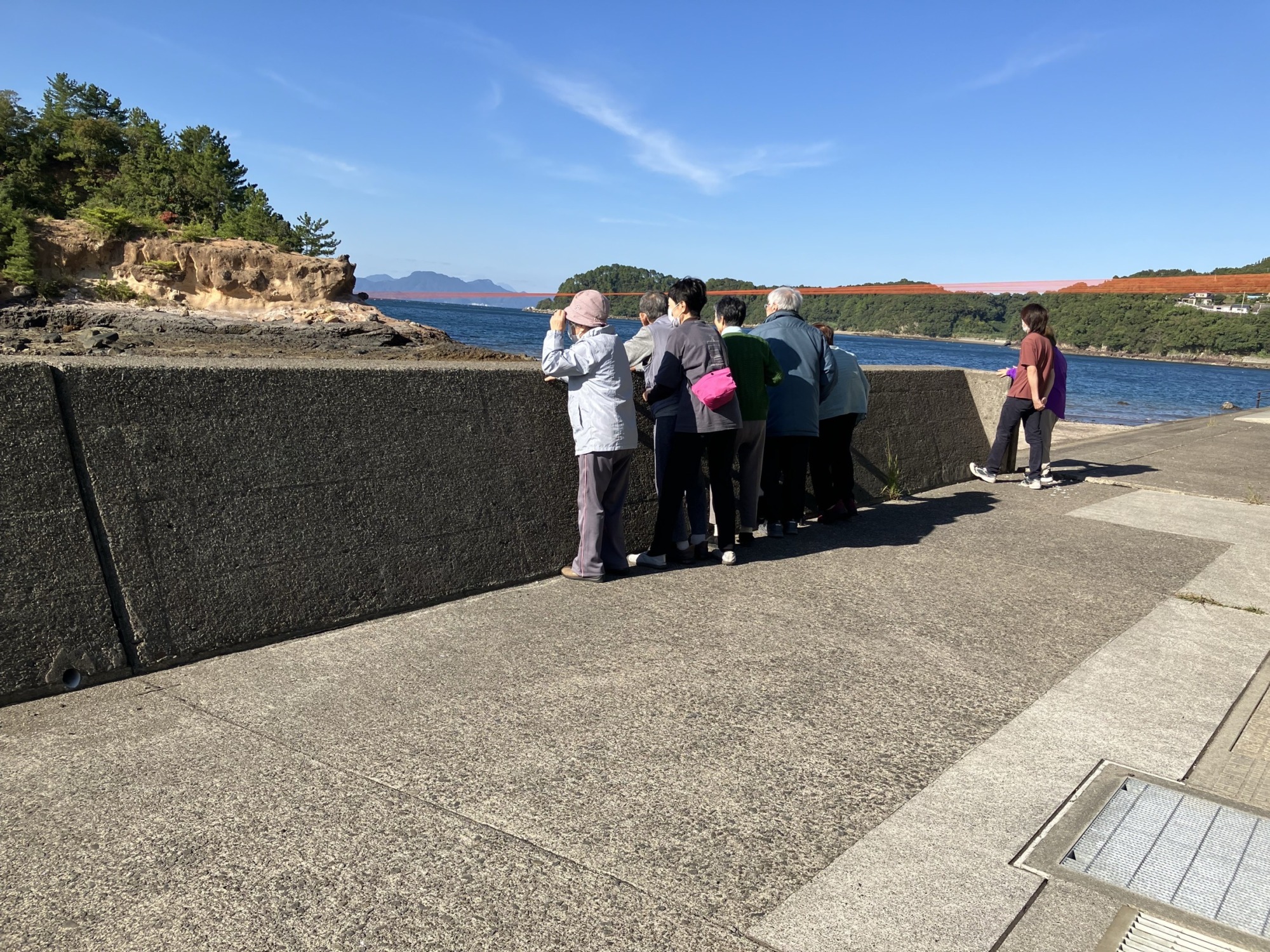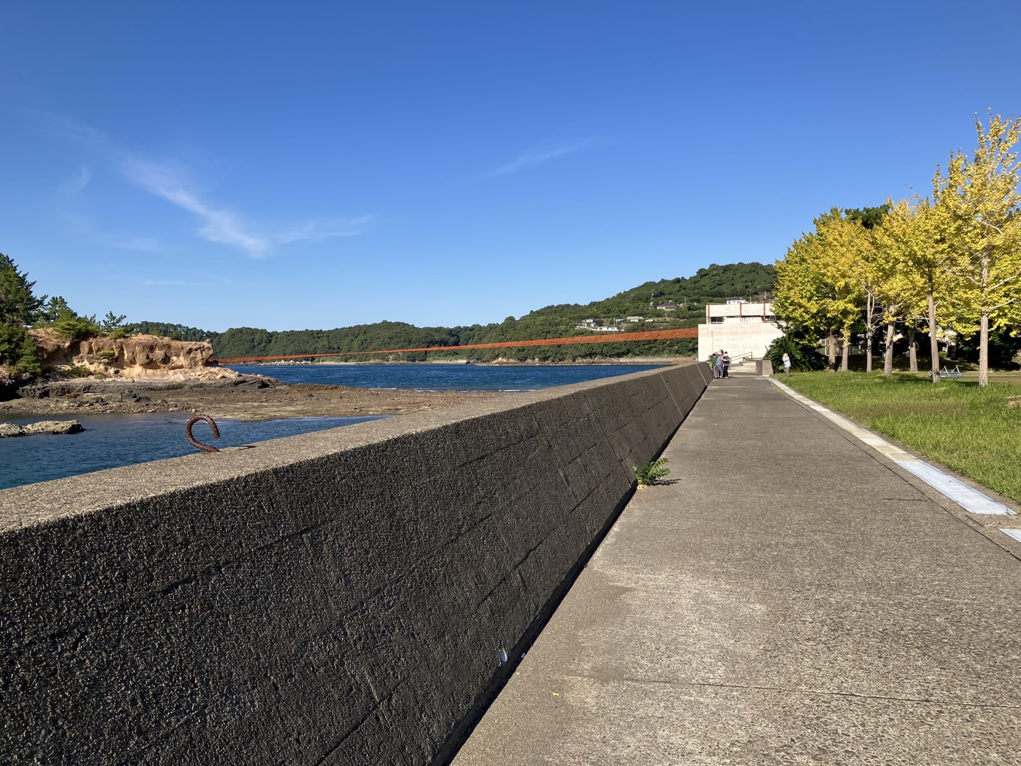 津奈木町の海に浮かぶ島へと繋がる赤い糸。