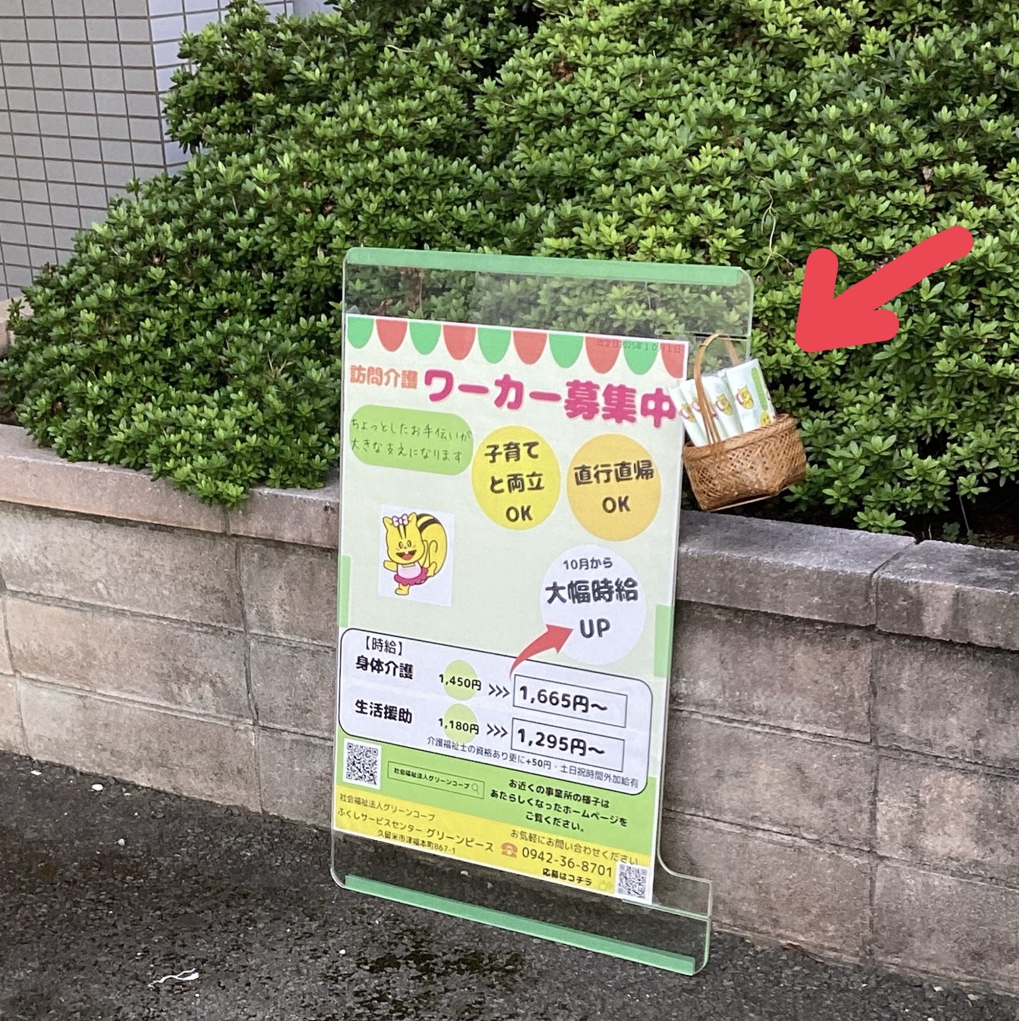 本日、事業所の前にワーカー募集のポスターを立てかけてみました。