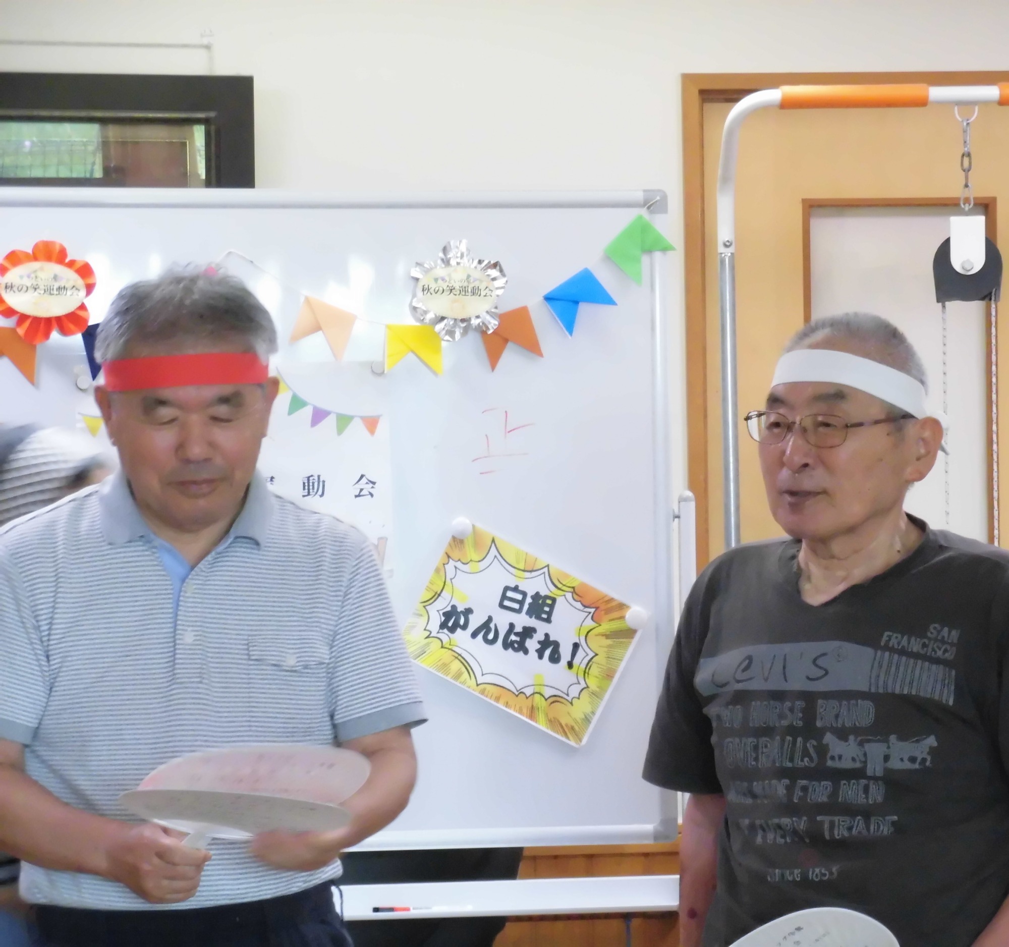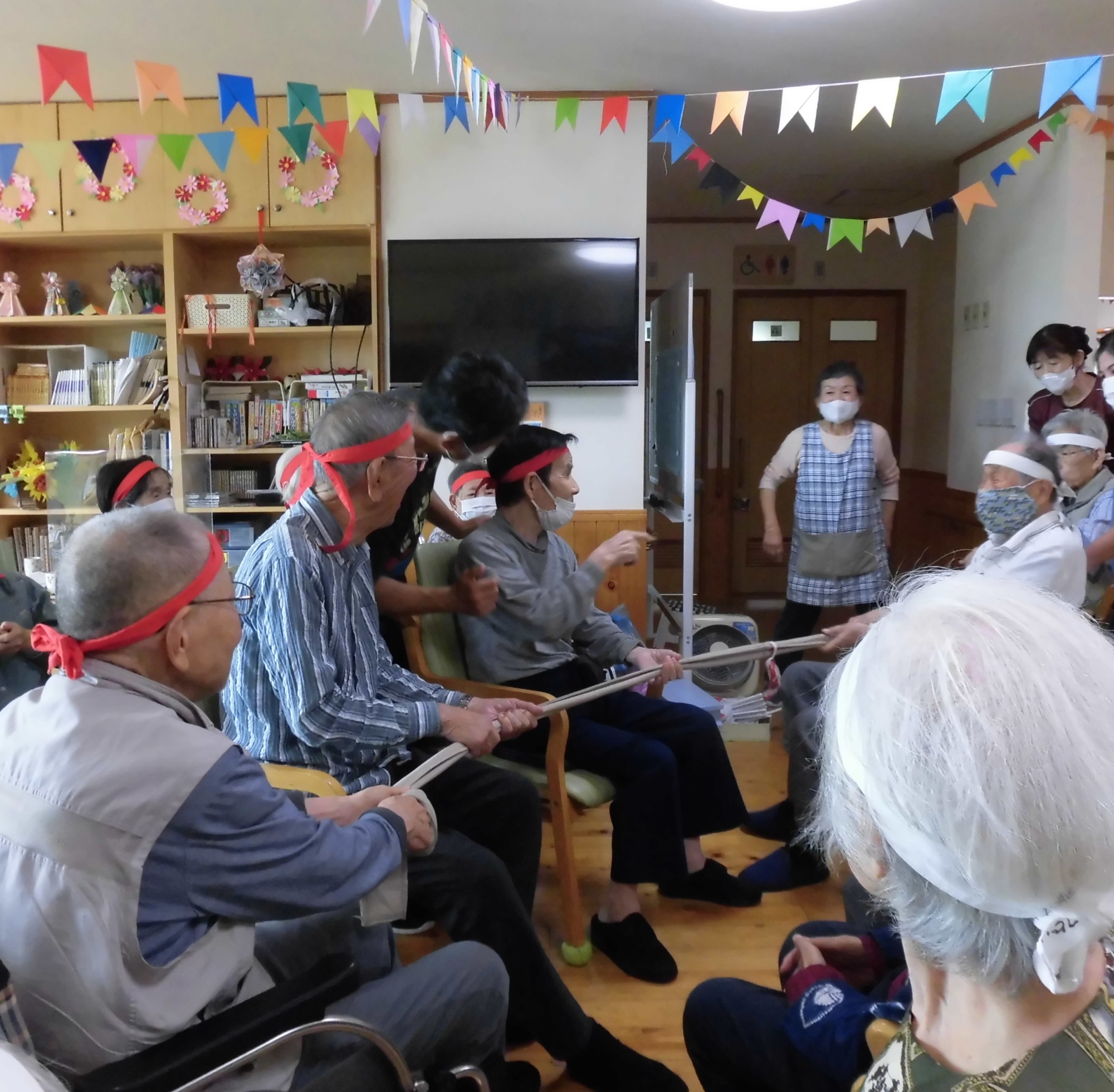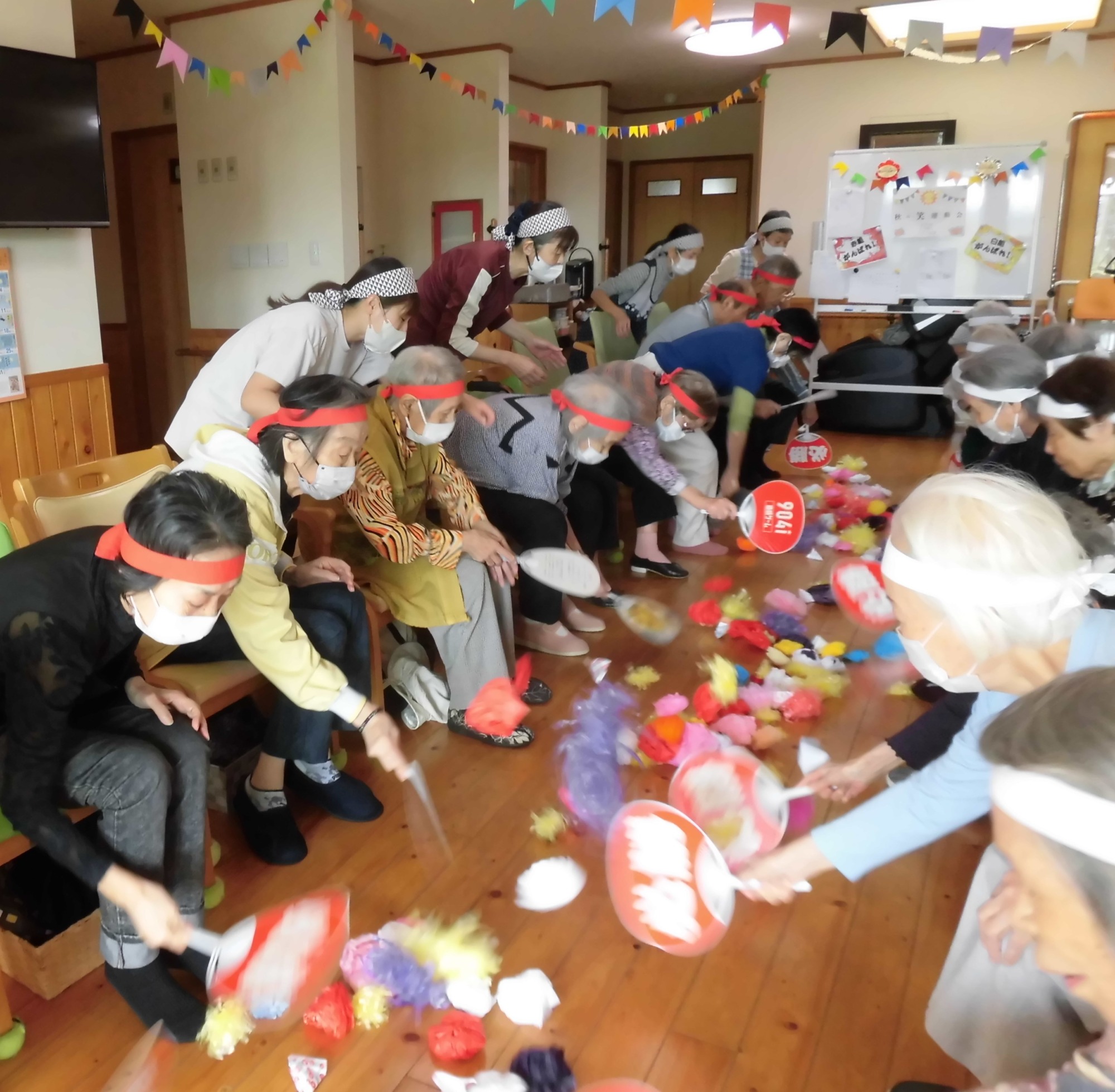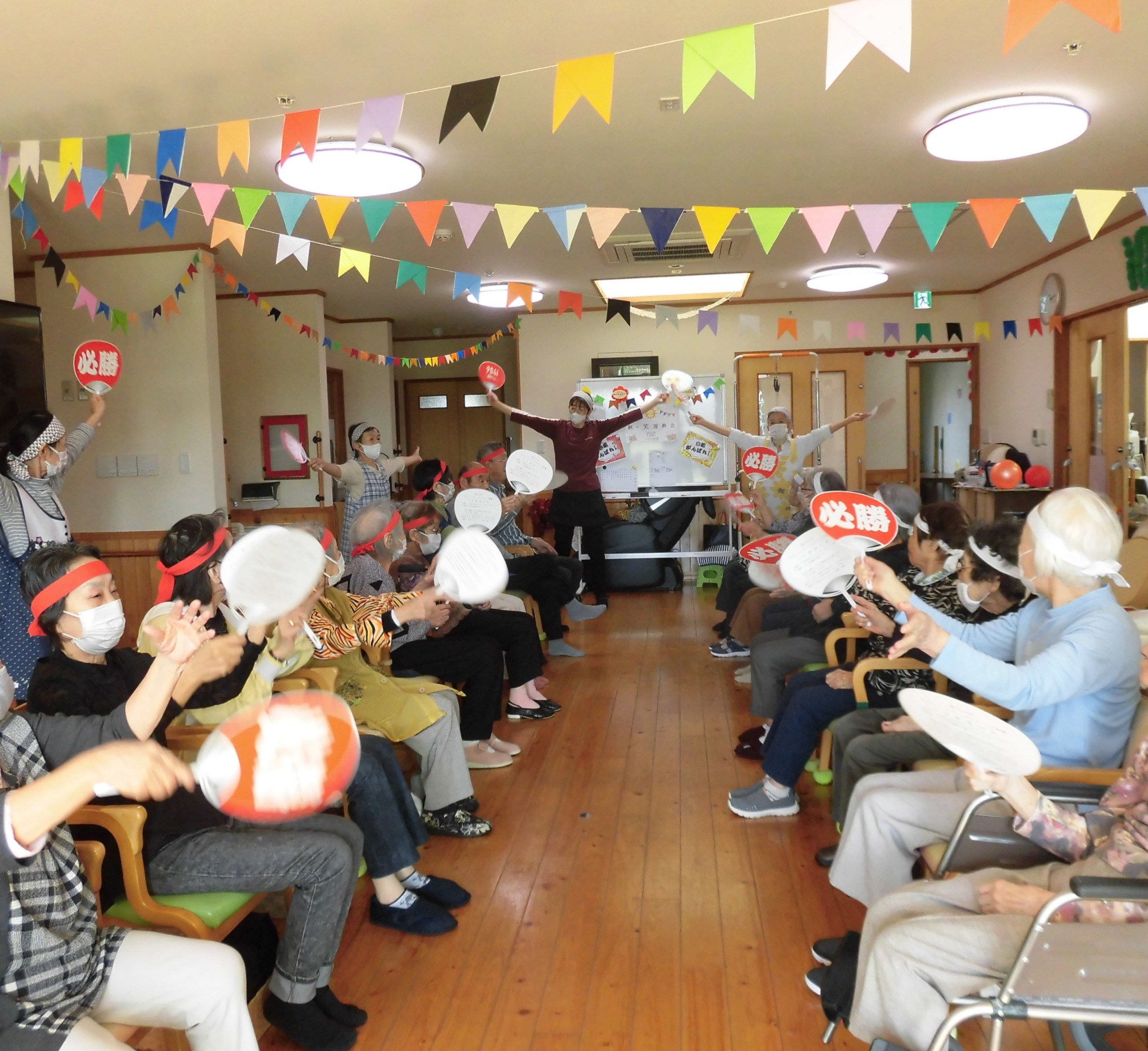デイつどいの家柳川で、「秋の笑運動会」を、ご利用者の皆さまが全員参加できるように、数回に分けて開催しました。応援合戦の様子です