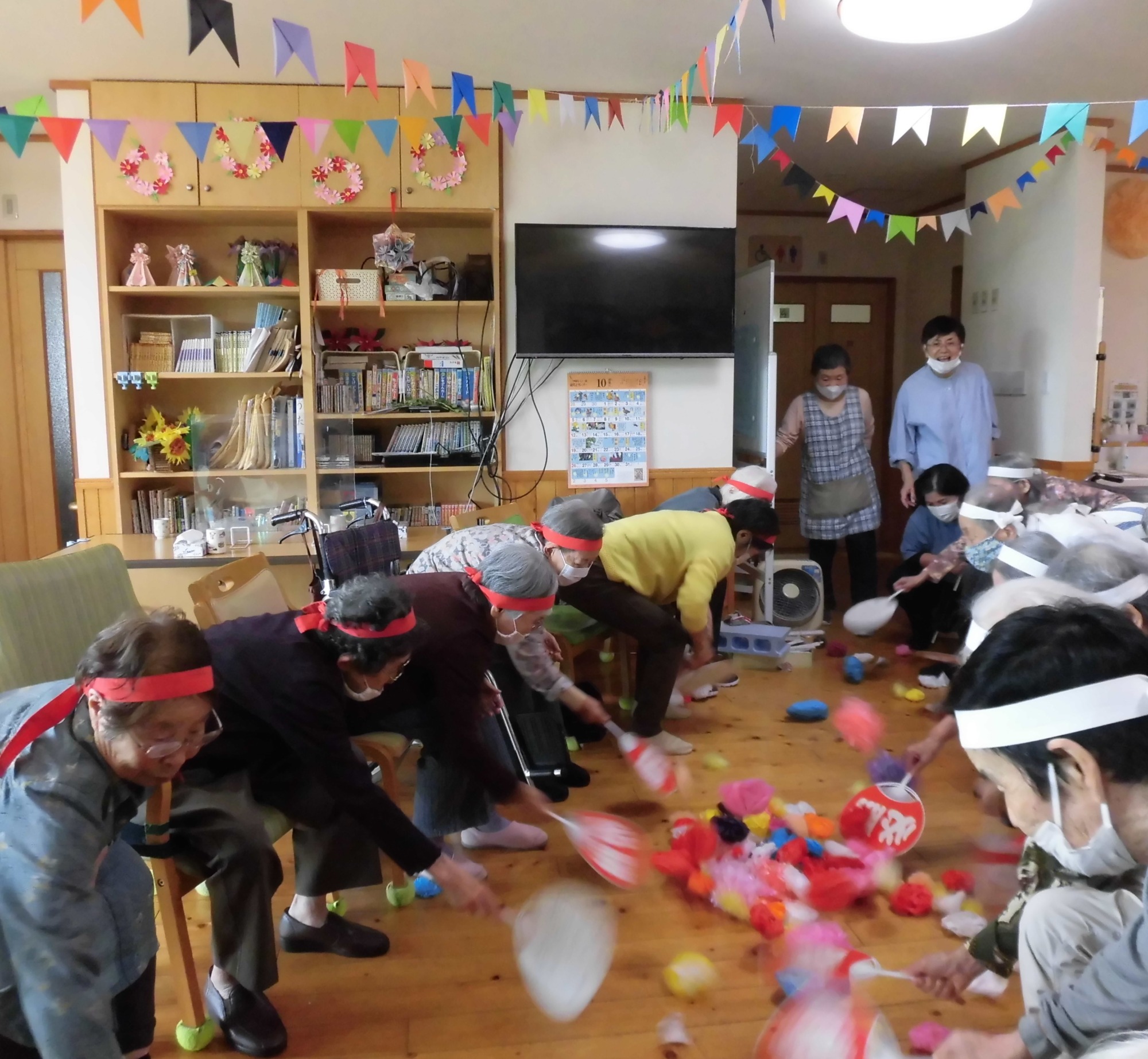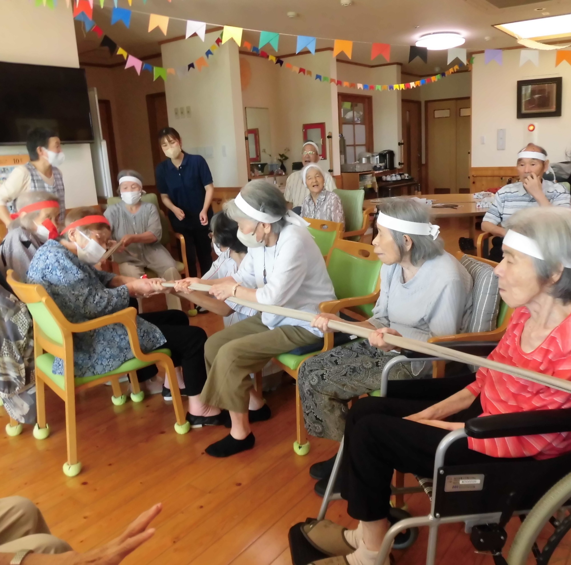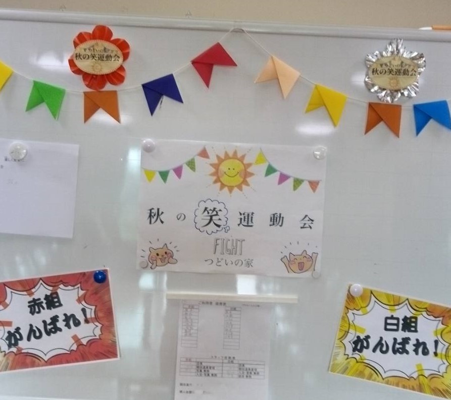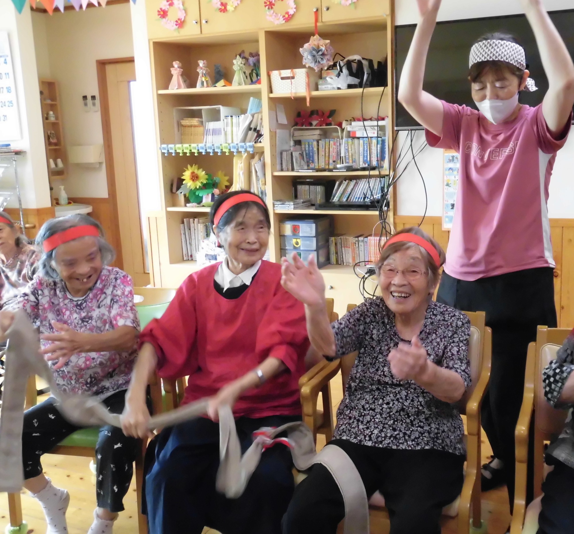 デイつどいの家柳川で、「秋の笑運動会」を、ご利用者の皆さまが全員参加できるように、数回に分けて開催しました。応援合戦の様子です