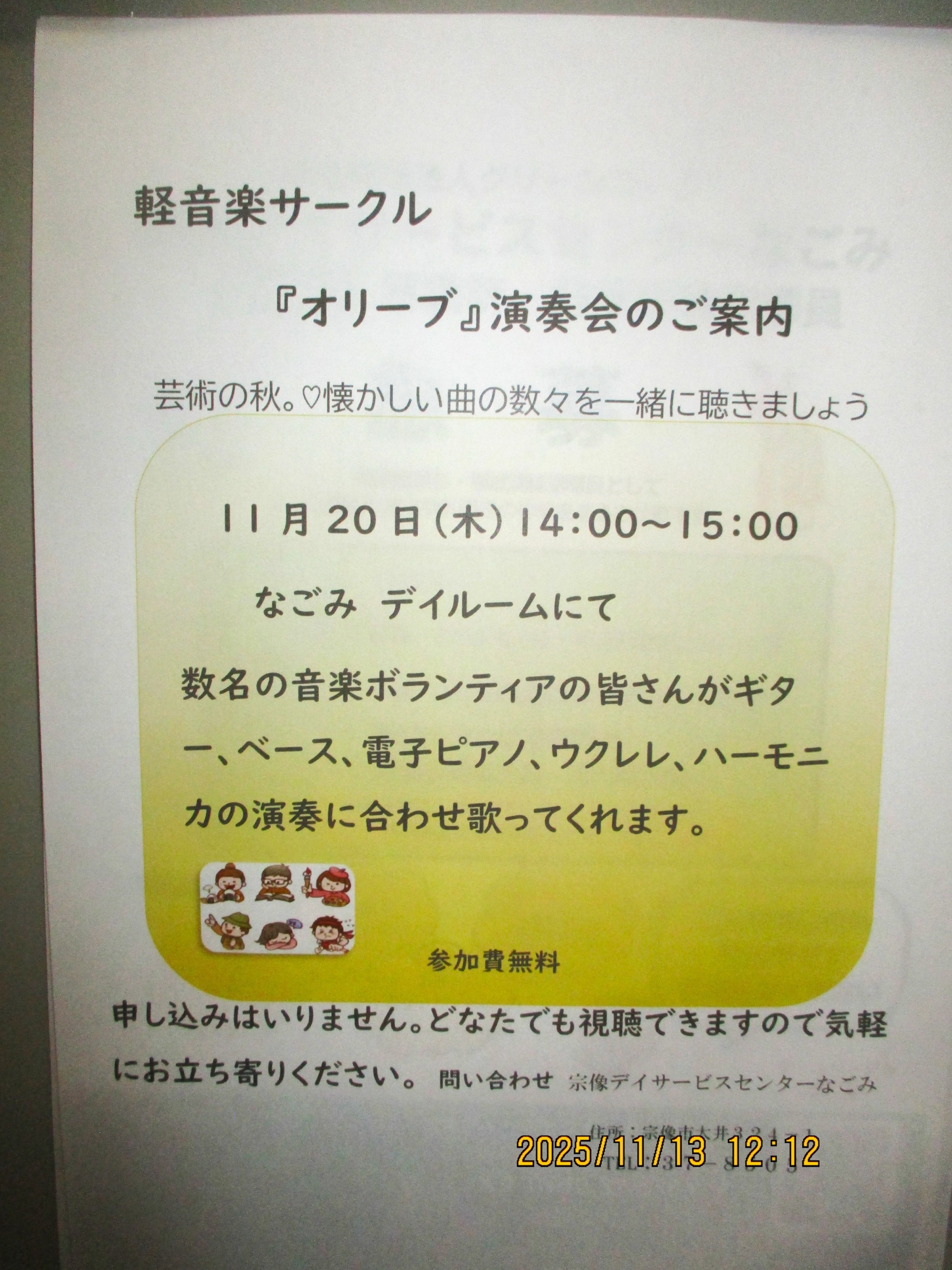なごみでの演奏会は、2回目となる軽音楽サークル『オリーブ』演奏会のご案内です。