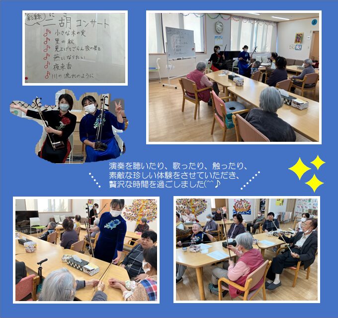 ワーカーさんとお友達が二胡の生演奏会を開いてくださいました😊