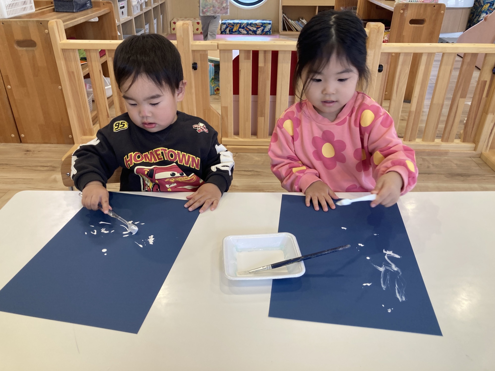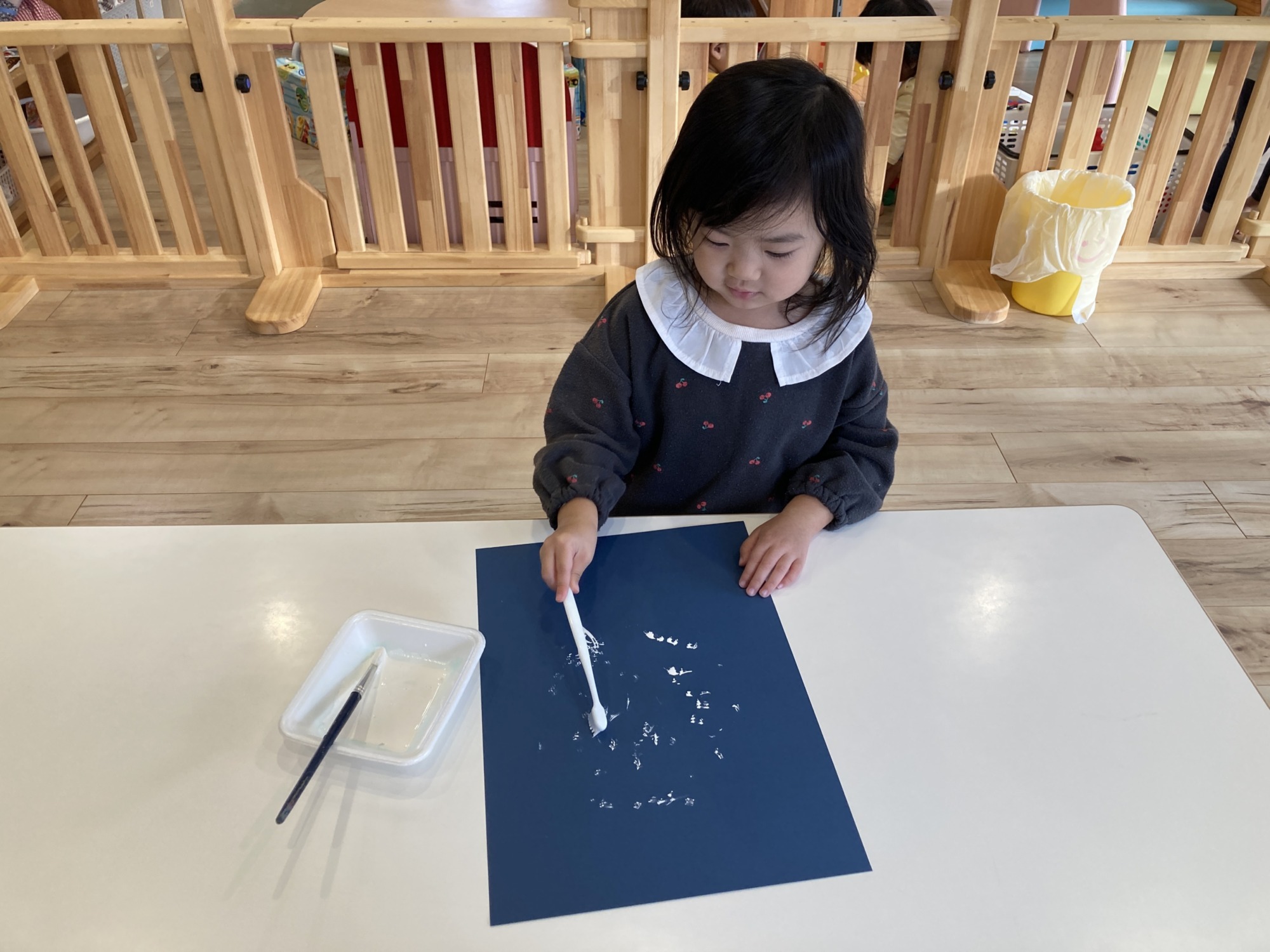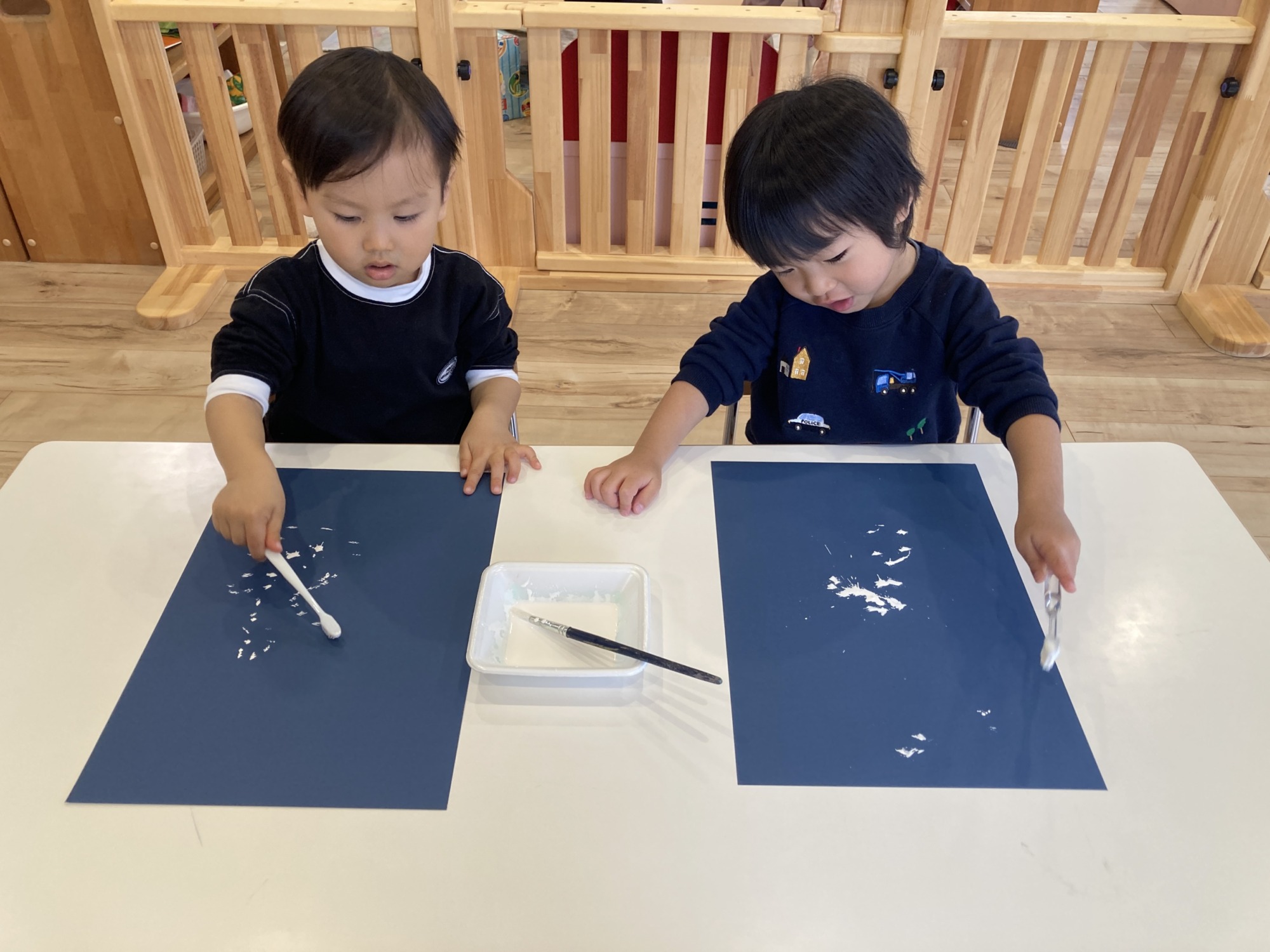 製作を楽しむ子どもたち 5枚 歯ブラシを使って雪を降らせてステキなツリーの完成‼︎