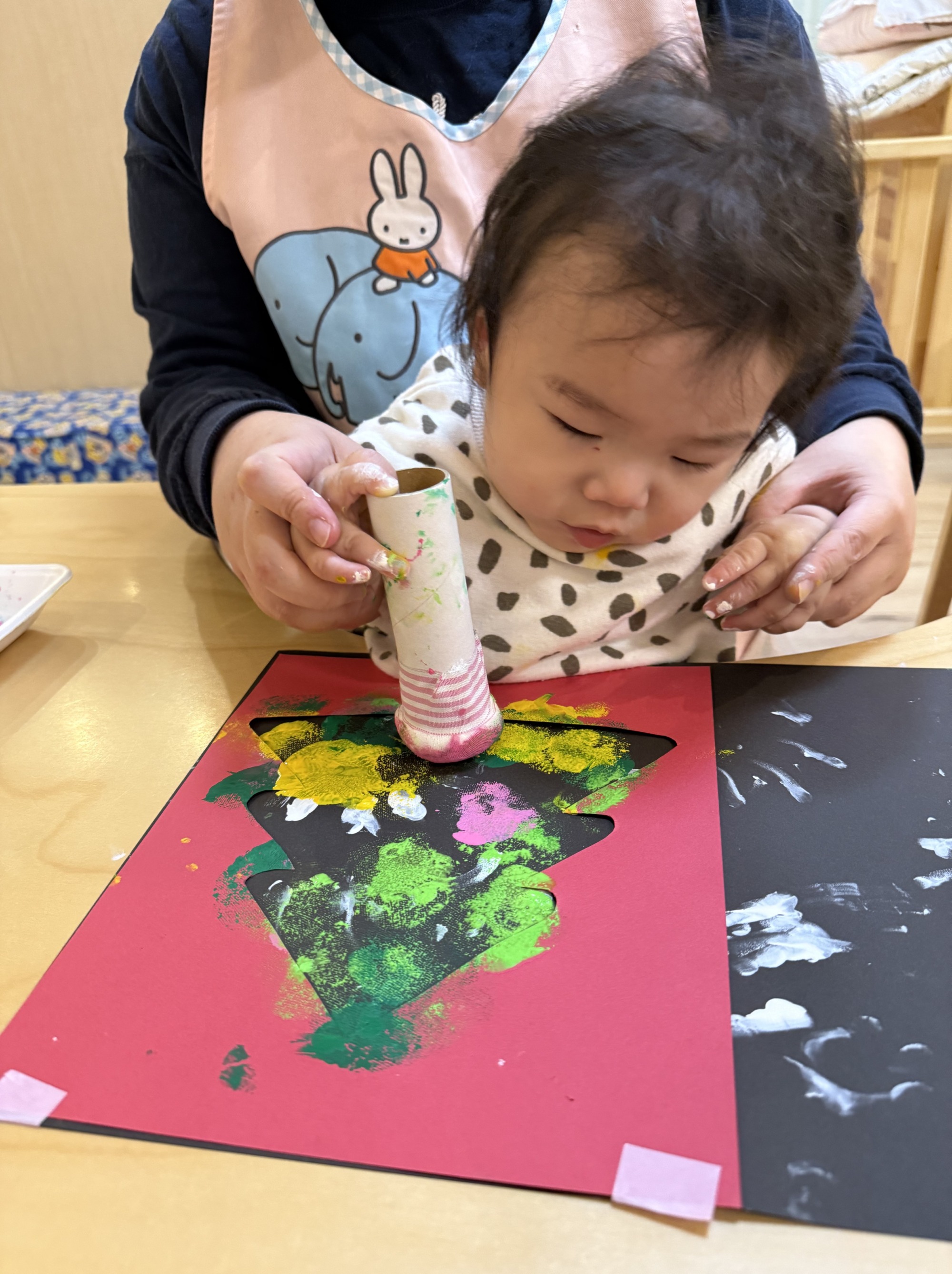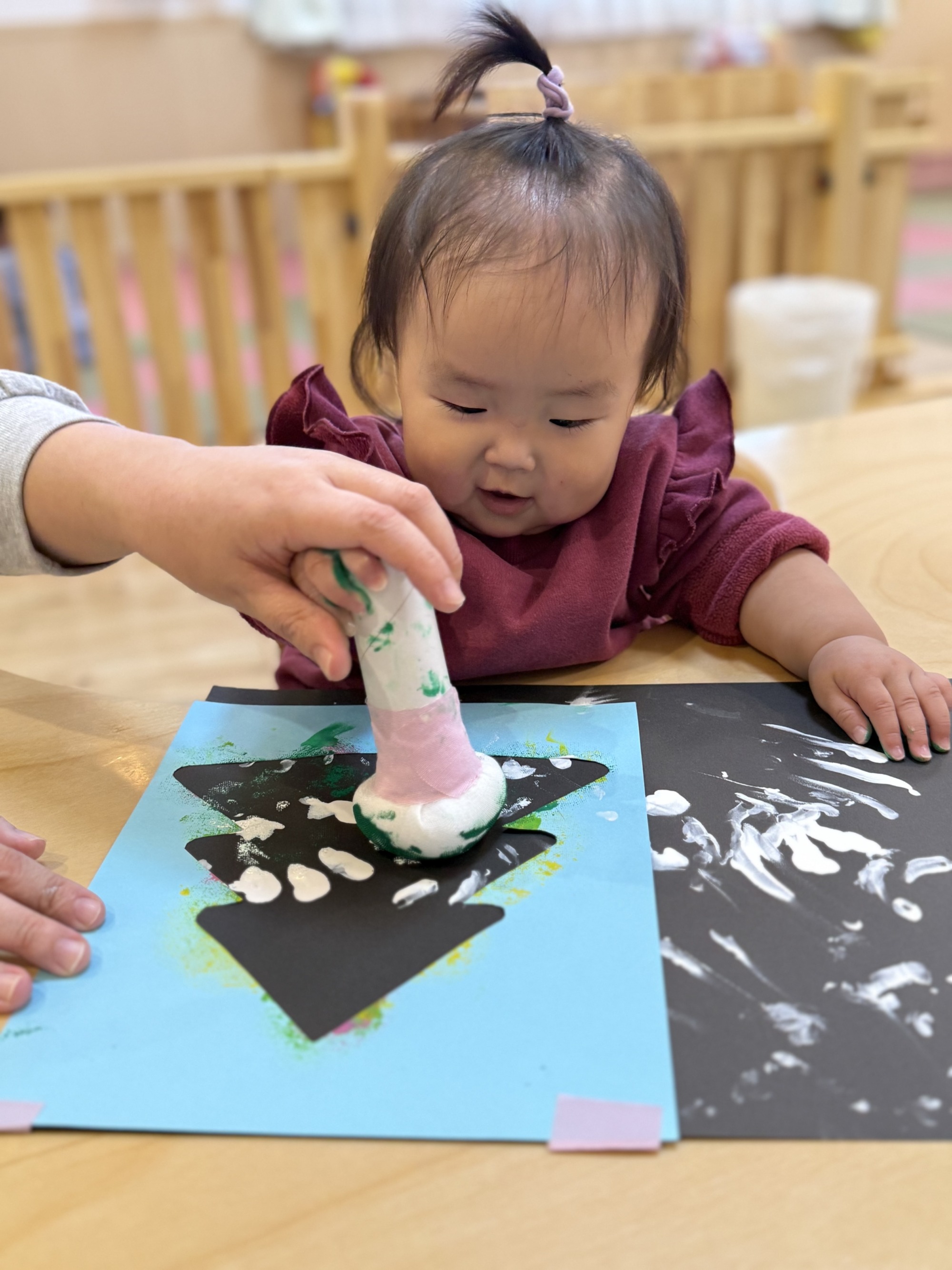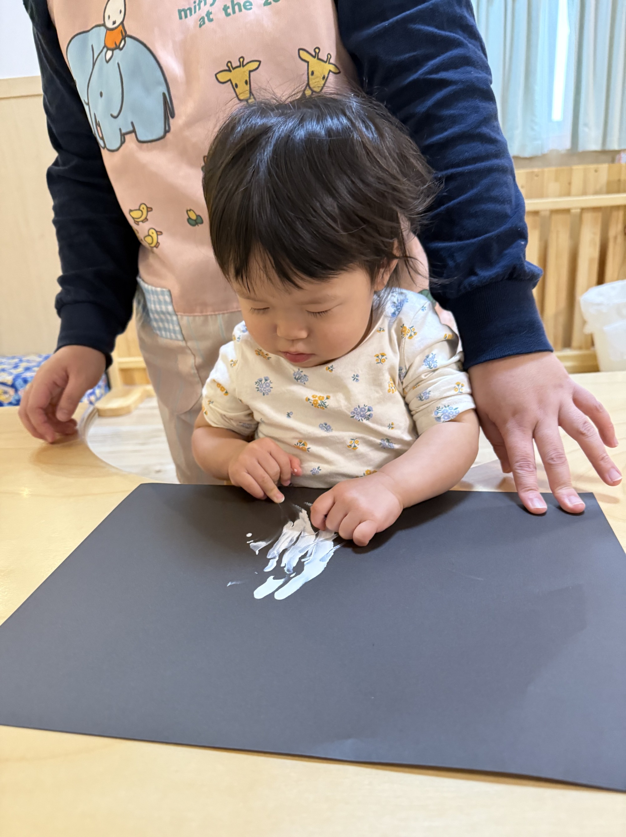 絵の具の感触や、タンポなどが少し苦手なお友達もいましたが、これから少しずつ慣れて、五感を育んでいけたらと思います(^^)