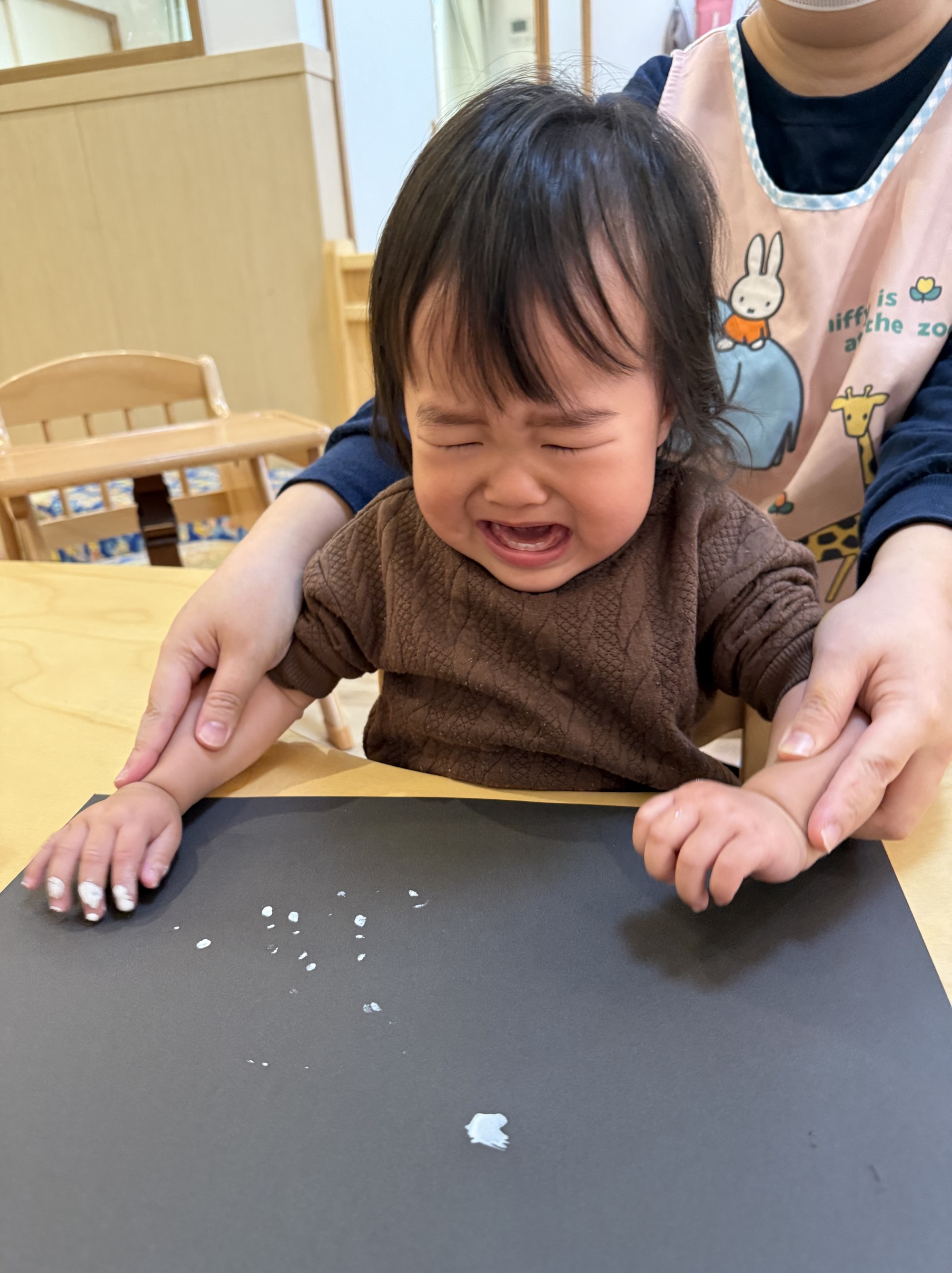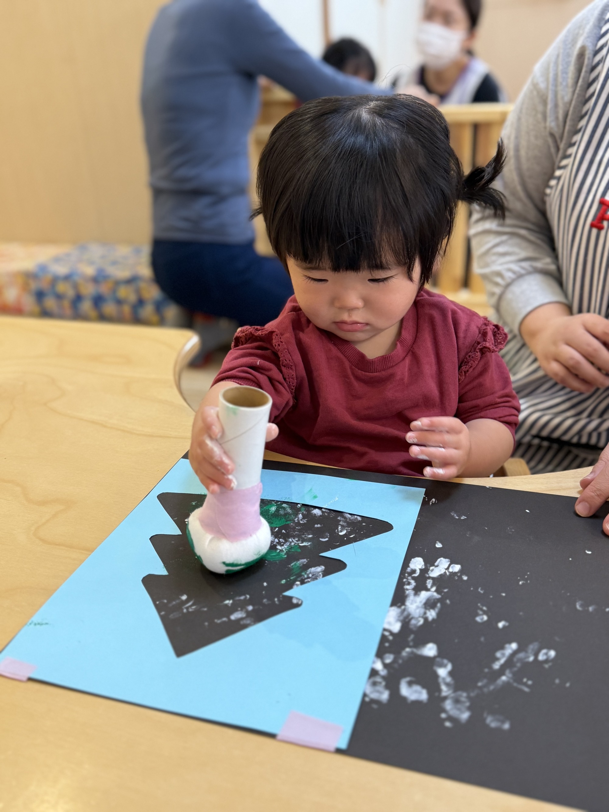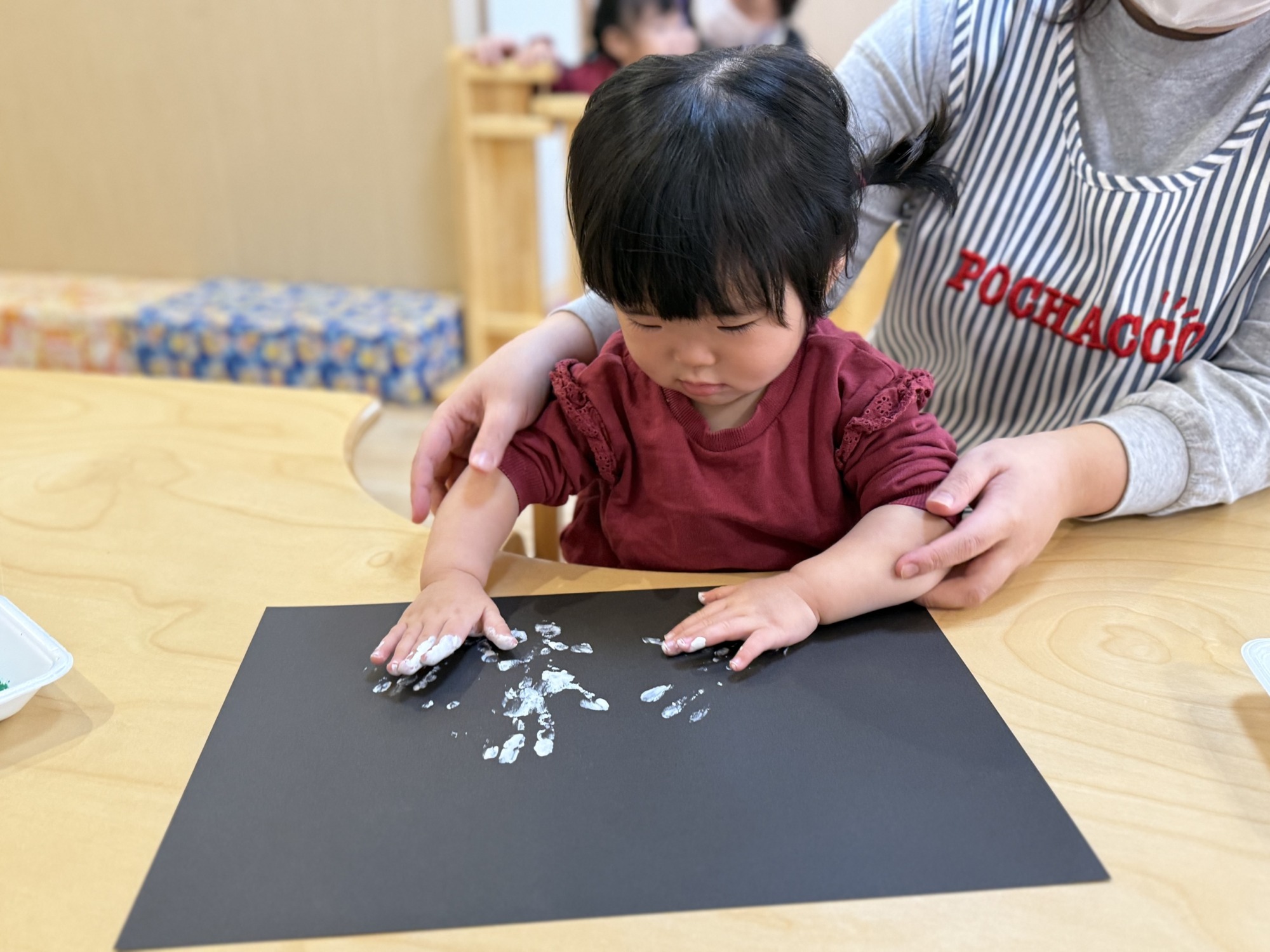絵の具の感触や、タンポなどが少し苦手なお友達もいましたが、これから少しずつ慣れて、五感を育んでいけたらと思います(^^)