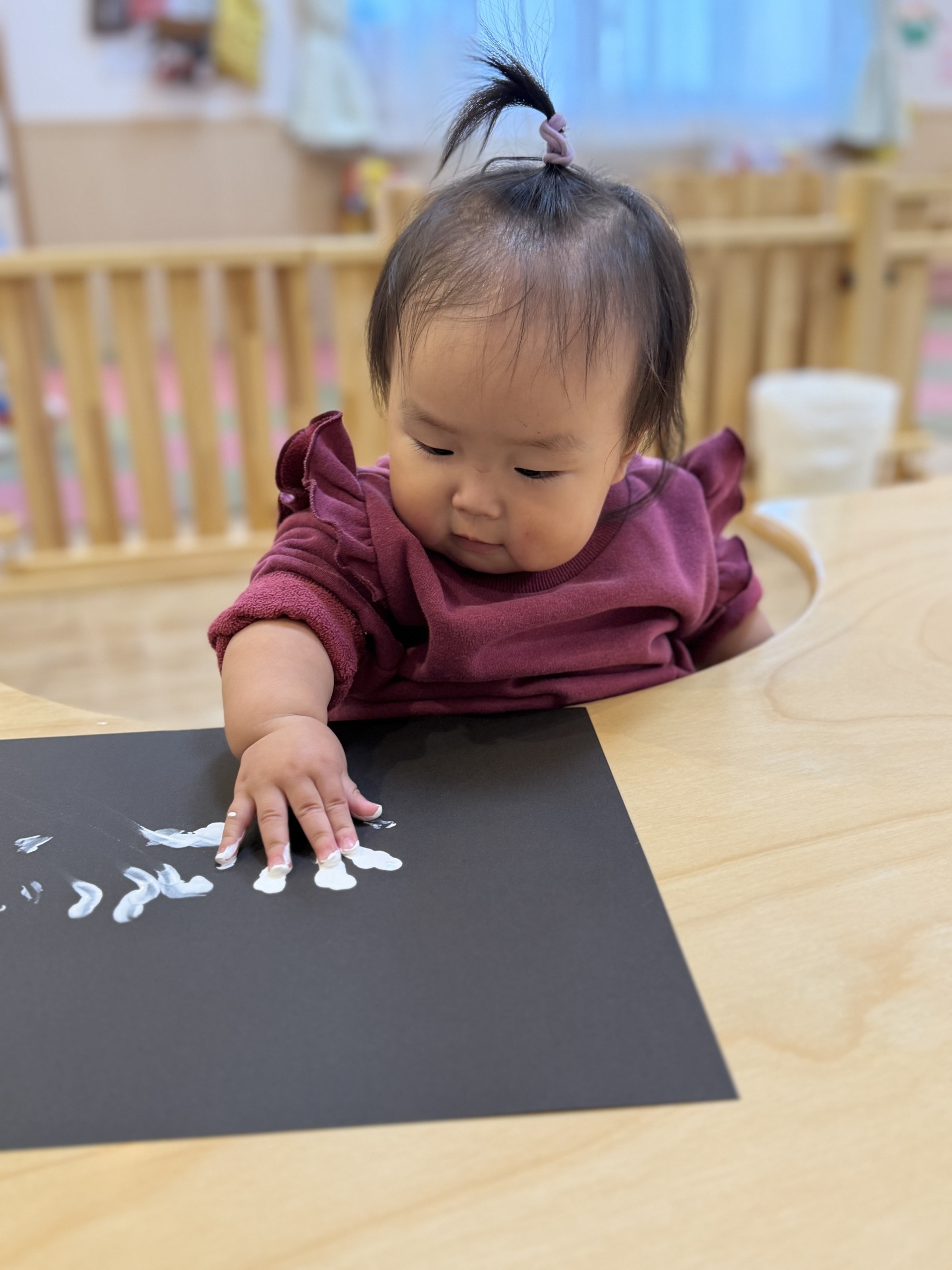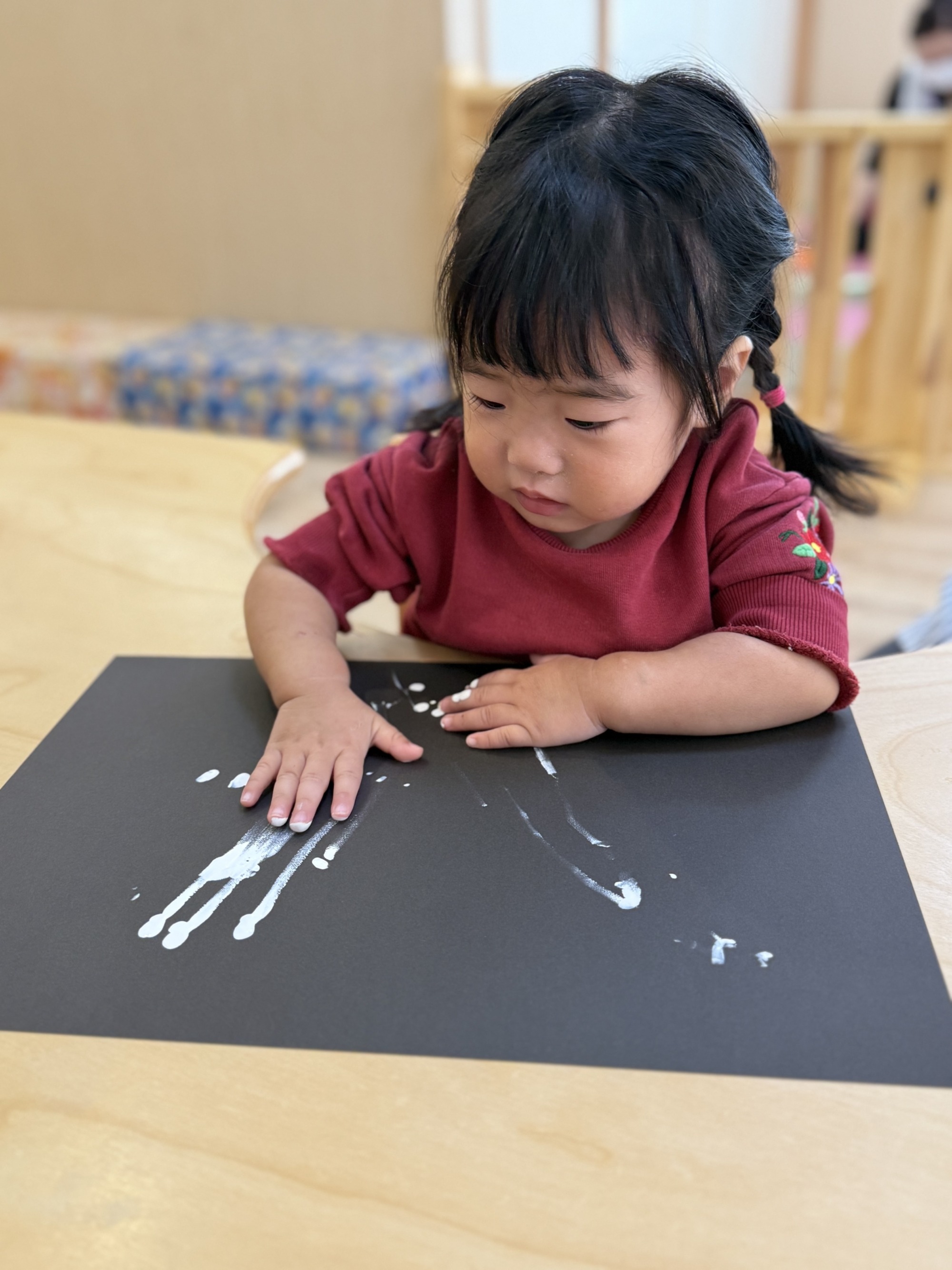 指に絵の具を付けてペタペタスタンプしたり、指を滑らせたり色々な模様が付くのを楽しんでいました♪