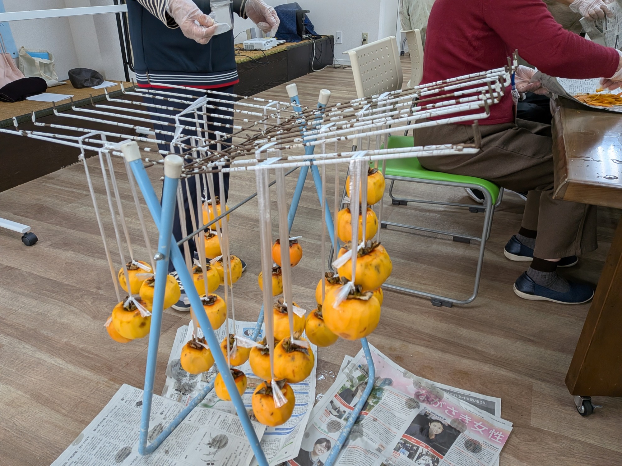 えくぼの事業所前にある果物屋には、干し柿用の渋柿がたくさん並んでいます。佐世保市から受託している脳活教室でも、皆さんと一緒に一緒に干し柿作りを行いました。