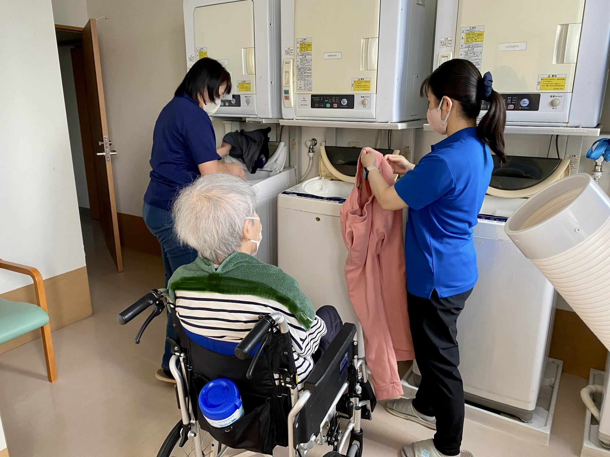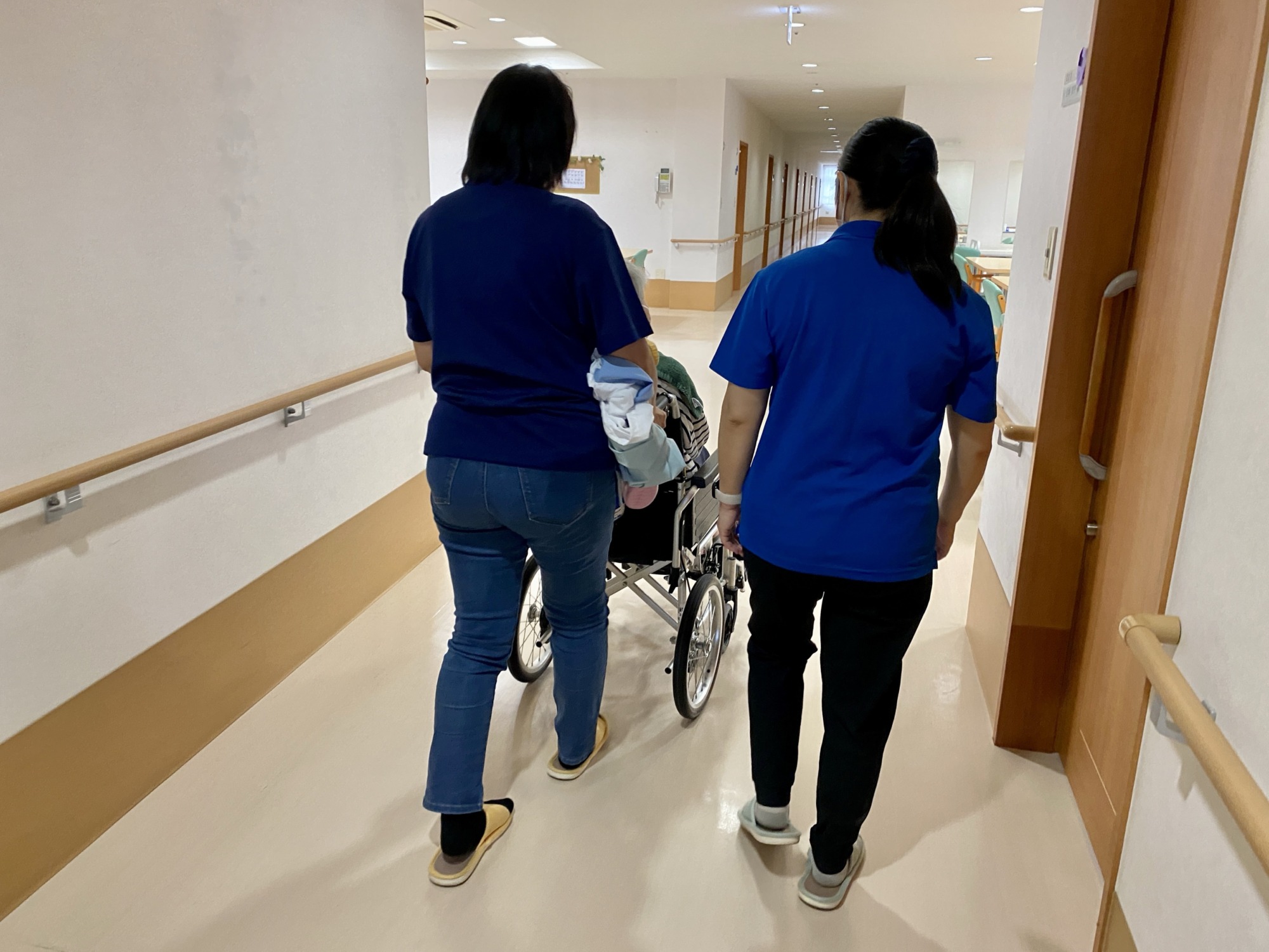 施設で生活をされておられる車いすご利用のご利用者様の同行時の様子です。