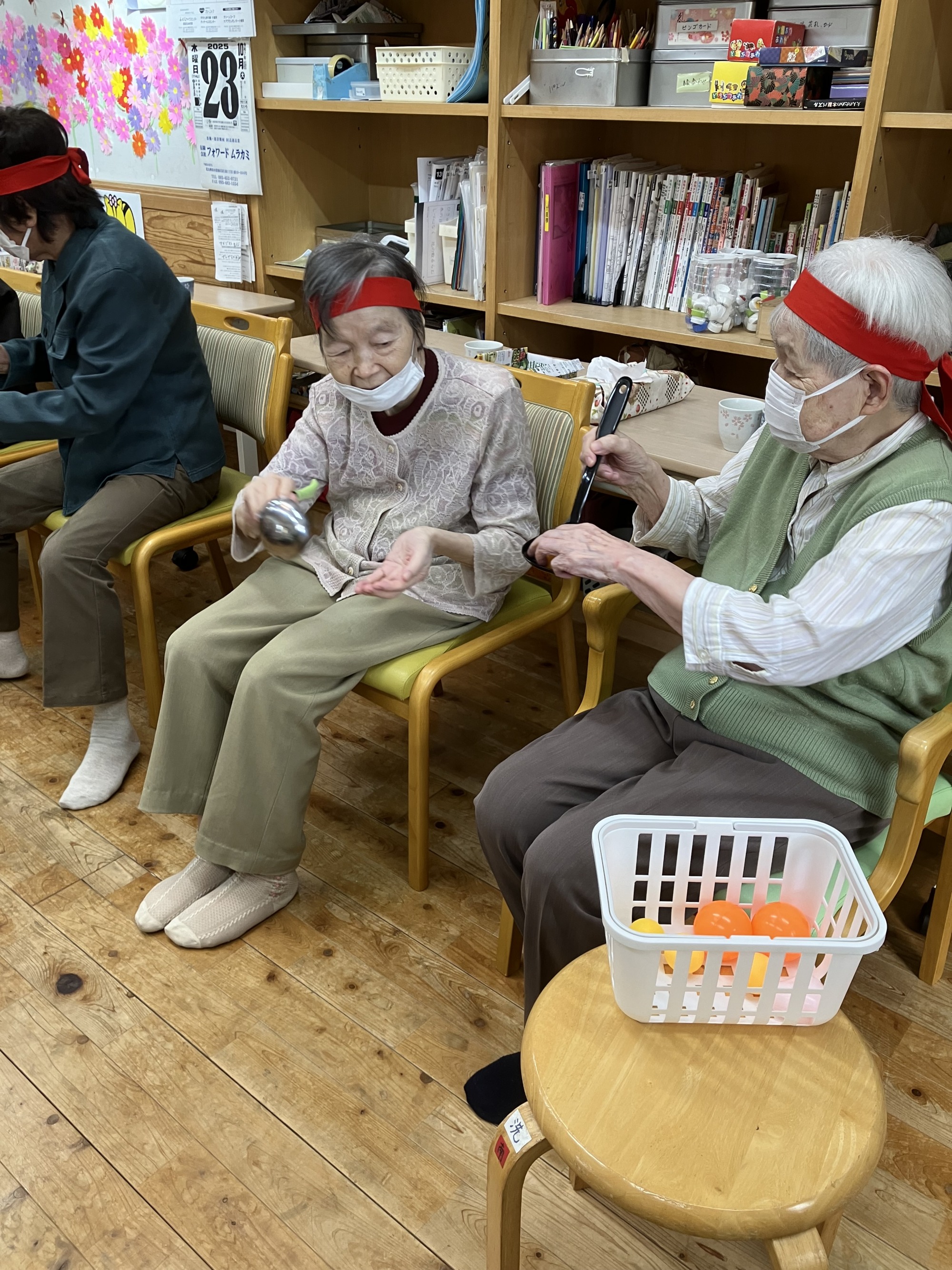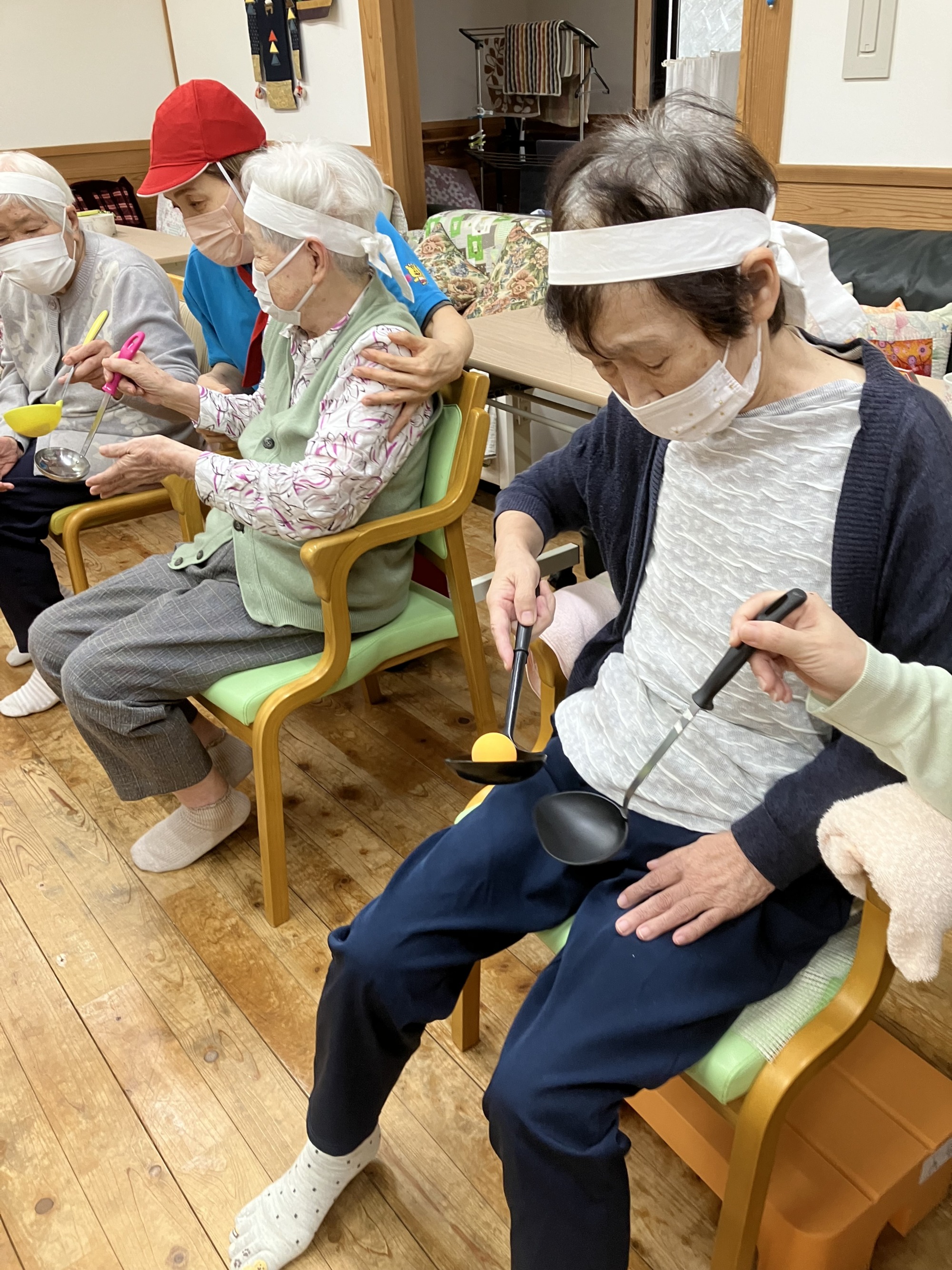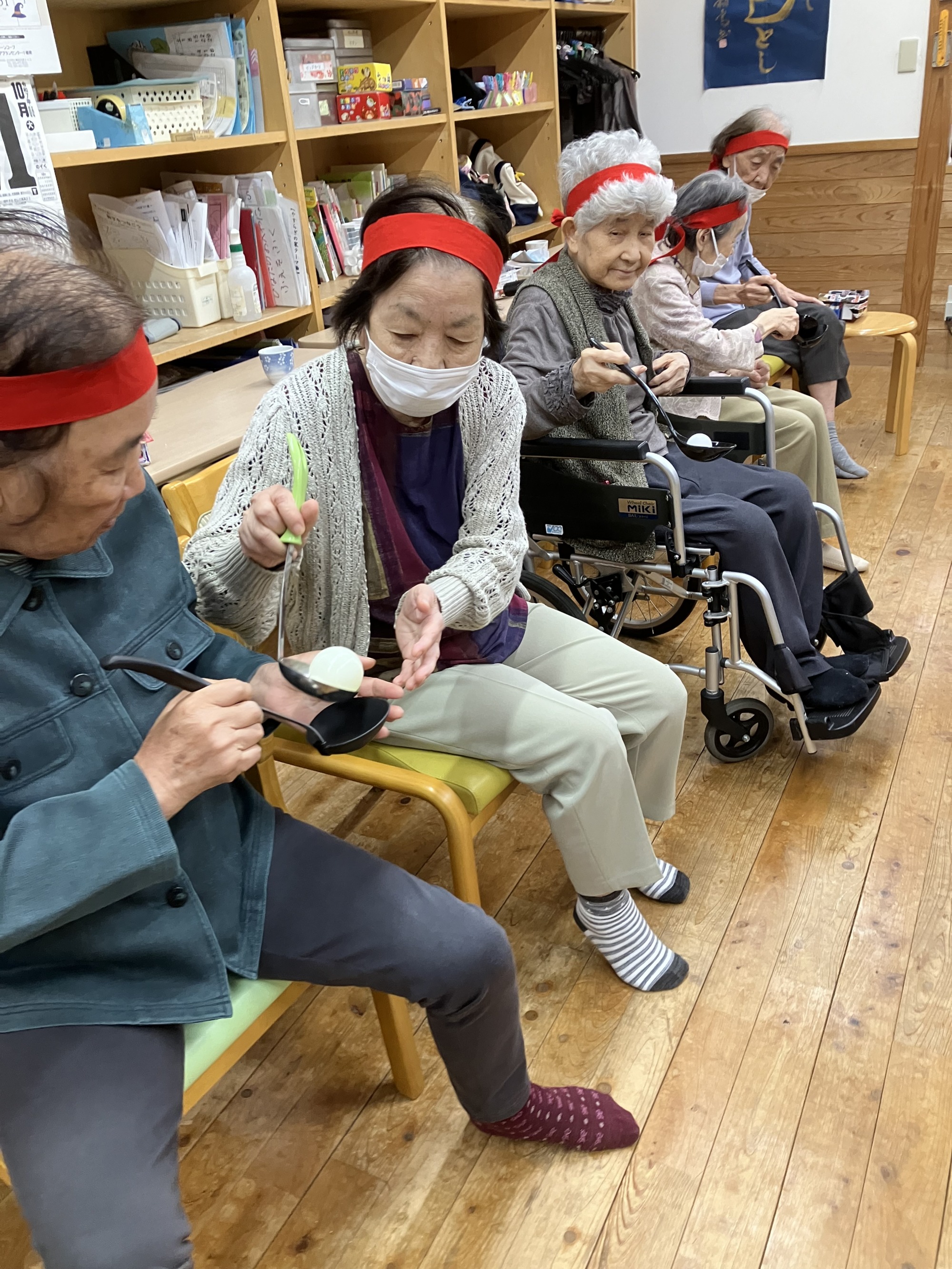 ピンポン玉をお玉に入れて次々に回していきます。先にゴールしたチームが勝利🏅回すわよ 大丈夫よ 落とさないようにね慎重にね 大丈夫よ 次がくるわよなかなかむずかし 上手くのるかな