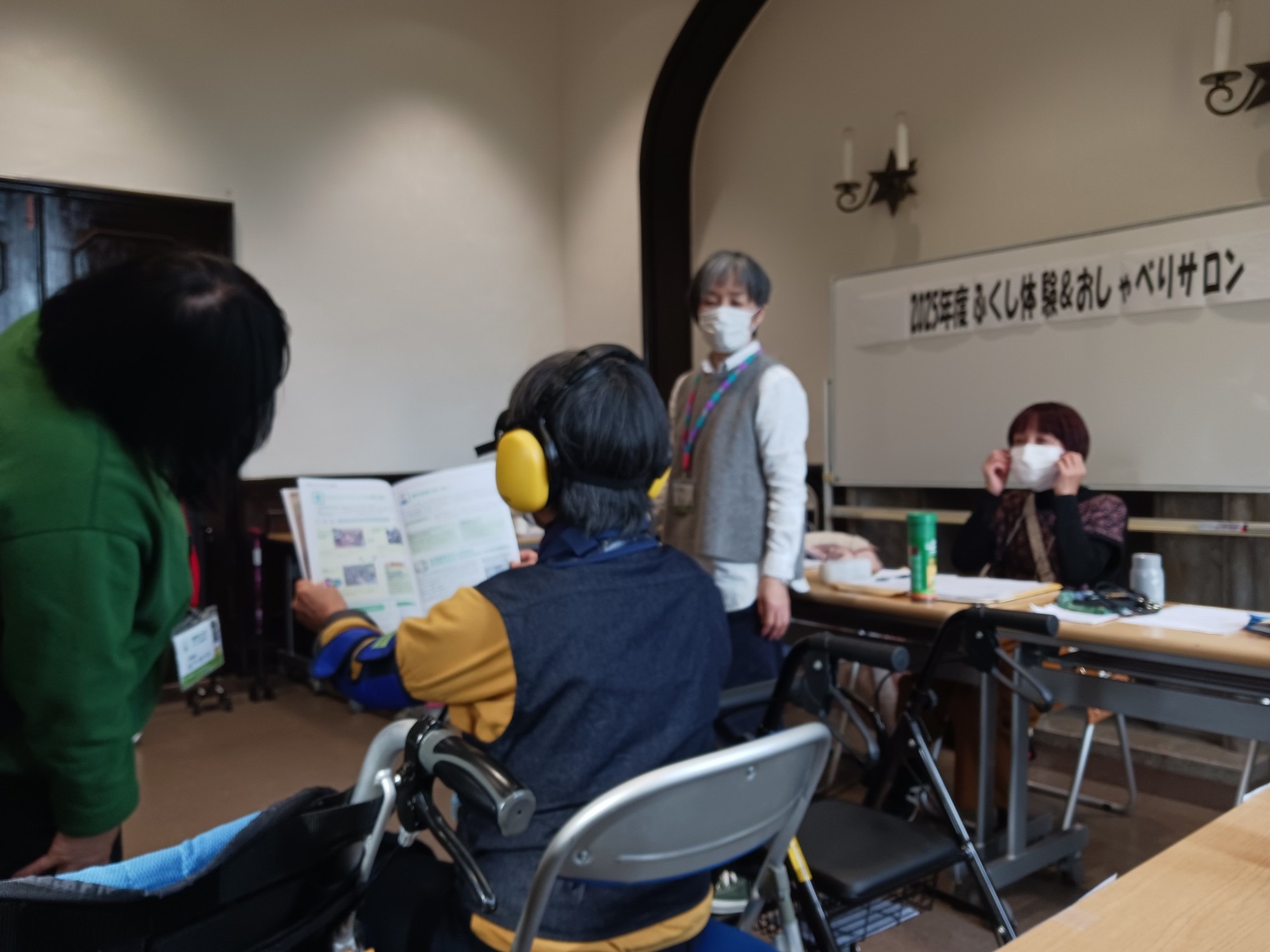 11/27 ふくし体験おしゃべりサロンに参加しました。高齢者疑似体験、介護保険制度の説明や地域にある事業所の説明を行いました。介護食、赤ちゃんにもオッケーなGCの