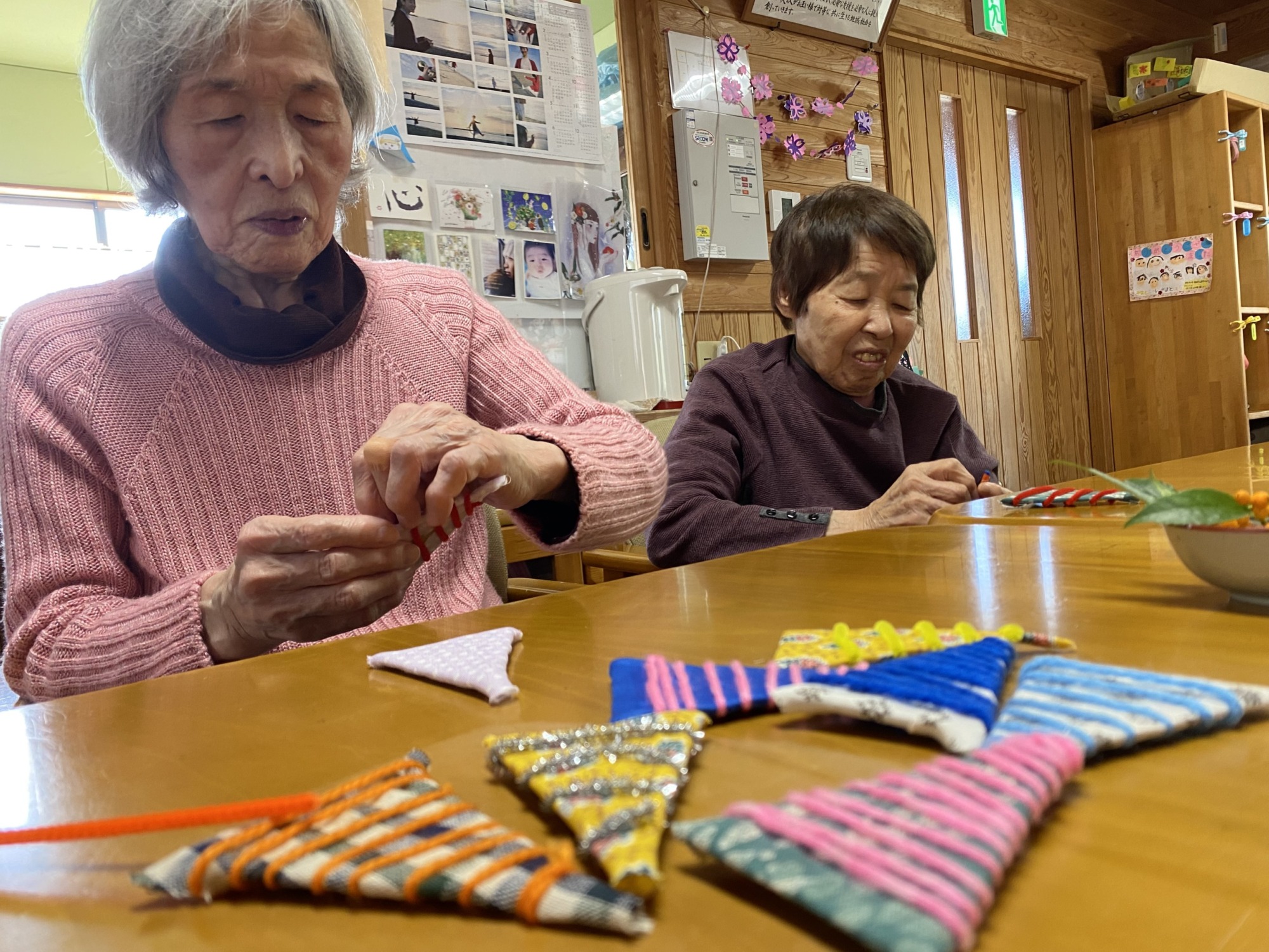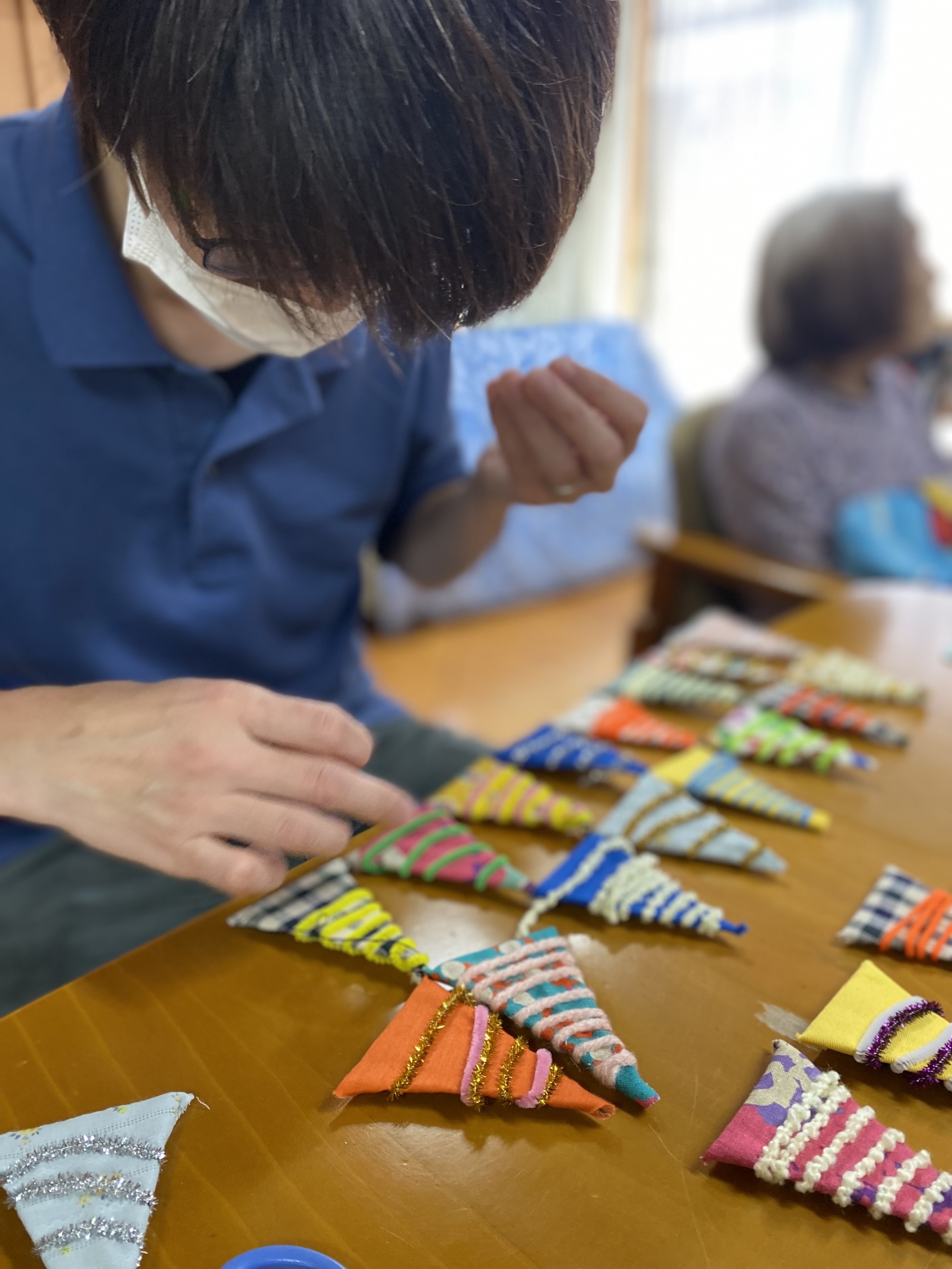 一つずつ端切れを巻いて並べる作業を手伝っていただきました。