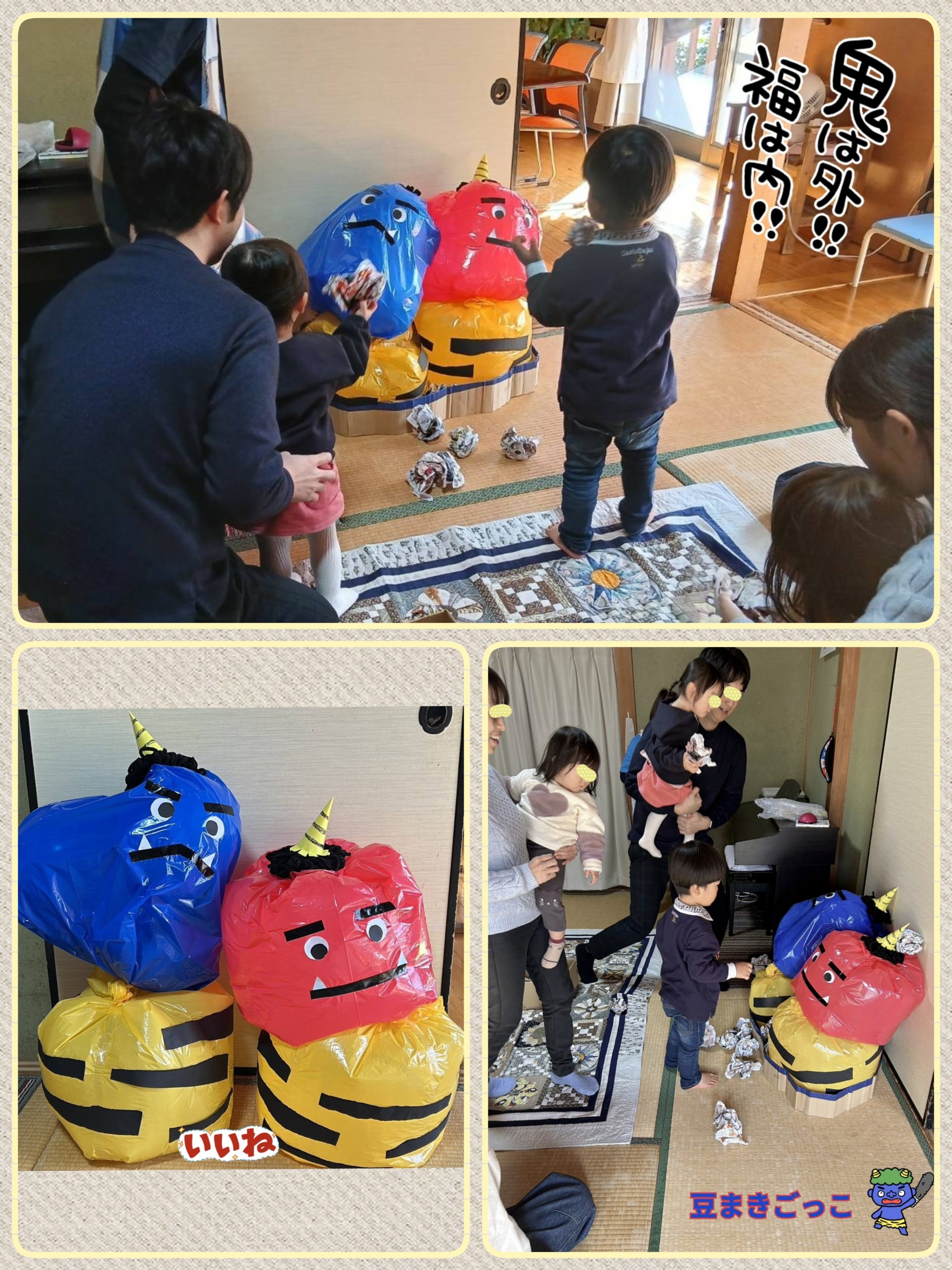 おにのパンツ♪やグーチョキパー♪のアンパンマンバージョンなど手遊びやふれあい遊びでからだをほぐして、「豆まきごっこ」!チラシを丸めて「おにはーそとー」と思いっきり鬼さんをやっつけました!