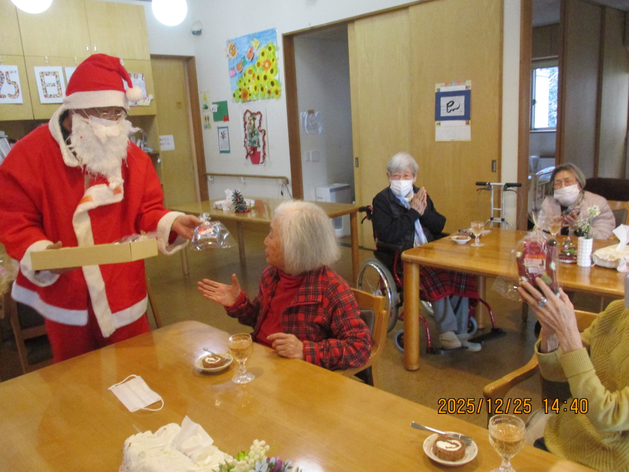 おやつ時間に、シャンメリーでクリスマスの乾杯をした後、なんと本物のサンタさん!と驚くほどのサンタさんが登場!!ご利用者みなさんのプレゼントを届けてくれて、みなさんとても喜んでくださっていました。