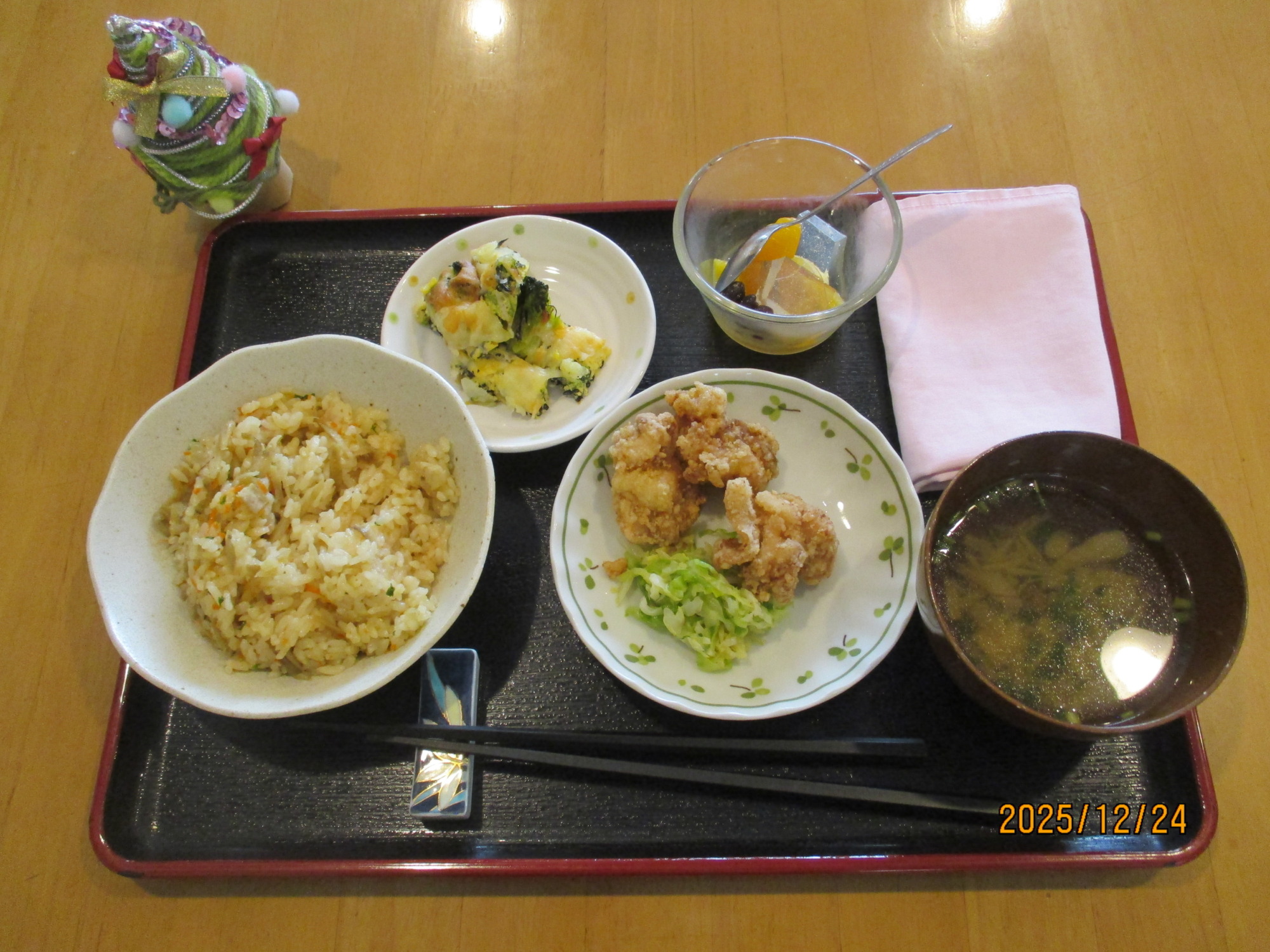 和風ピラフ・鶏唐揚げ・ブロッコリーとひじきのキッシュ・フルーツポンチ・きのこスープでした。