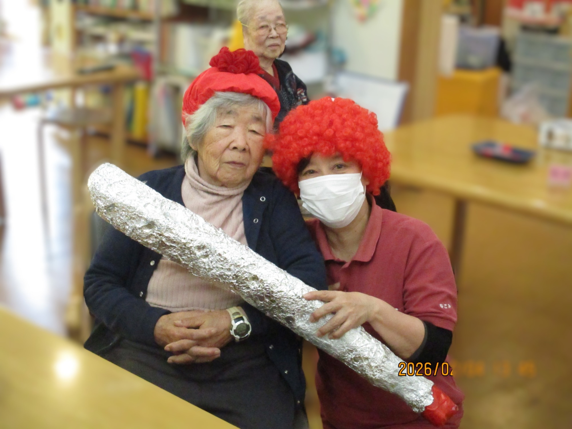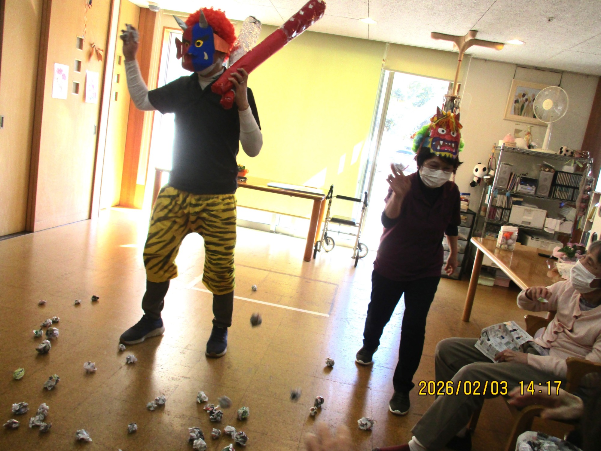 金棒も手作り、豆はご利用者さまも一緒に、ちらしで大き目に作っていただきました。