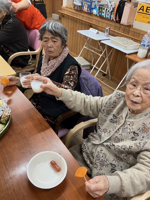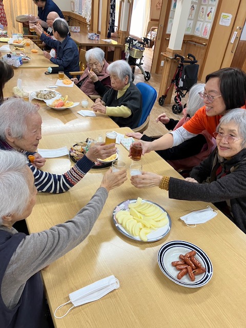 利用者様からの差し入れのリンゴ・ウインナー☆彡大好評!カンパーイ!よくばりました~両手に食べ物・・・口の中にも食べ物カンパーイ!!!