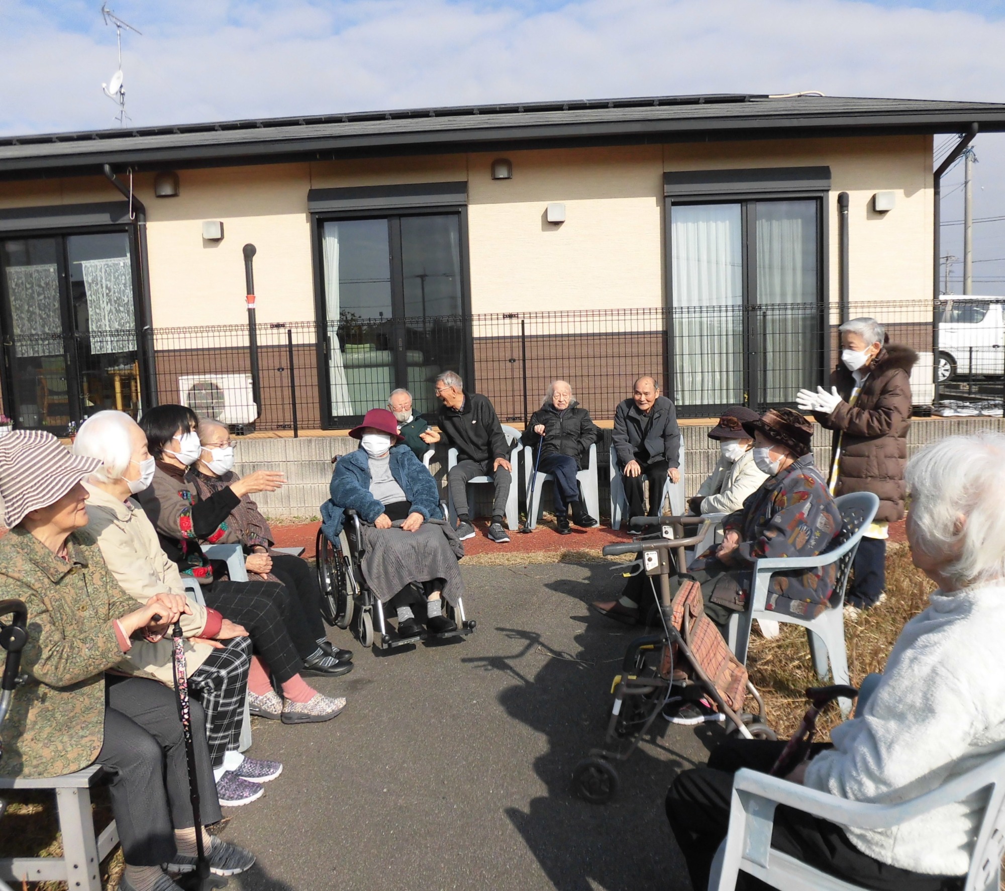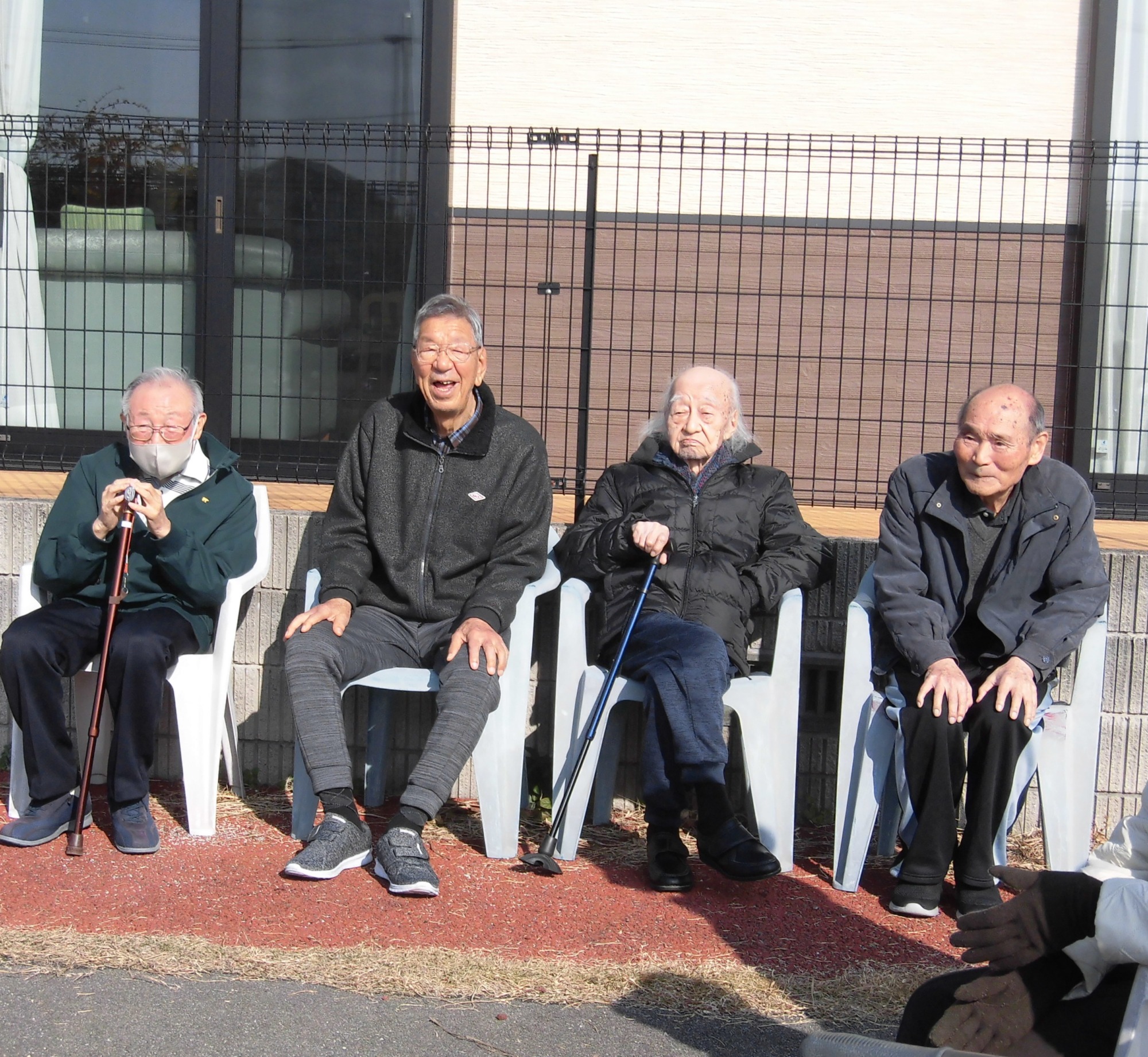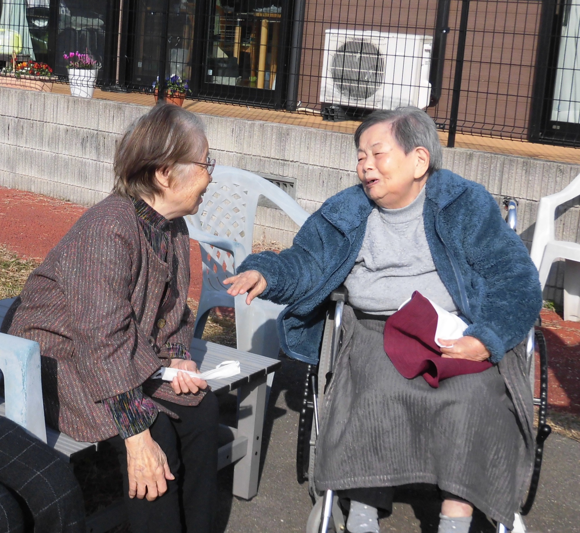 小春日和の日。園庭の出られて、歩いたり、フェンスを利用して立ったり座ったりリハビリをしたり…。そのあとは、イスに座り、ご利用者同士、スタッフと一緒に交流を楽しまれます。