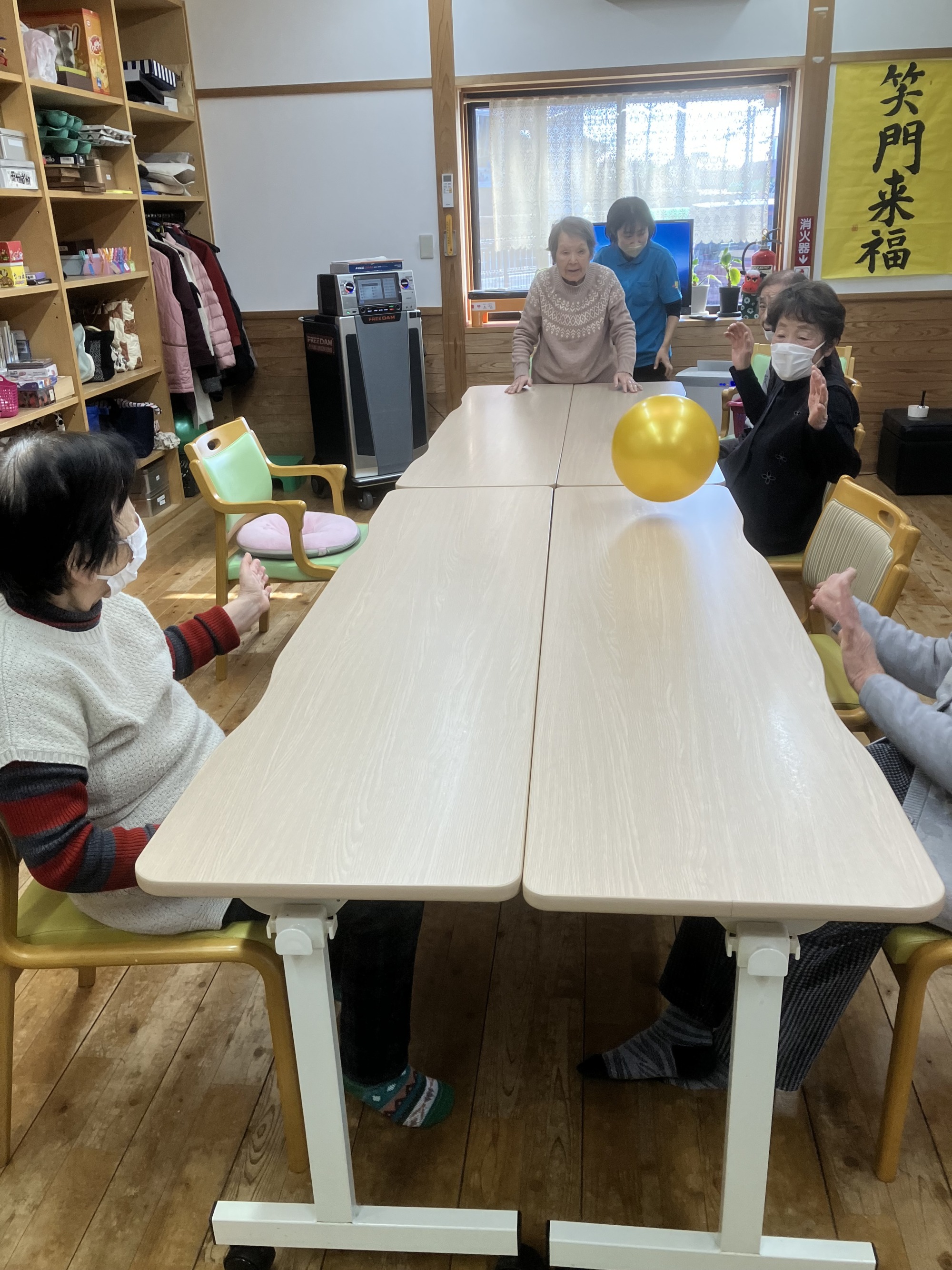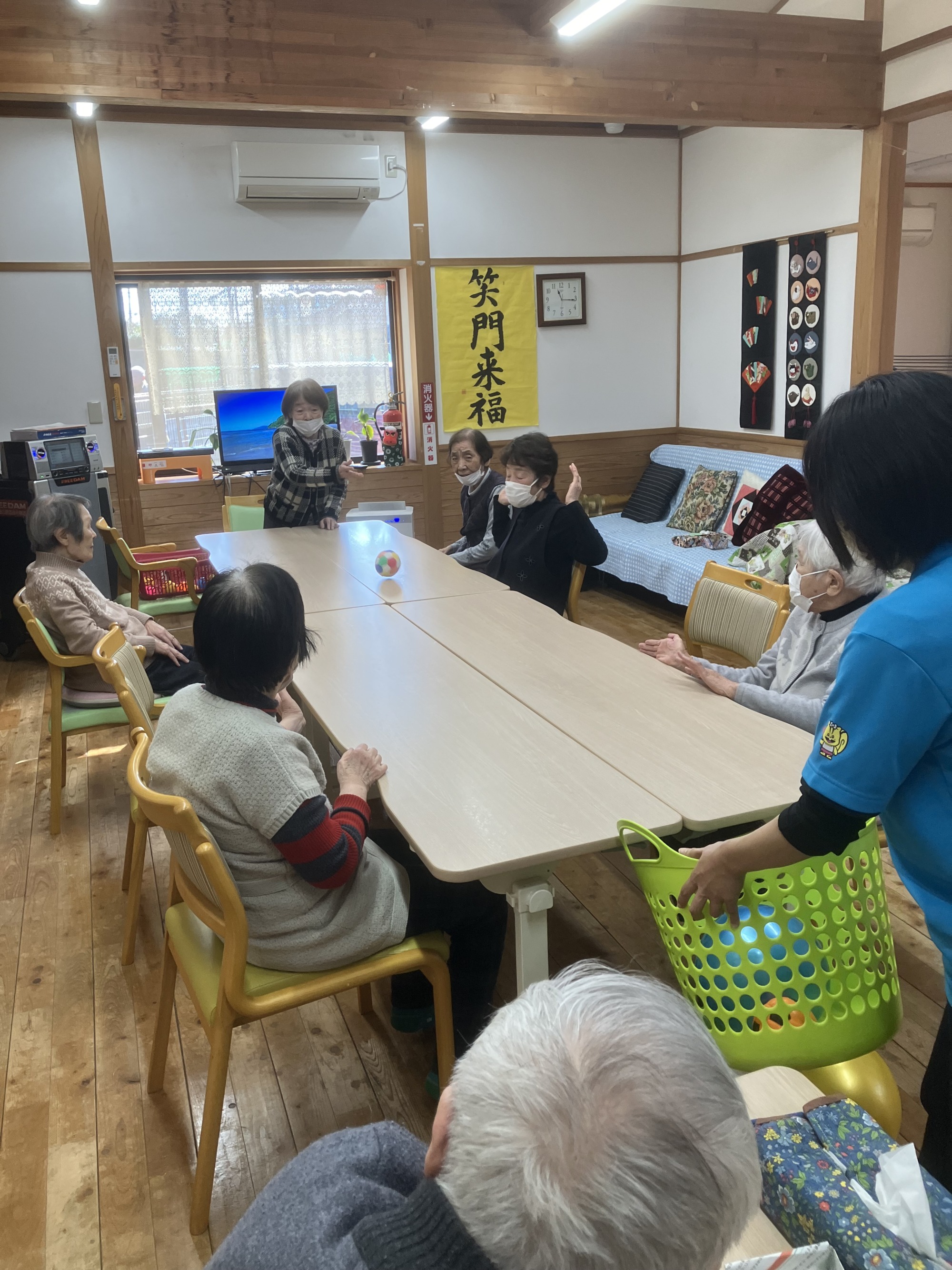 今日はボール転がしと引っ張れゲームをしました。手足を使い筋力の低下を防ぎ、笑うことで気持ちもリフレッシュします
