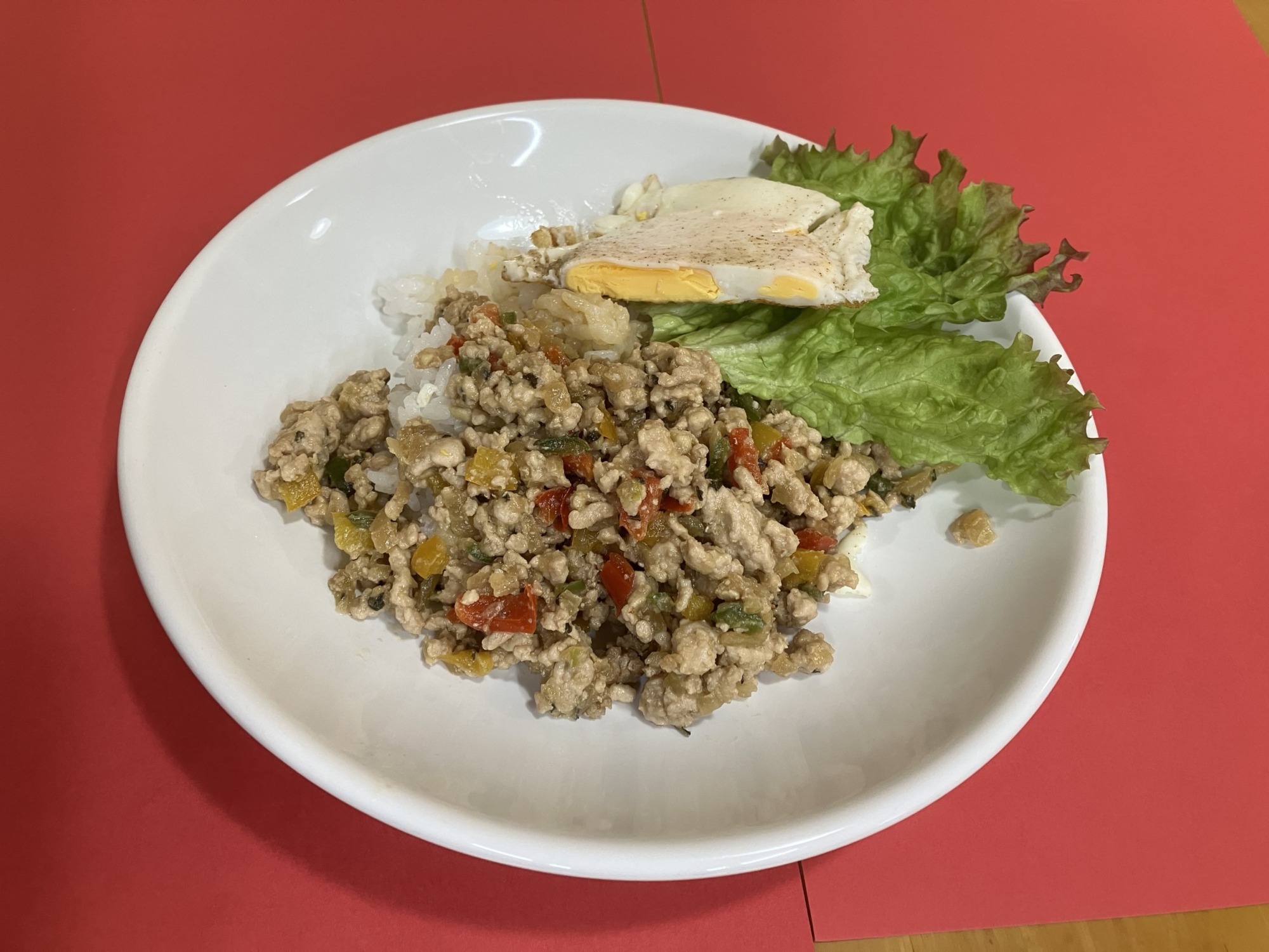 やすらぎの家小倉南の本日の昼食はガパオライス、目玉焼き、ツナサラダ、ヨーグルト、スープです