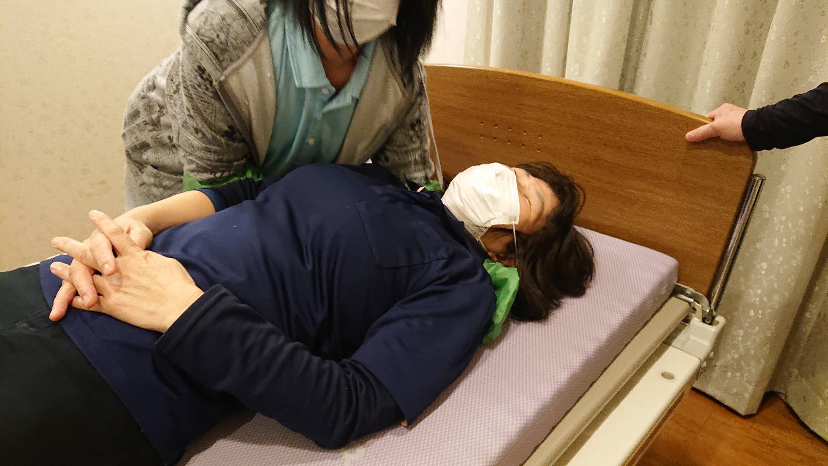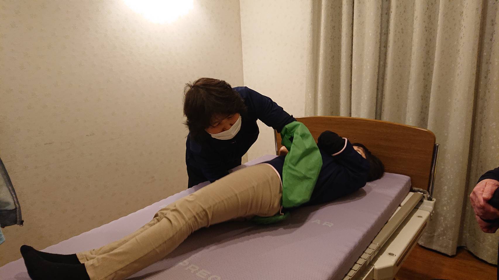 スライディンググローブを使ったベッド上での移動の練習をしました。