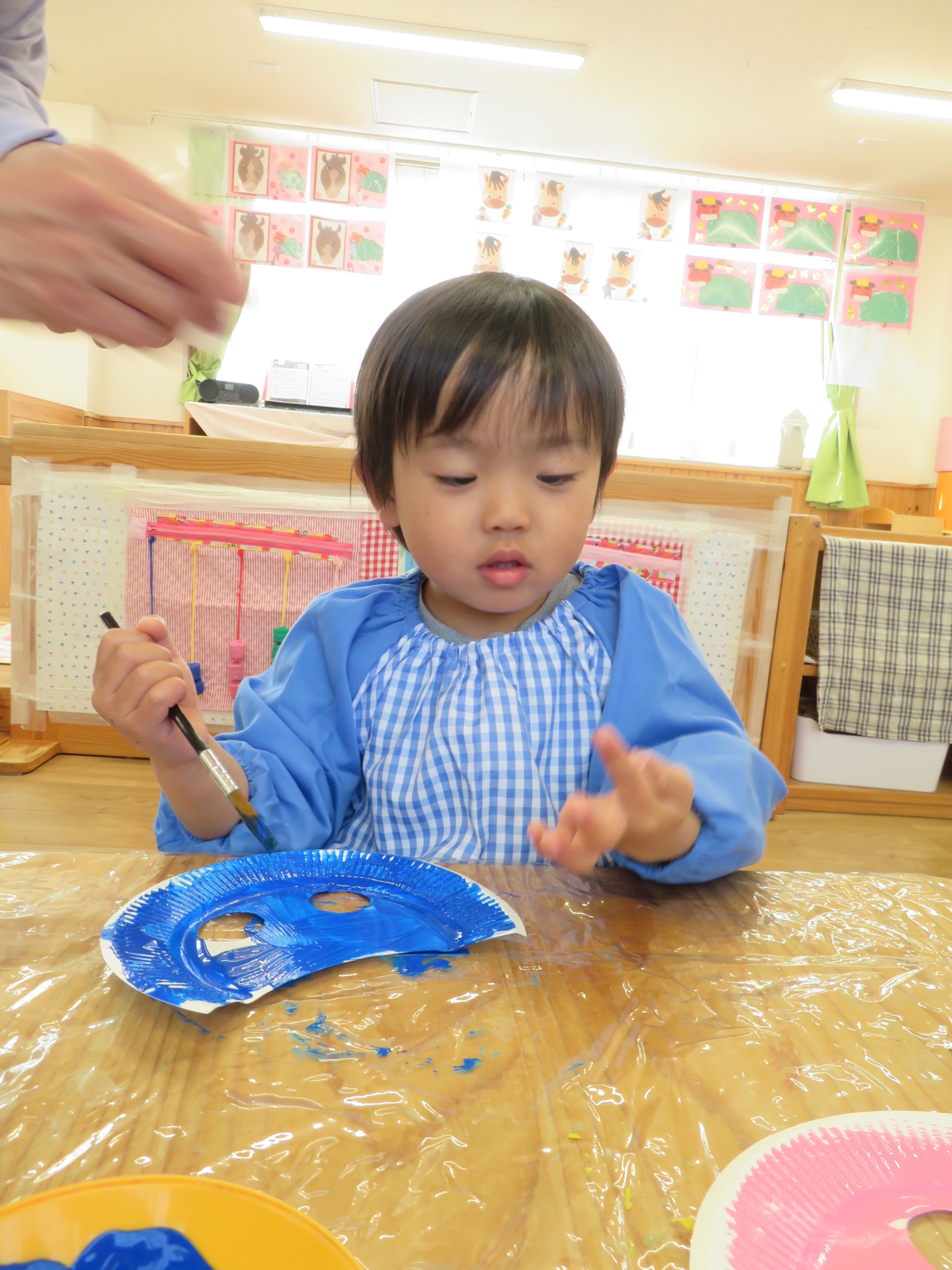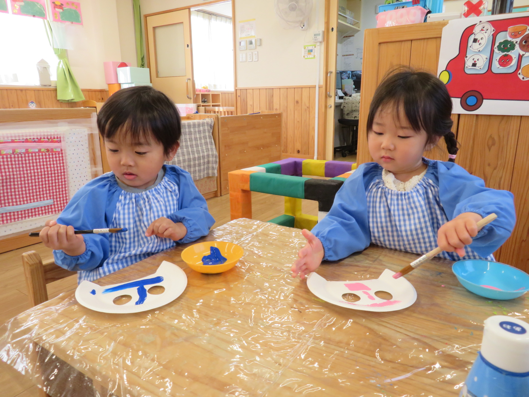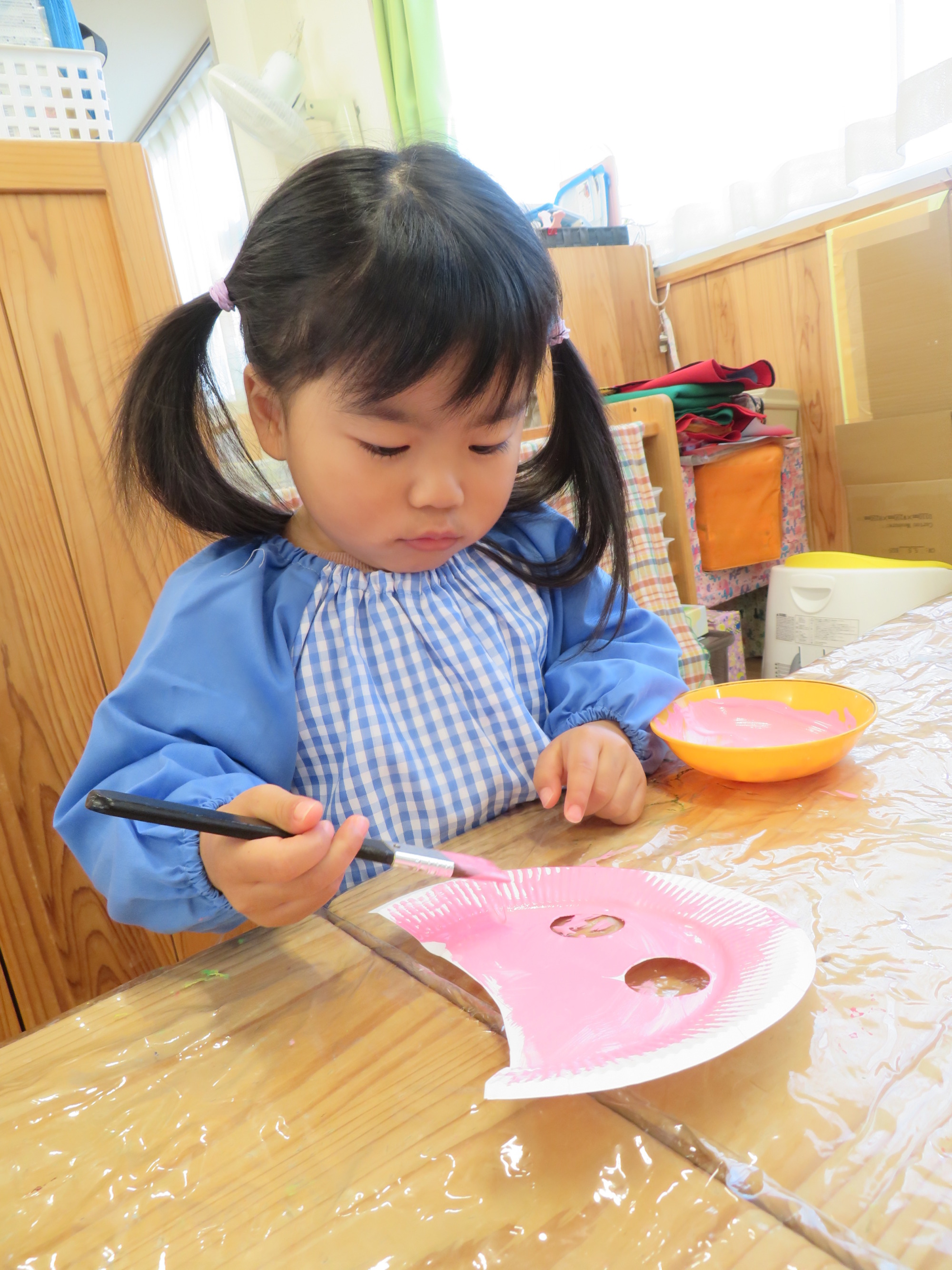 今日は豆まきの時につけるお面に色を付けていました🎶