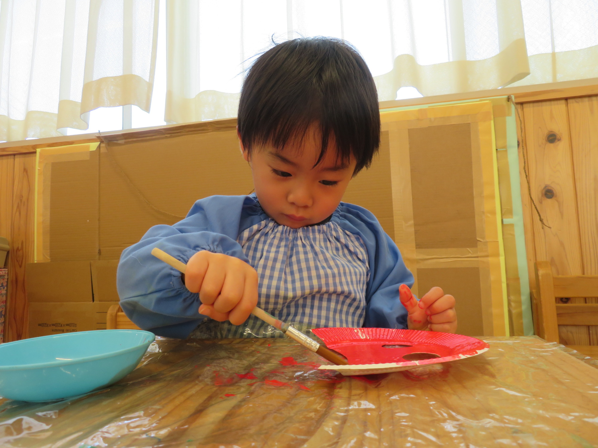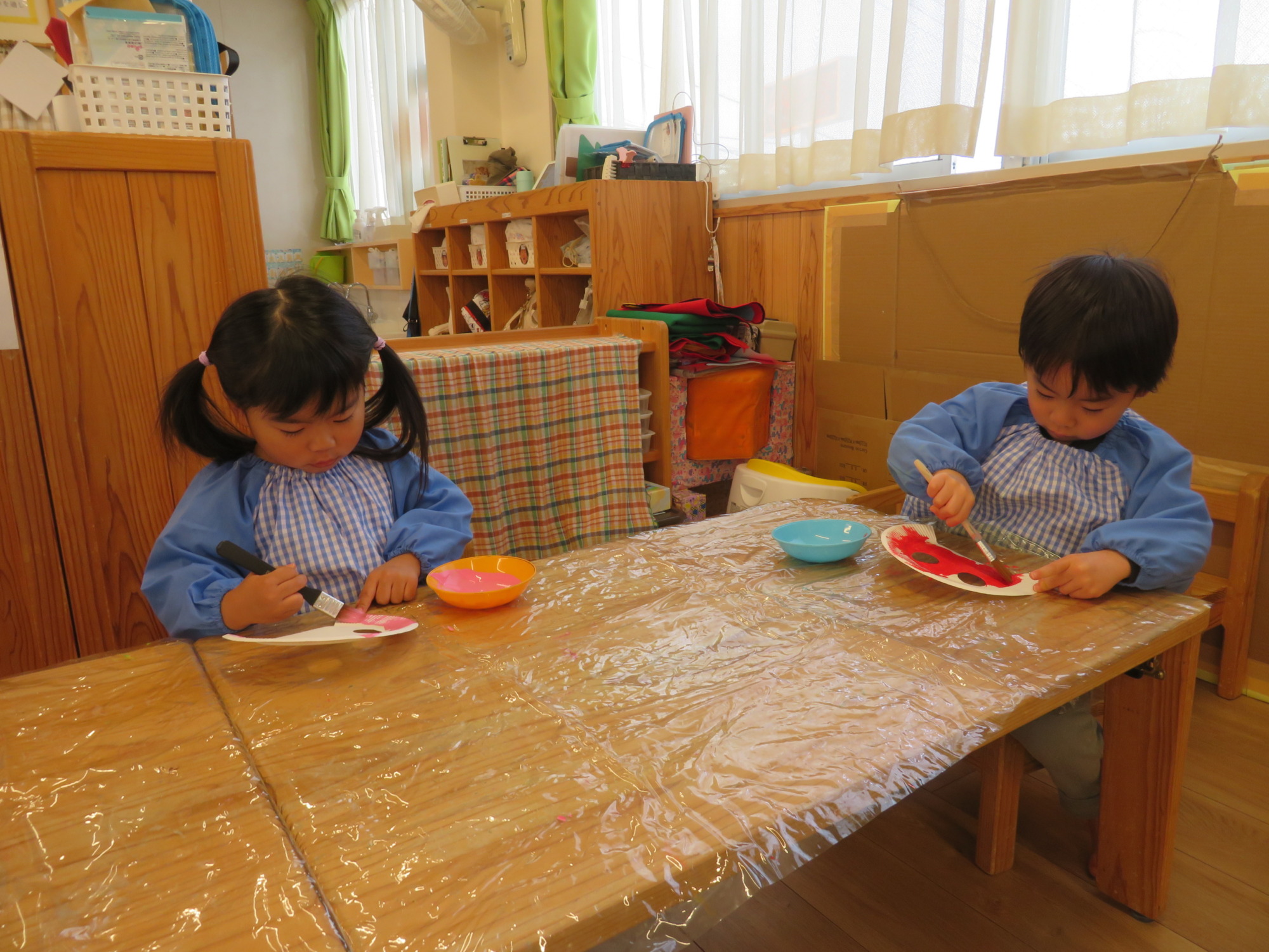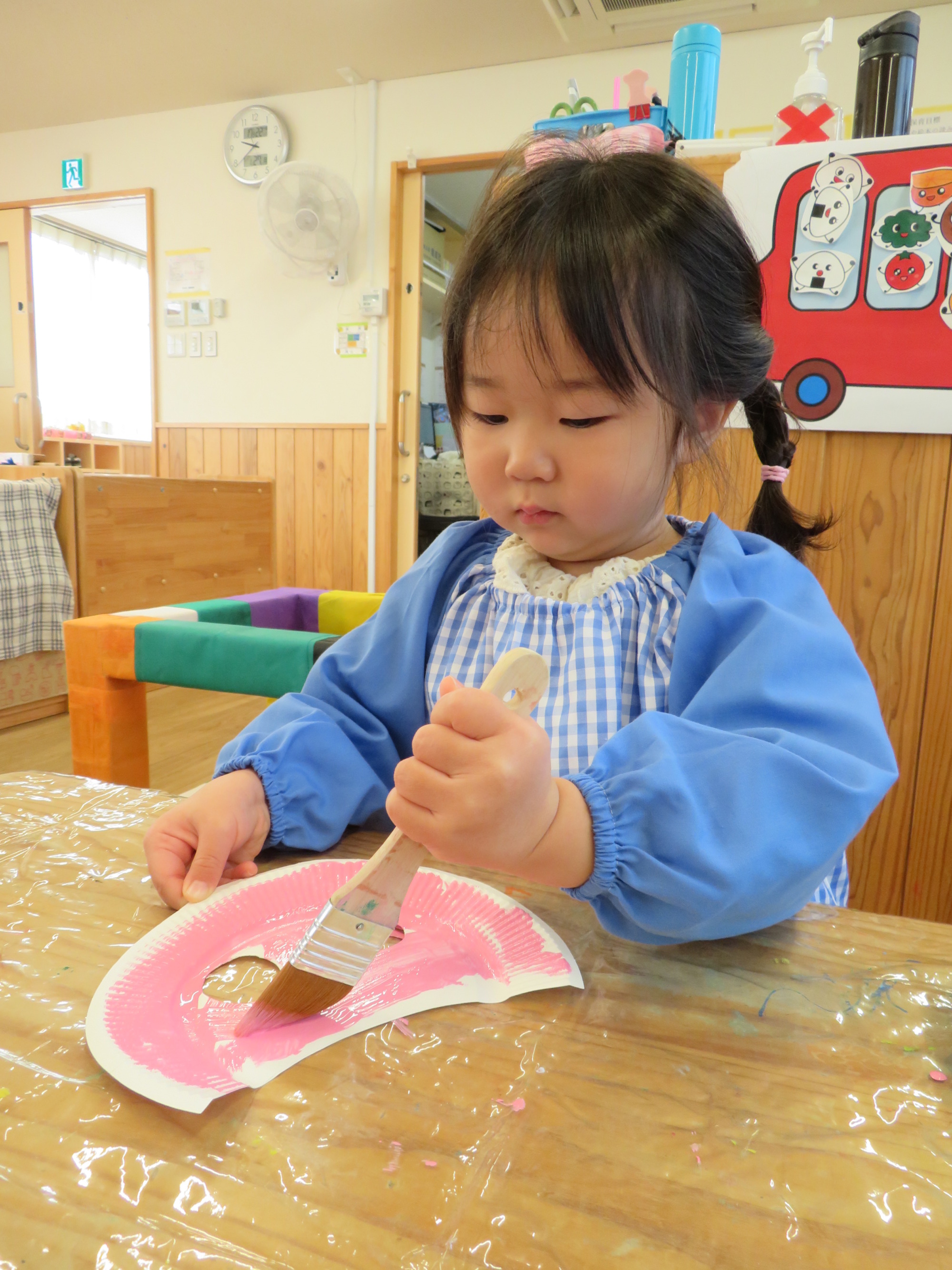 今日は豆まきの時につけるお面に色を付けていました🎶