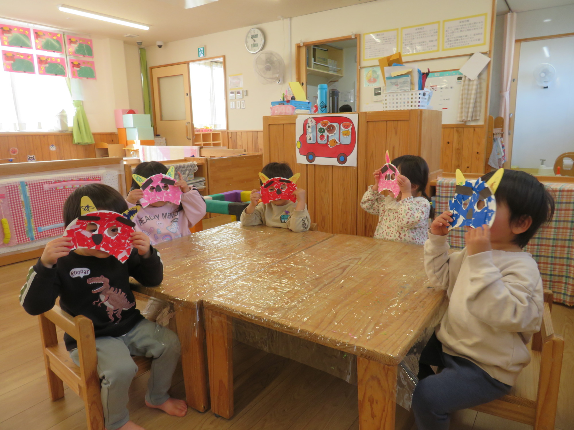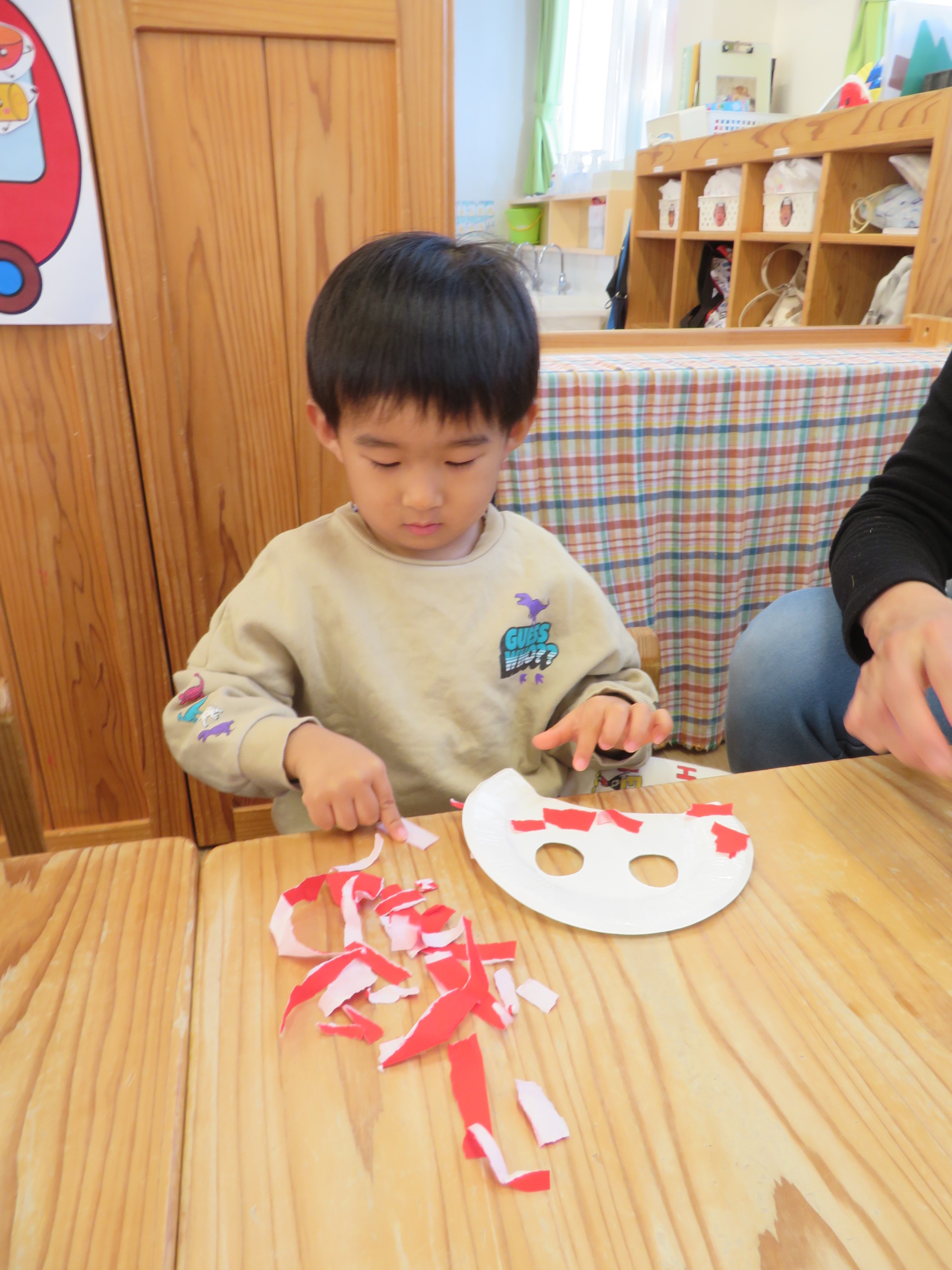 好きな色の折り紙をのりでぺたぺた貼っていきます👹