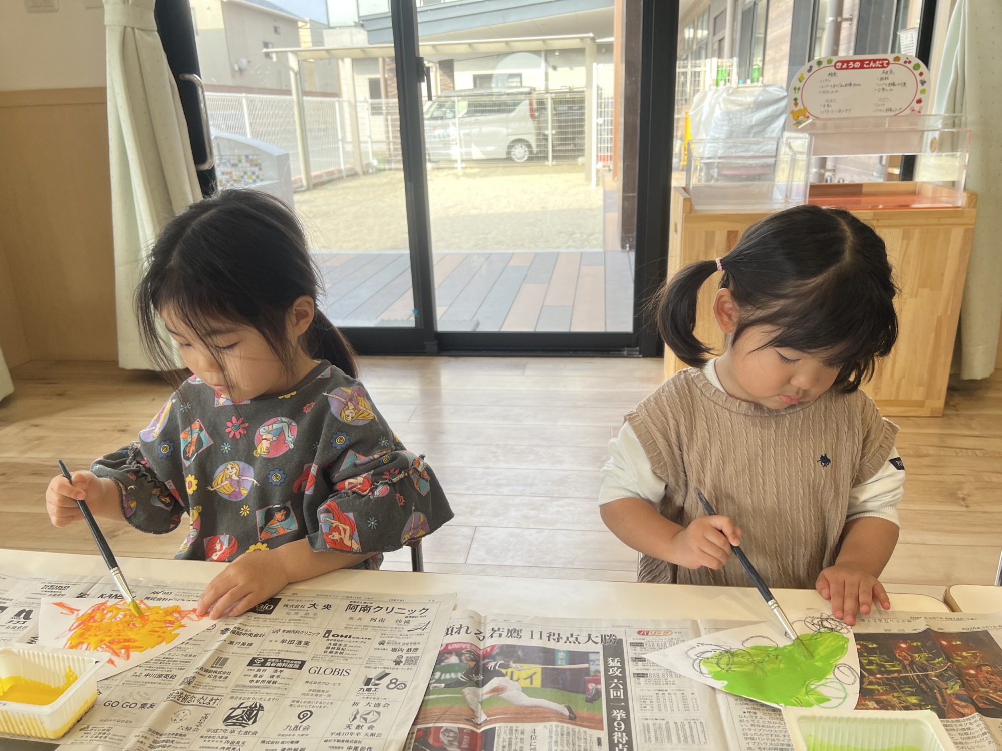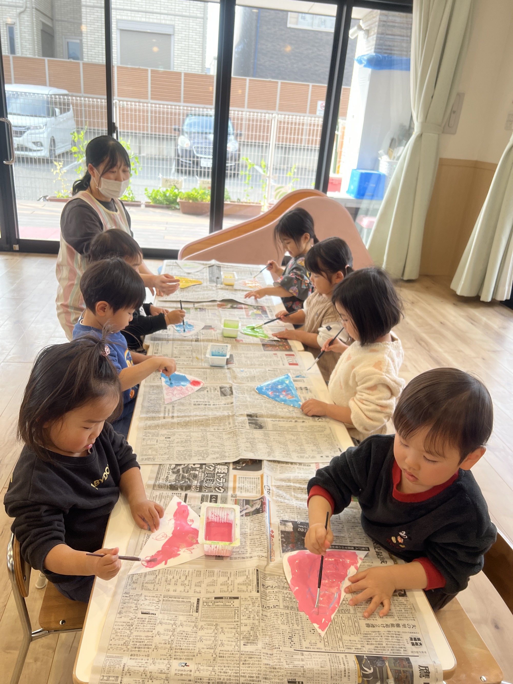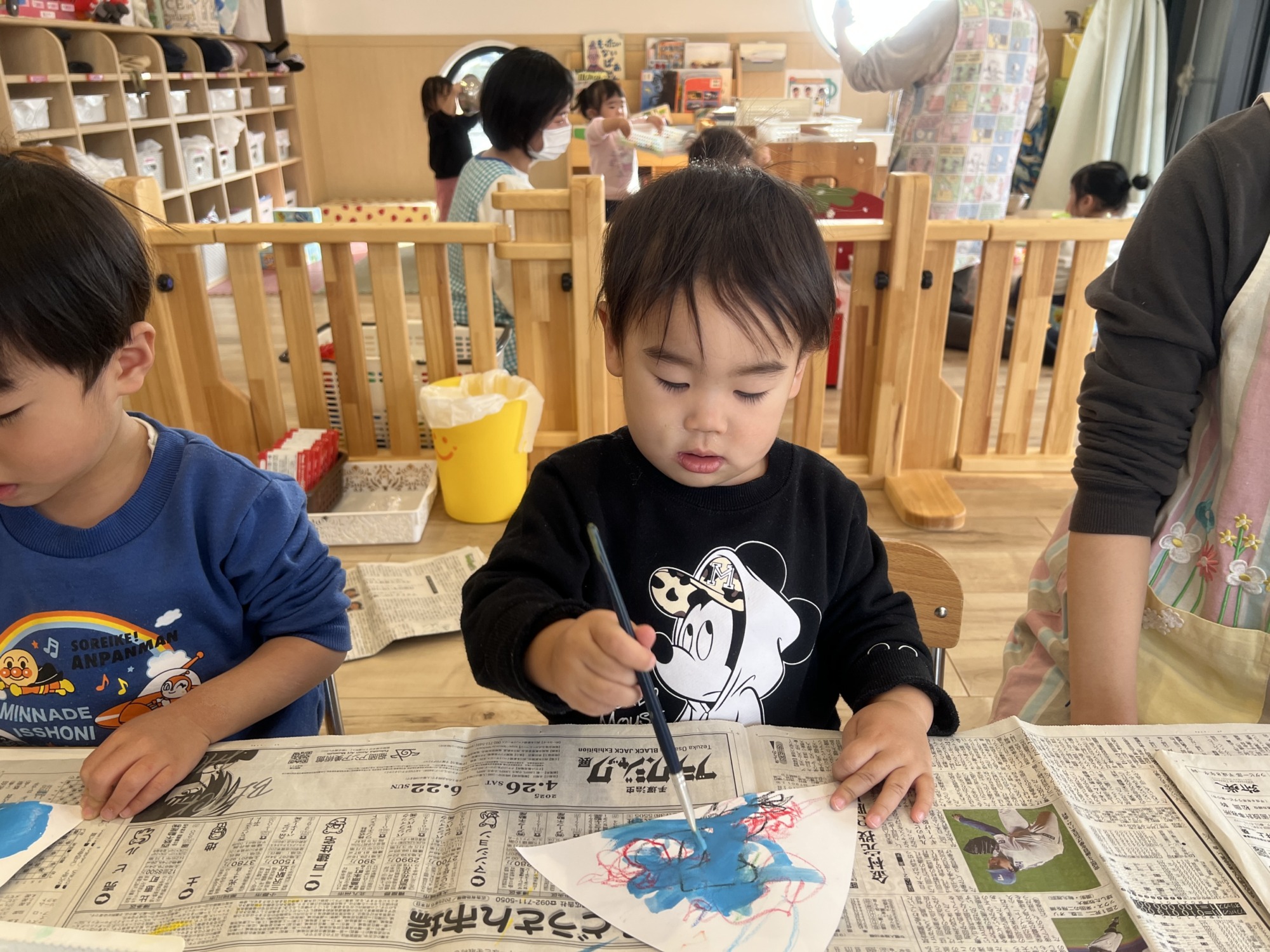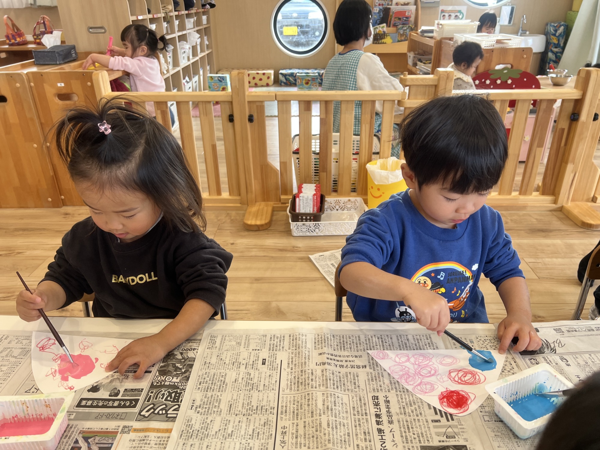 はじき絵は好きな色を選んで、台紙の白い所が見えなくなるまでたーっぷり絵の具を塗っていた子どもたちです☆