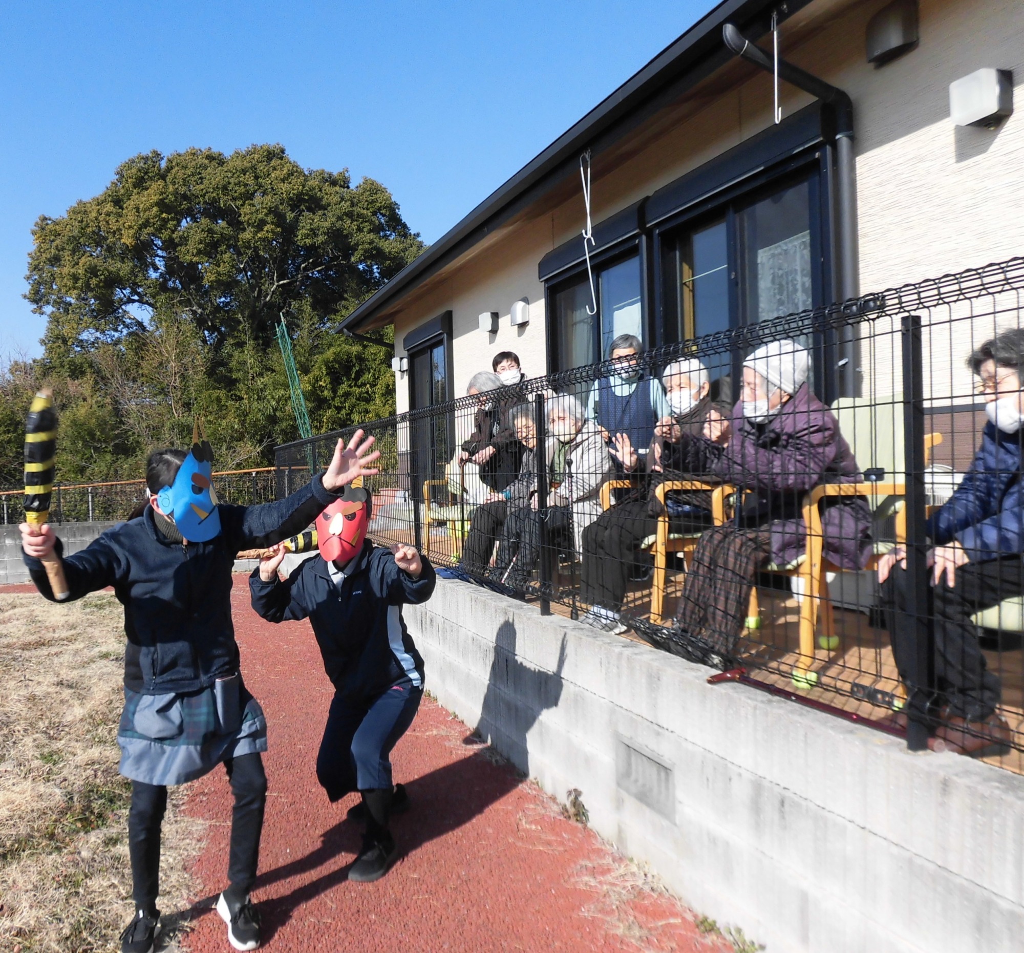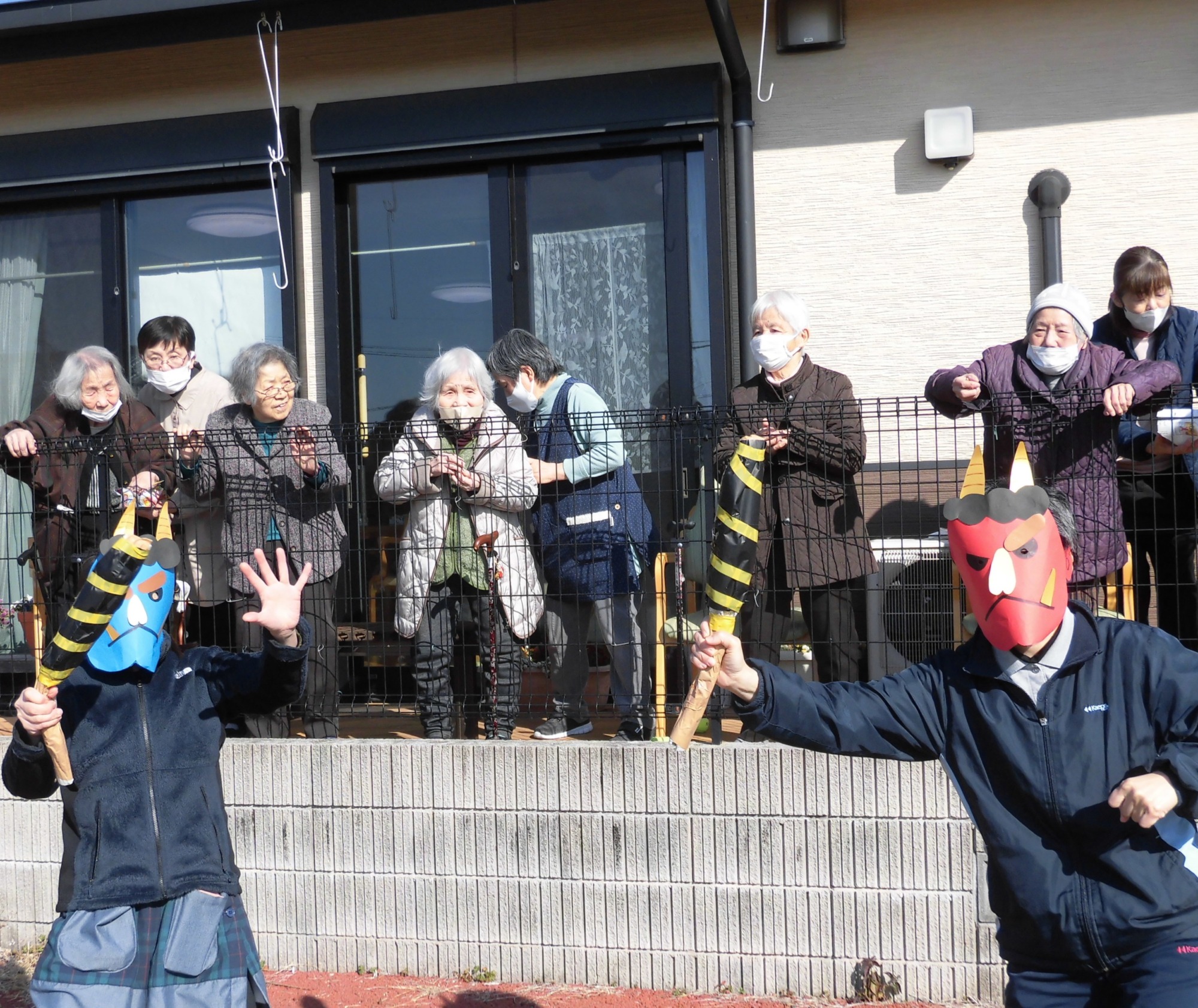 2月3日と4日に、節分の豆まきを、デイつどいの家柳川の園庭とテラスで行いました