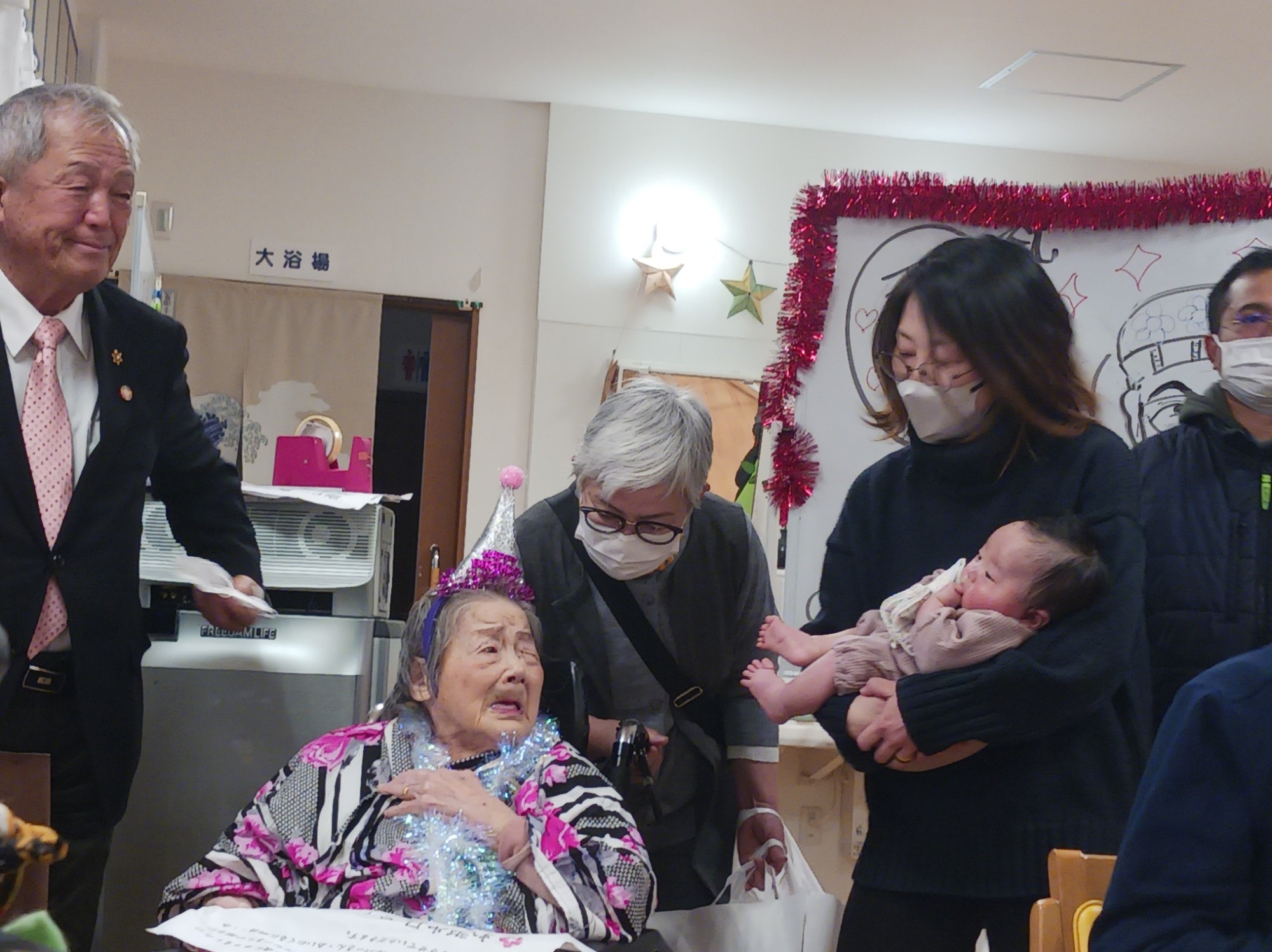 姪御さんのお嫁さんが抱っこされている赤ちゃんは、3か月です。0歳から100歳までの、微笑ましい風景で、Kさんが愛されていたのがわかります。