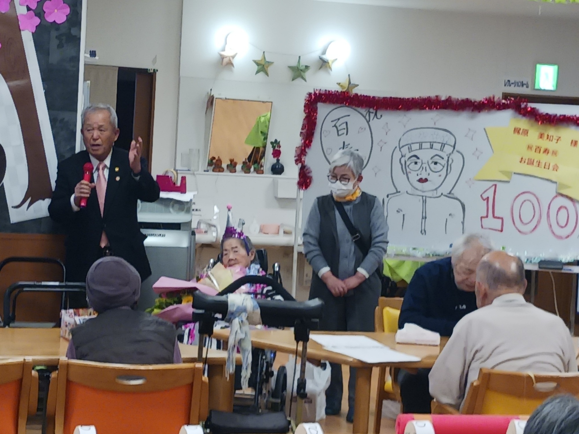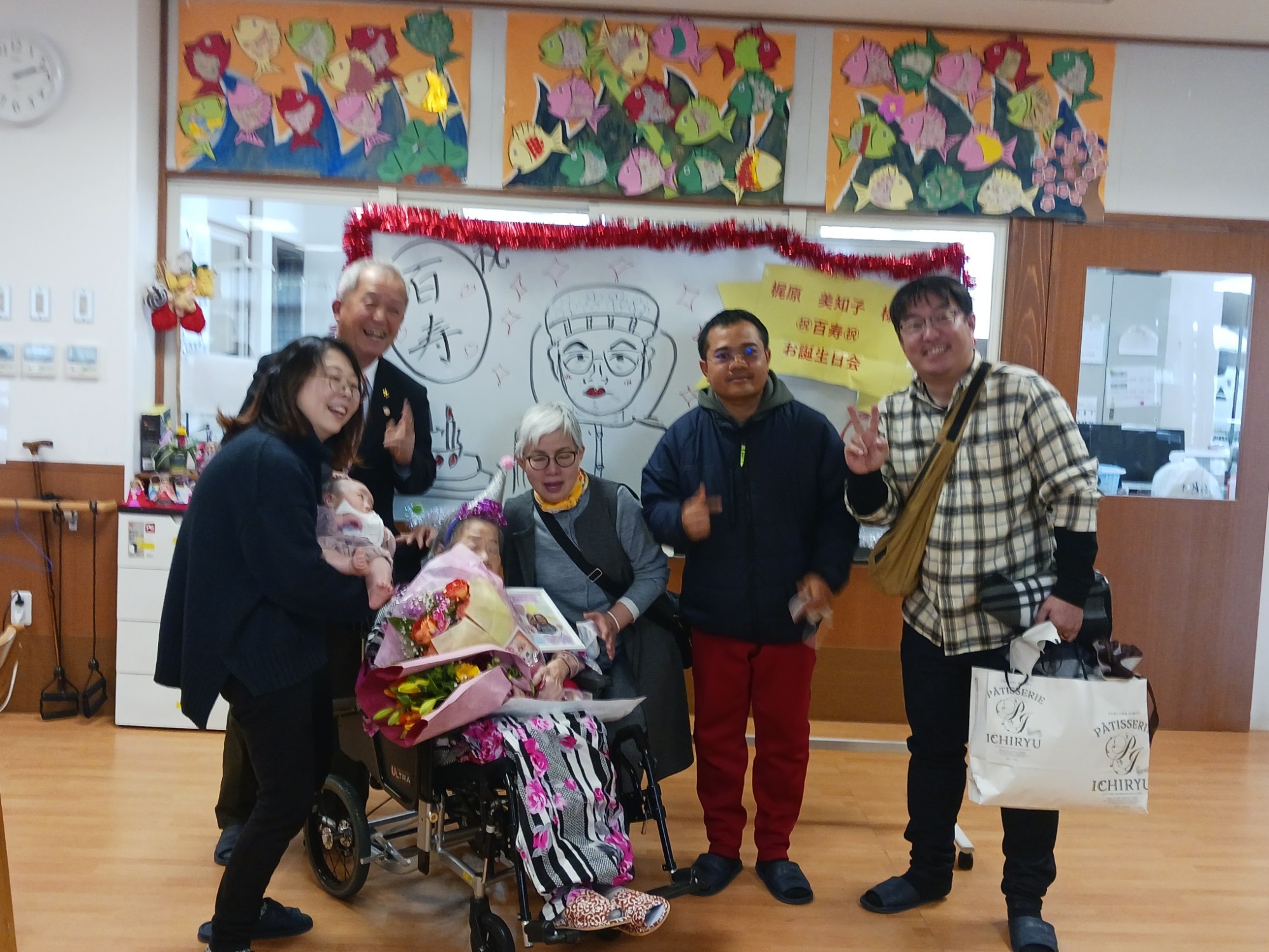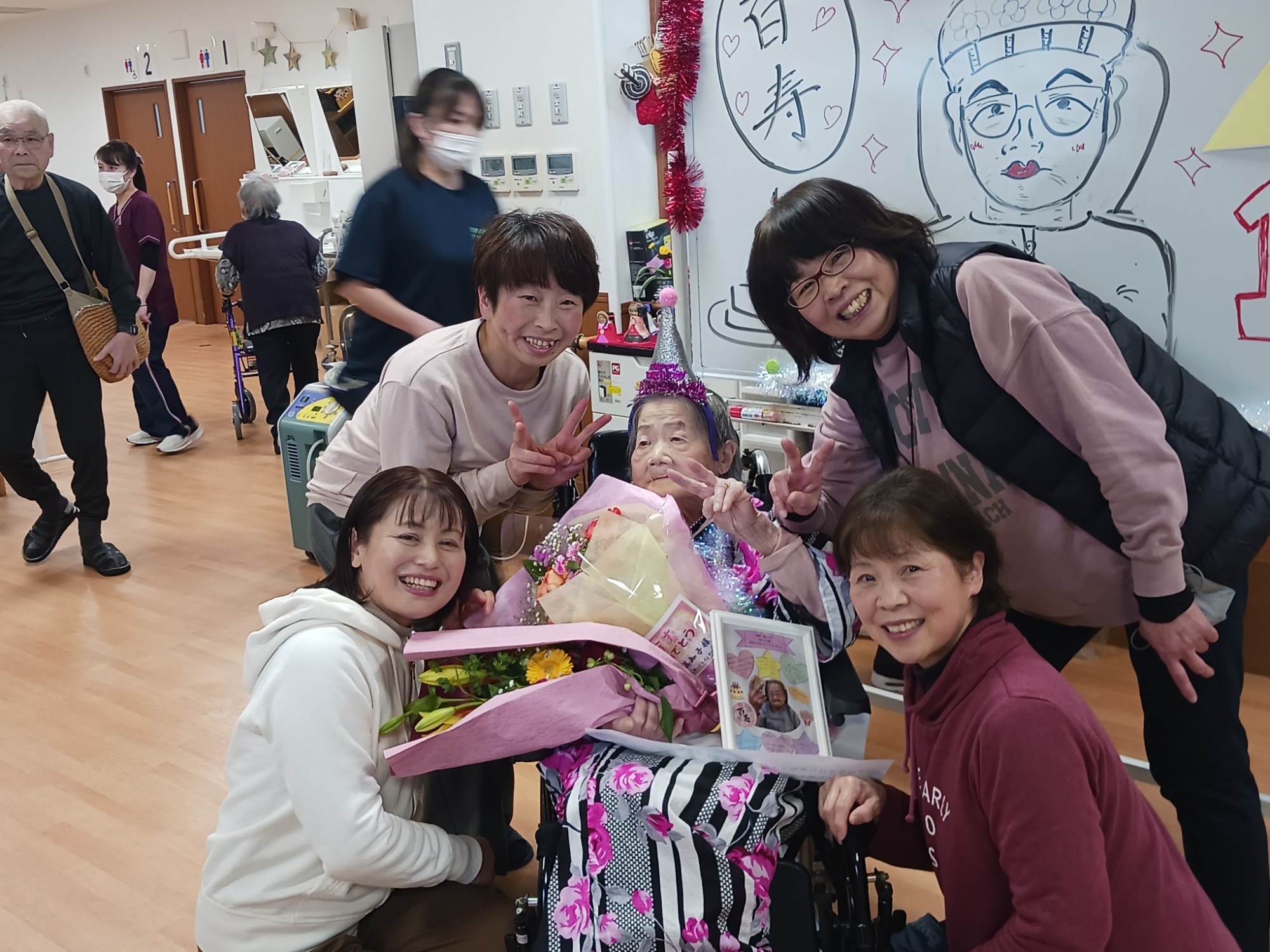 2月5日に住宅型有料老人ホーム「あいのてる丘」に入所のご利用者K様が、デイサービスにて「百寿」のお祝いがありました。