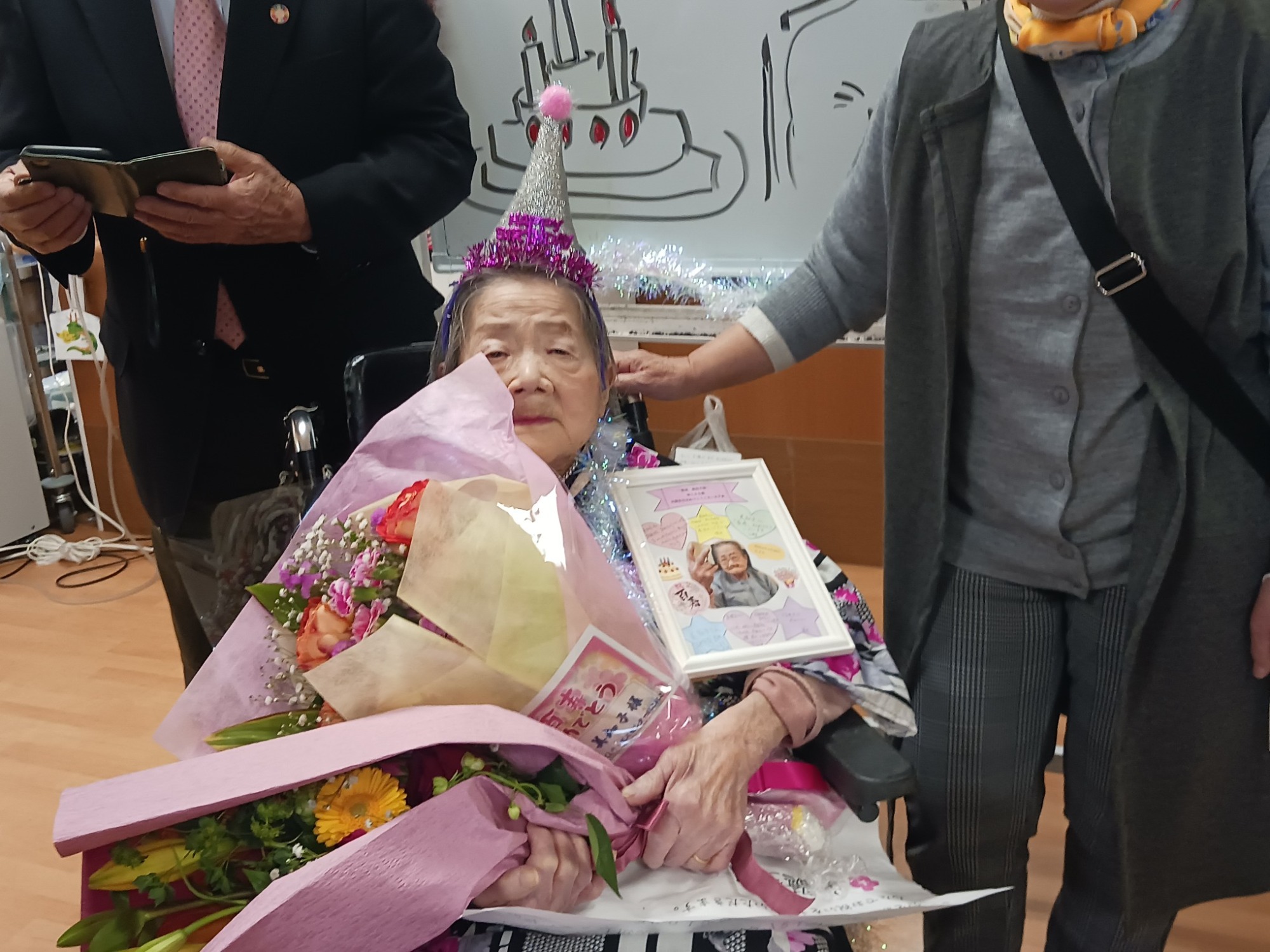 「Kさん。百寿 おめでとうございます!これからもにこにこヘルパーをよろしくお願いいたします。まだまだ長生きしてくださいね」