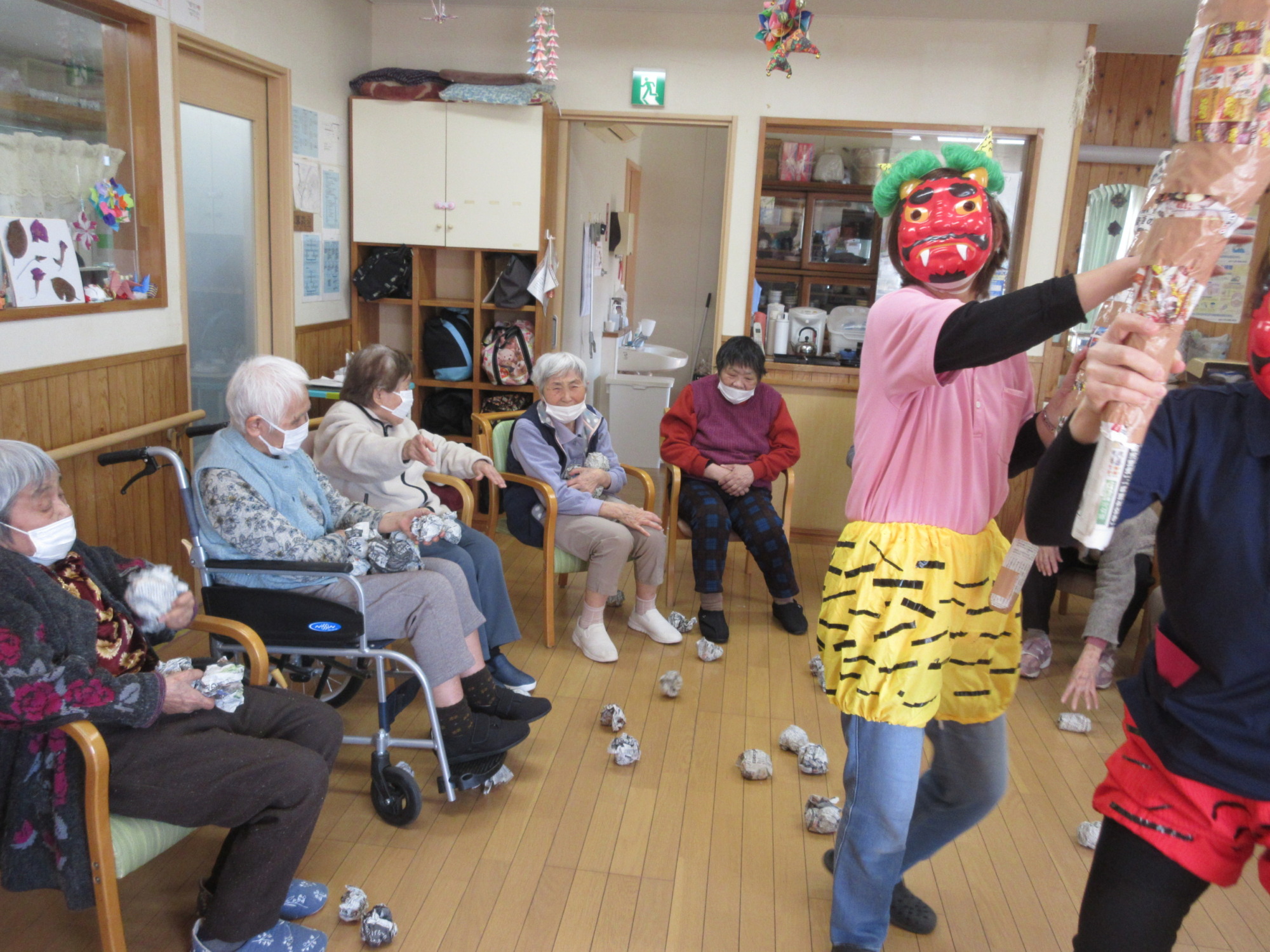 みどりのお家伊敷台でも豆まきならぬ、新聞まきを行いました。