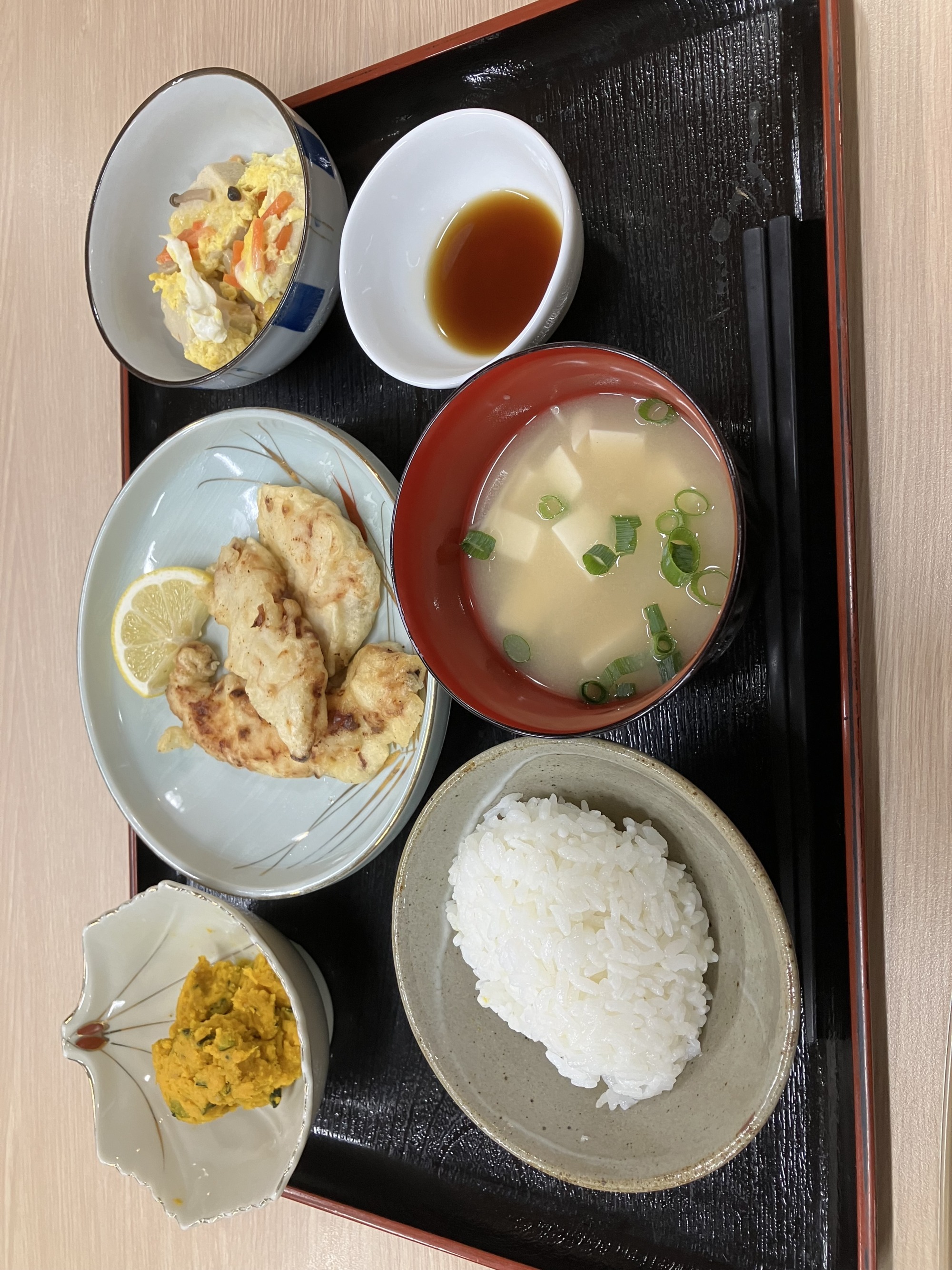 とり天、高野豆腐卵とじ、かぼちゃ味噌煮