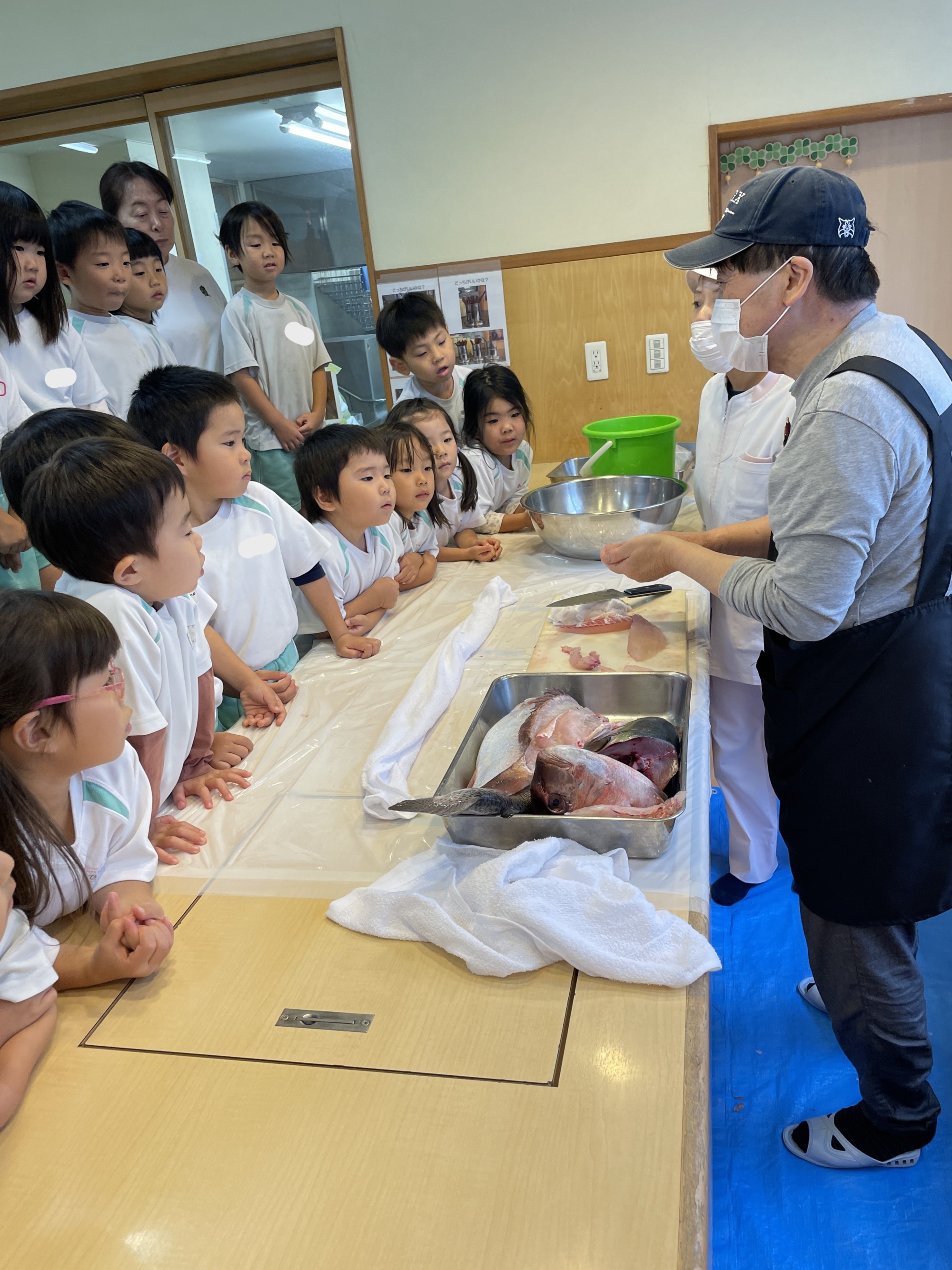 「おいしそうだね」「おさかなやさん、すごいね」と感じたことをつぶやきながら、興味津々でさばかれていく魚を見ていました。