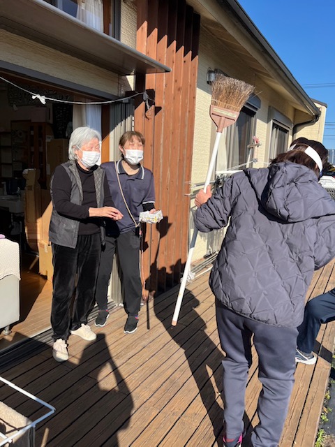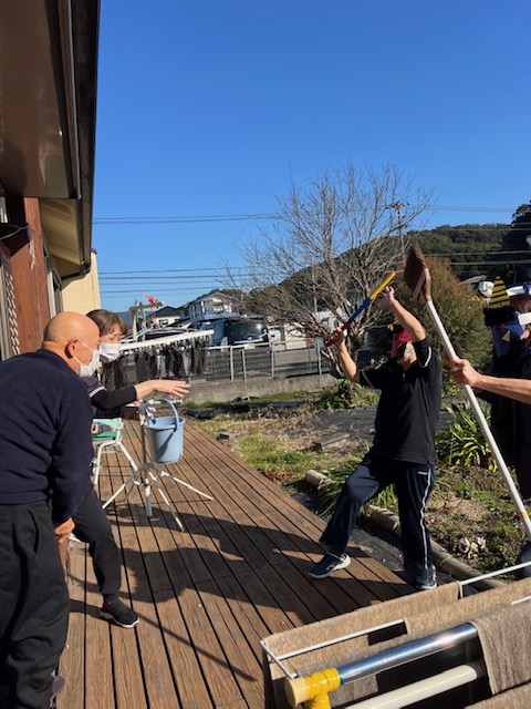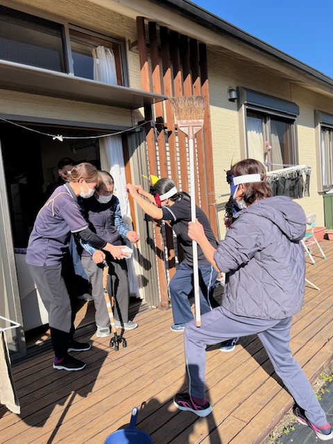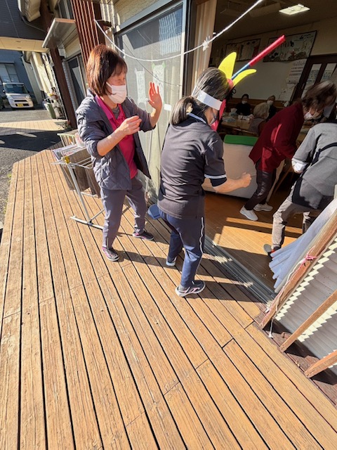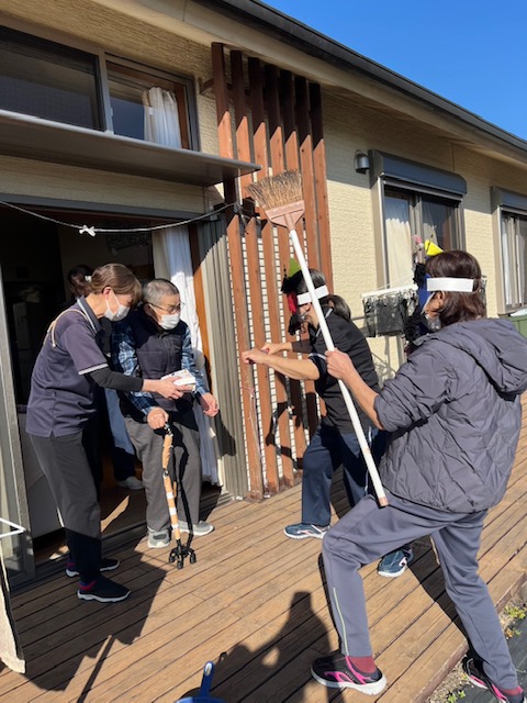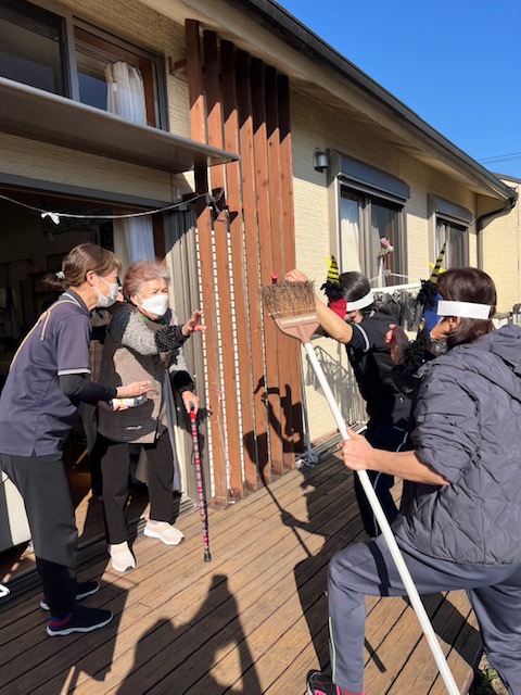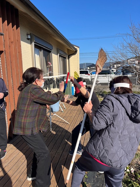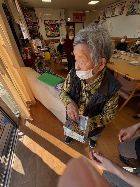 節分の豆まきをしました。皆さんが健康で幸せに過ごせるよう願いを込めて、ご利用者様一人一人豆を外や中に投げてもらい、邪気を払いました。鬼は外~福は内~と