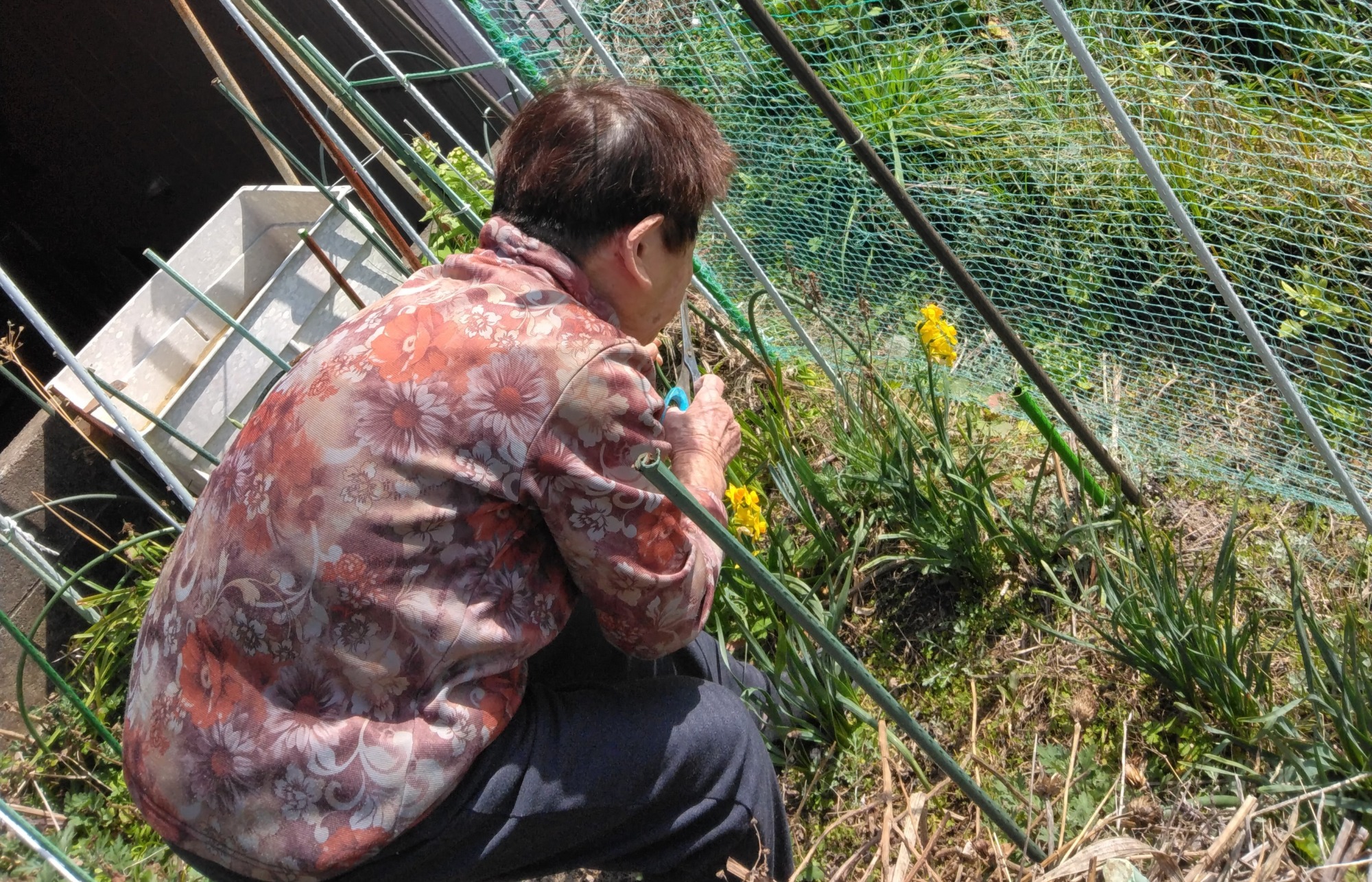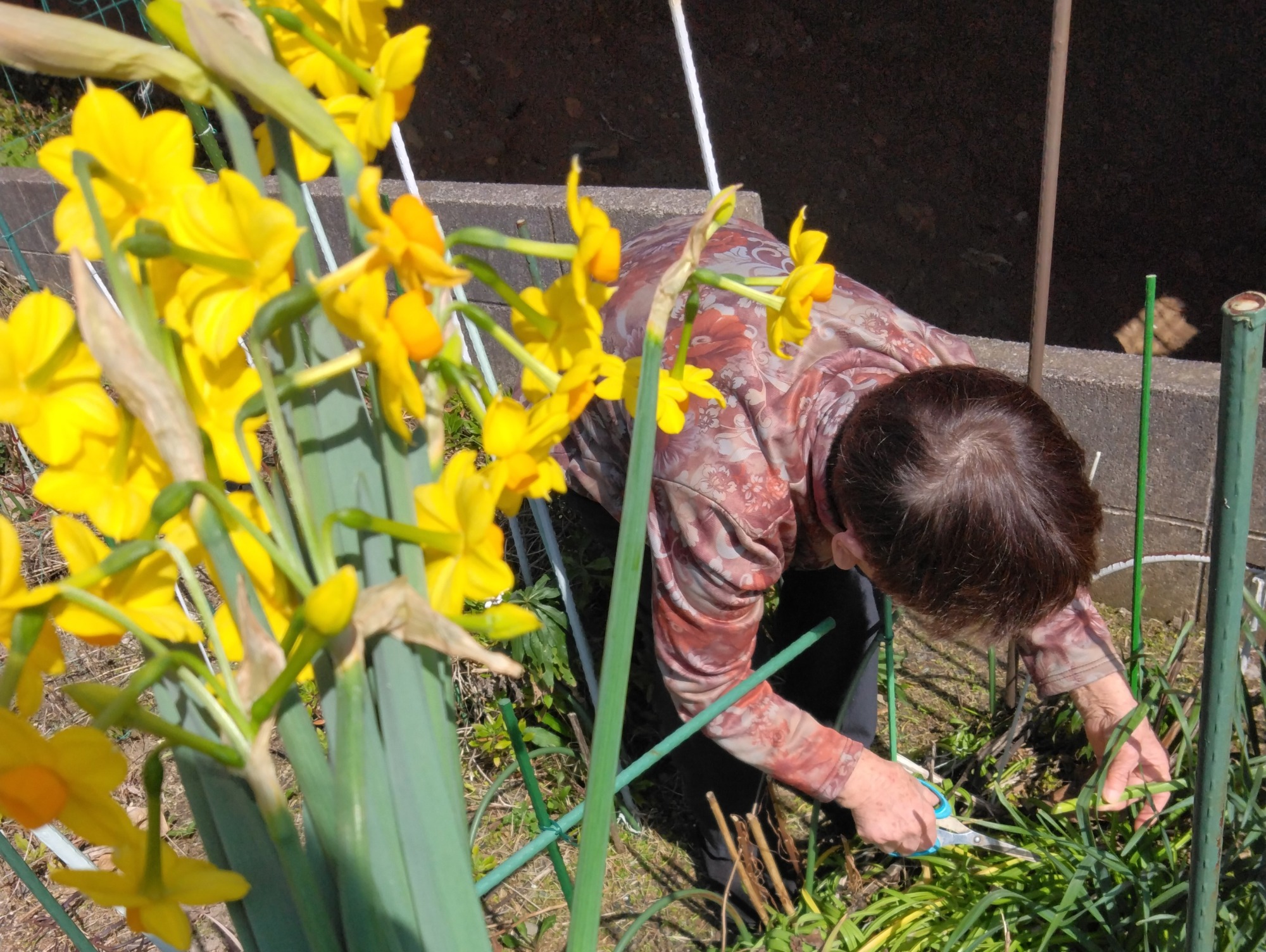 「水仙とってあげるけん持って行かんね~」とのお誘いで一緒に畑に行きました。「足がフラフラして畑も出来んとよ~」と言いつつ、支柱が立つ狭い通路を器用にくぐり抜けたり腰を曲げてかがんだり…その身体機能に驚きでした。