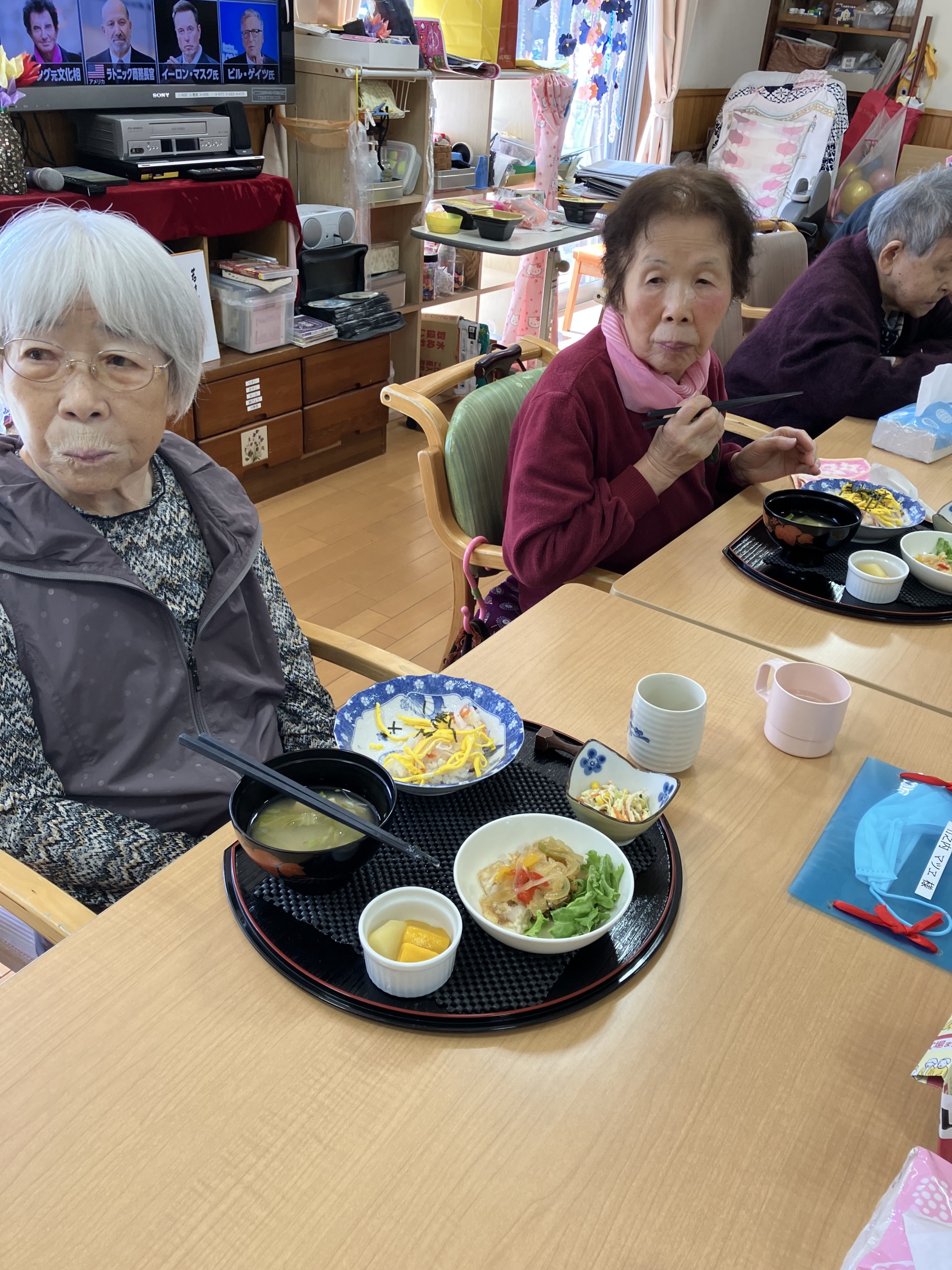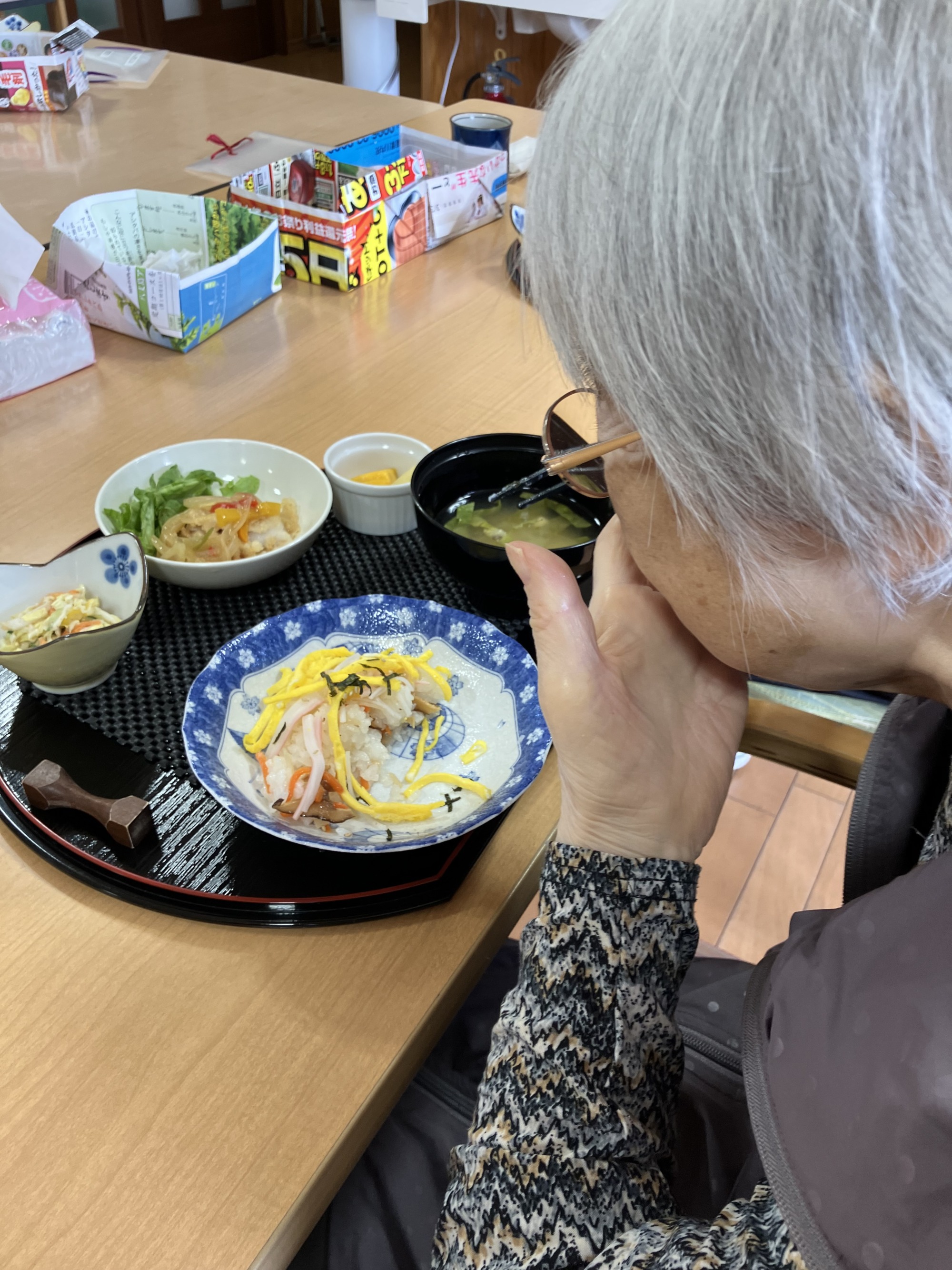 いつもはご飯を少なめに希望される方々にも、今日は少し多めにお出しすると、[ちらし寿司は大好きなのよ]と満面の笑顔で召し上がってくださっていました。召し上がったあとはあちこちから、[美味しかったぁ]との言葉が飛びかいました)^o^(