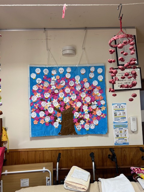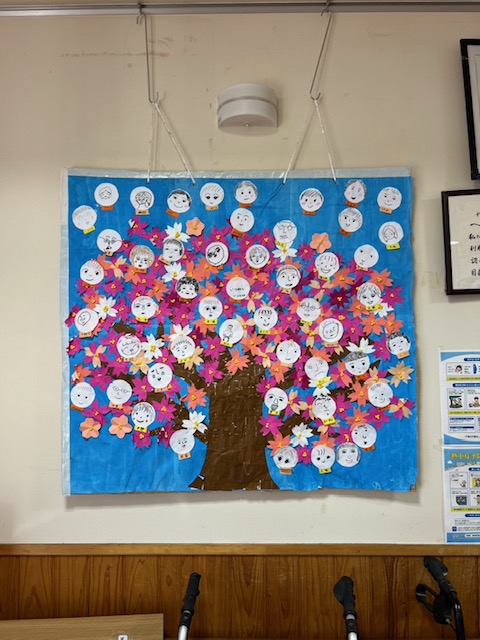 春の壁画は桜です。みんなの顔で桜を満開にしました。ご利用者も職員も思い思いに自分の顔を書き、何故か…皆様自分の顔の特徴を分かっており、そっくりです(^^)